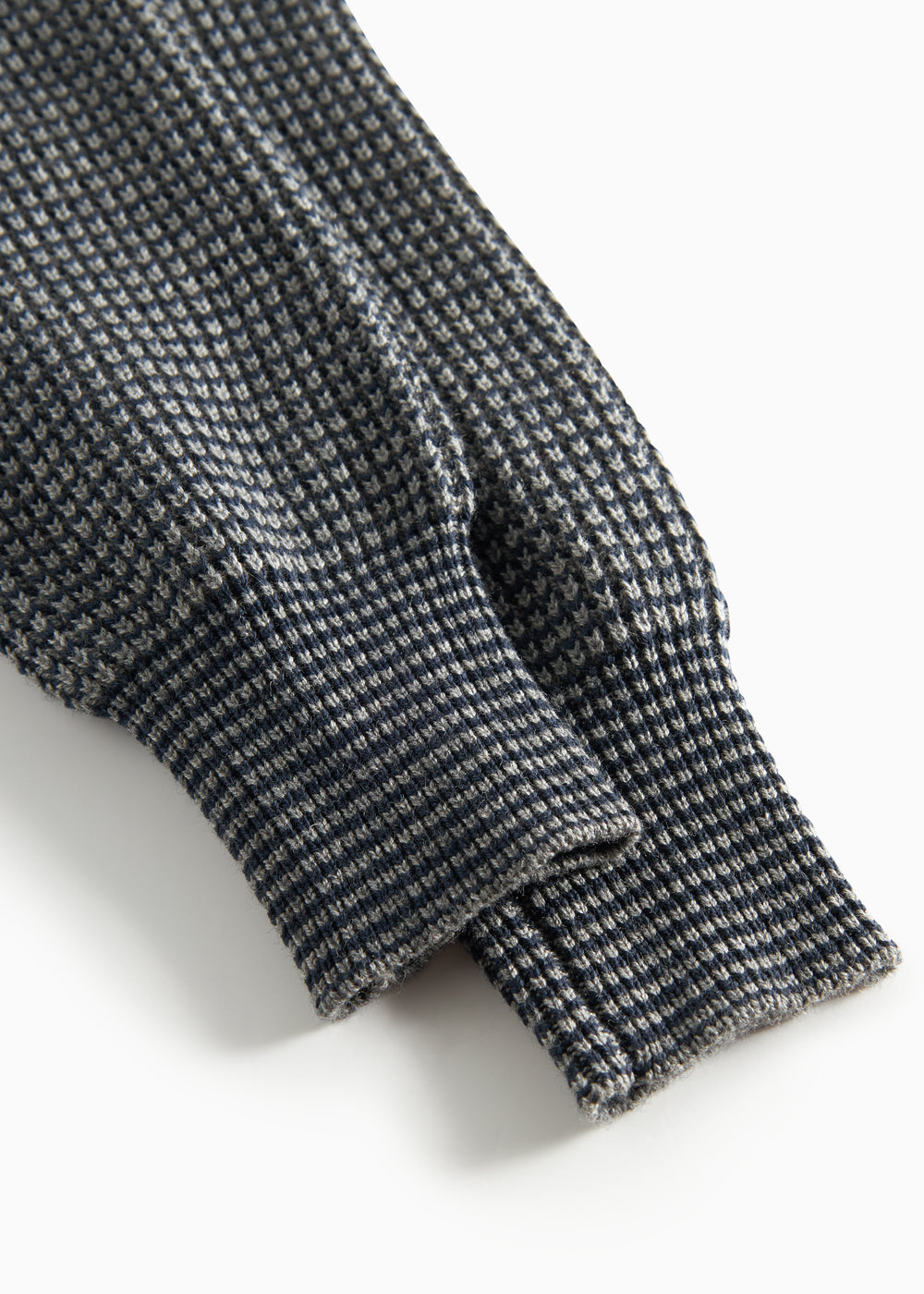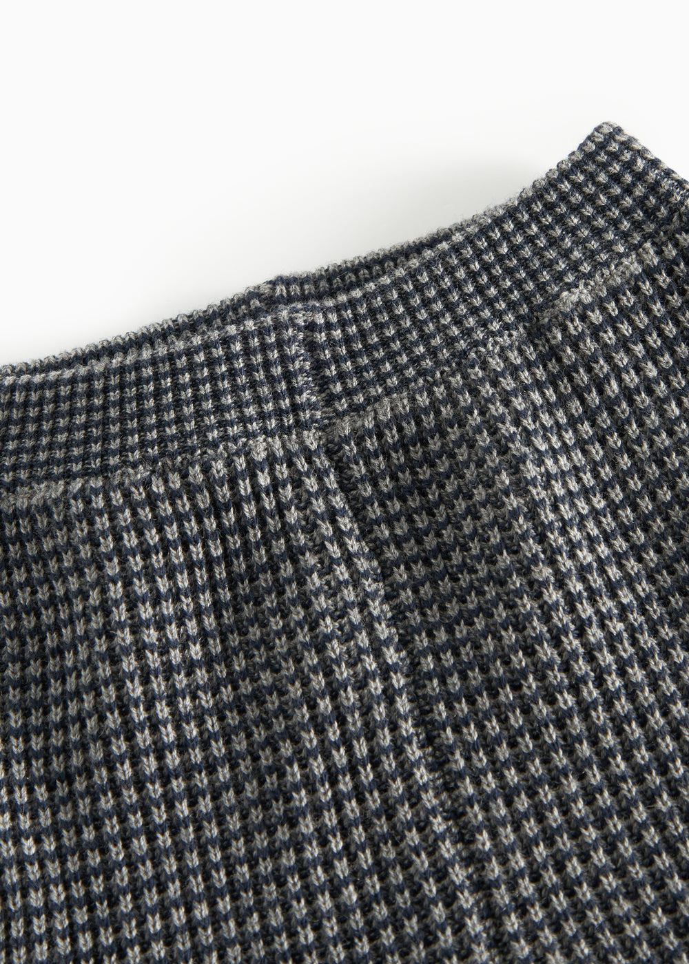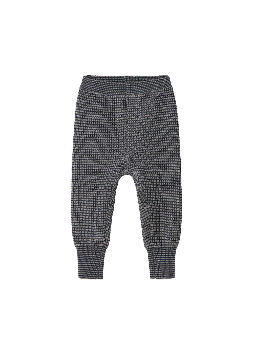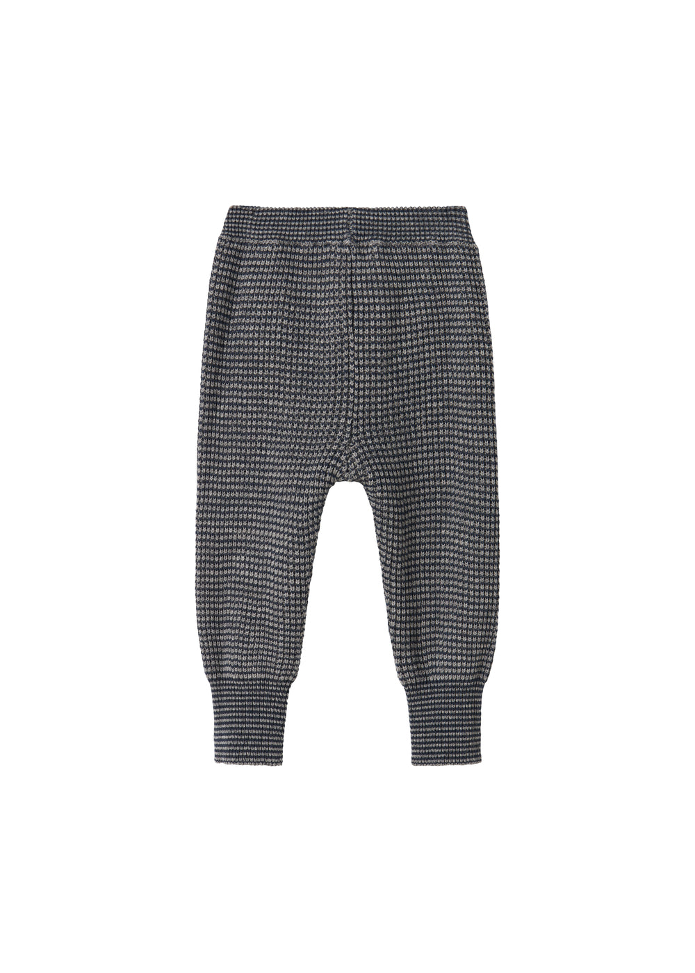 Strikbukser til baby i en fin vævet struktur med elastik i livet og rib i bukseben. Taljen er strikket med elastiktråd der gør den blød og fleksibel at have på.