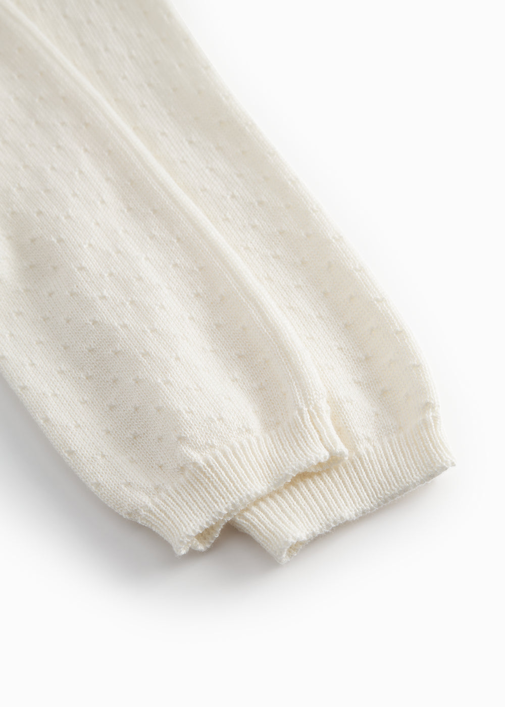 Strikbukser til de mindste med fint hulmønster. Bukserne har bred elastikkant i taljen og ribkanter ved anklerne for en blød og behagelig pasform.