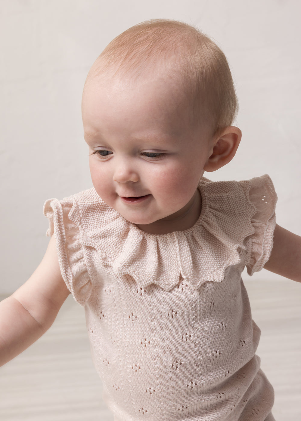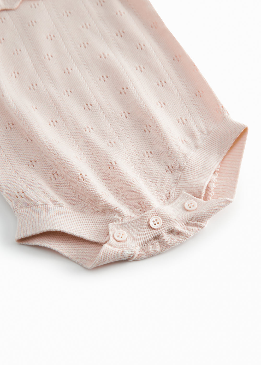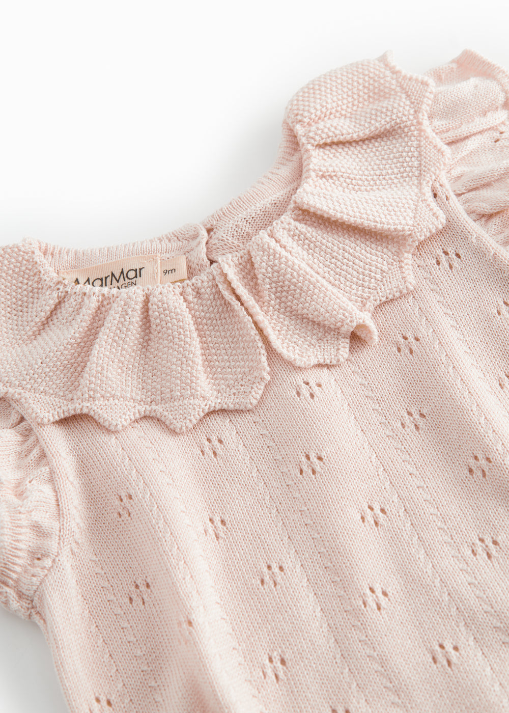Kortærmet strikket baby bodystocking med hulmønster og flæsekrave. Har små flæser ved ærmegab, ribkanter og knaplukning i ryg samt mellem benene for nemmere bleskiftning.