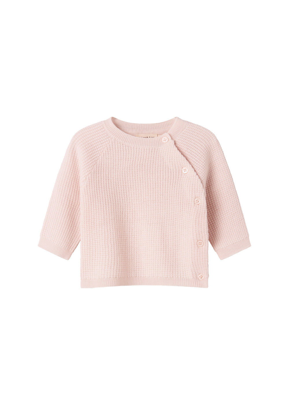 Strikbluse i merinould til de mindste med raglanærmer og knaplukning i venstre side. Strikblusen er både varm, blød og behagelig at have på.