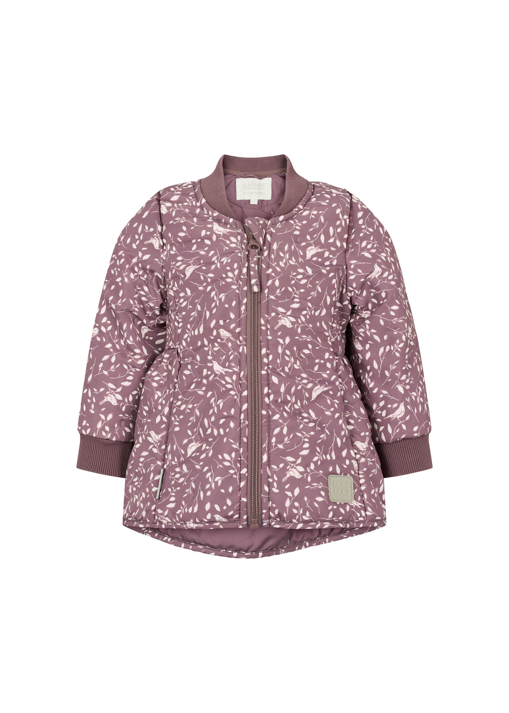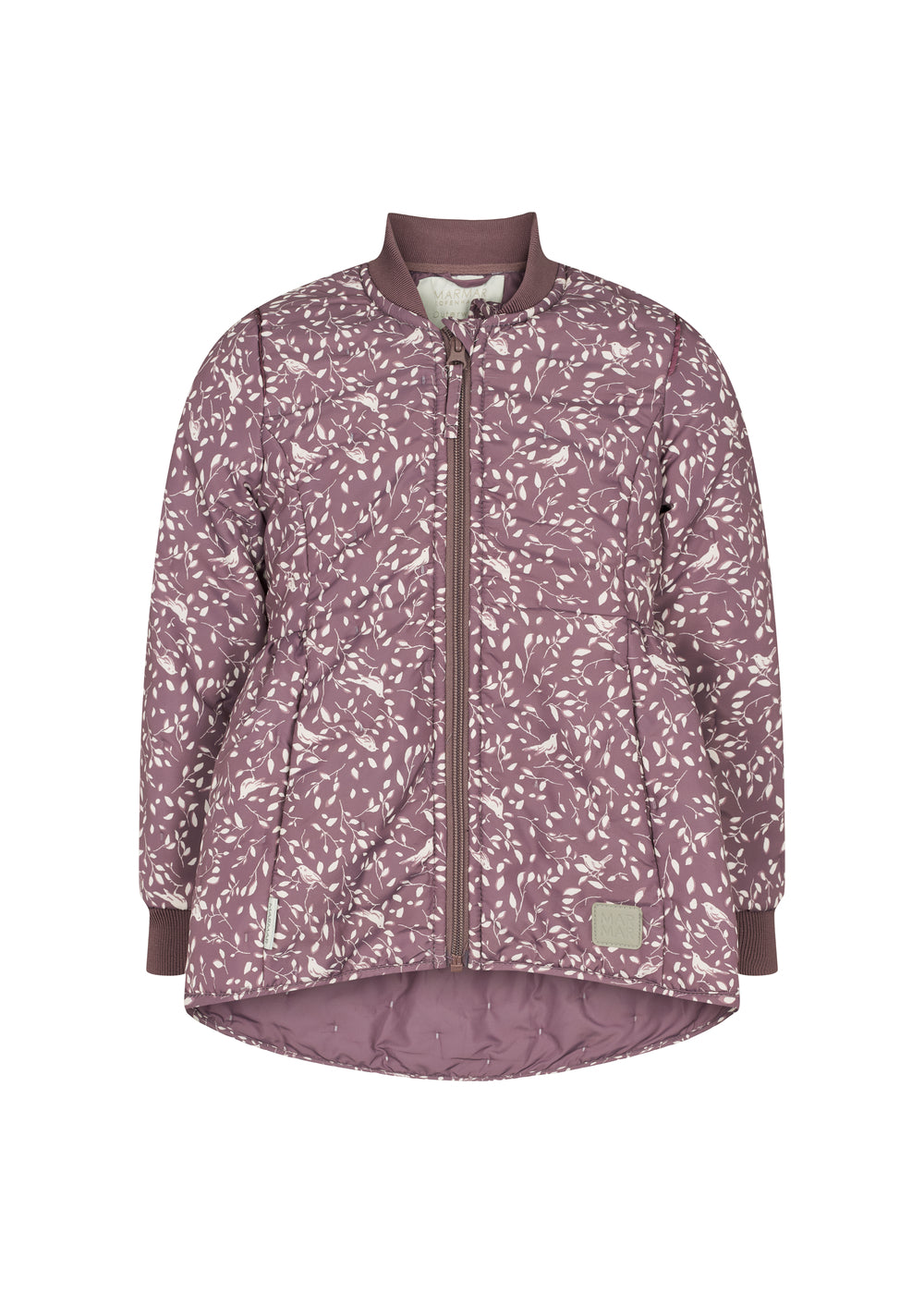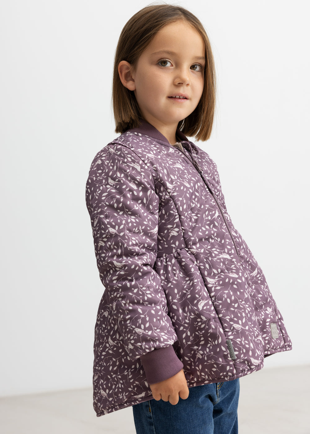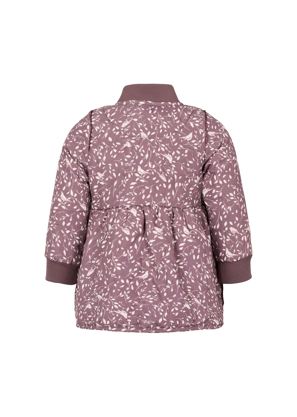 støvlilla termojakke med hvidt bladmønster og rundet kant