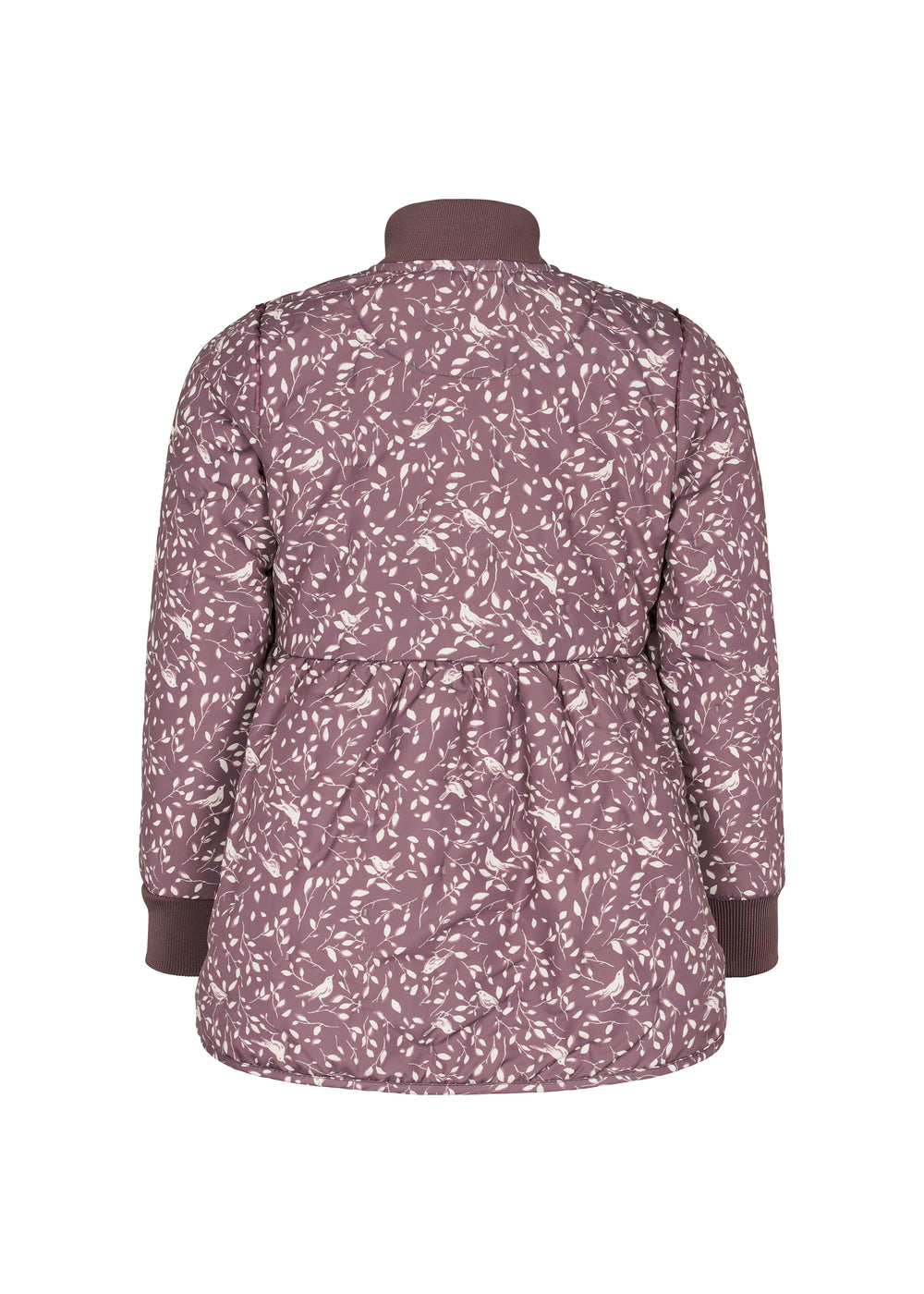 Bagside af støvlilla termojakke med bladmønster og rynk i taljen