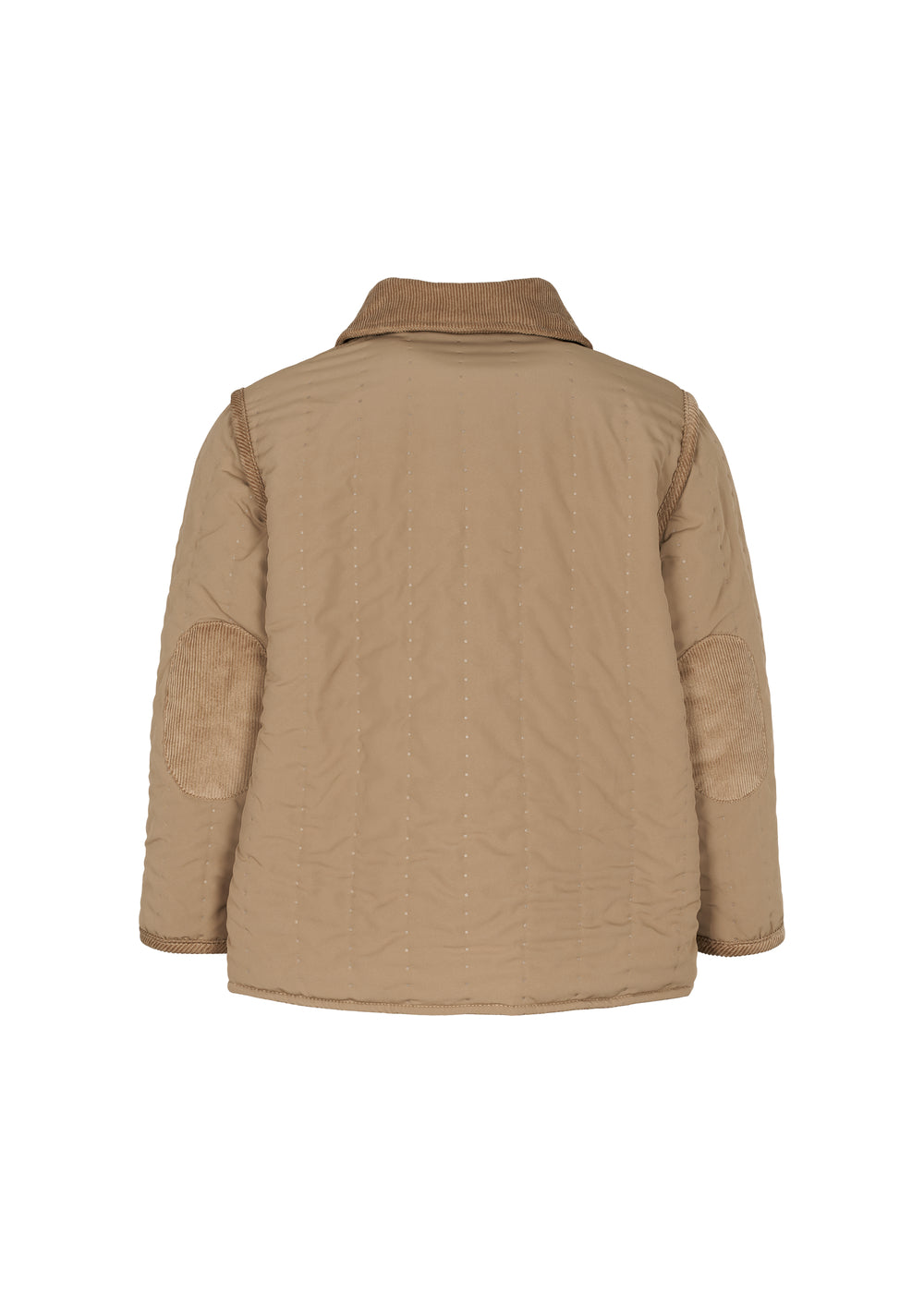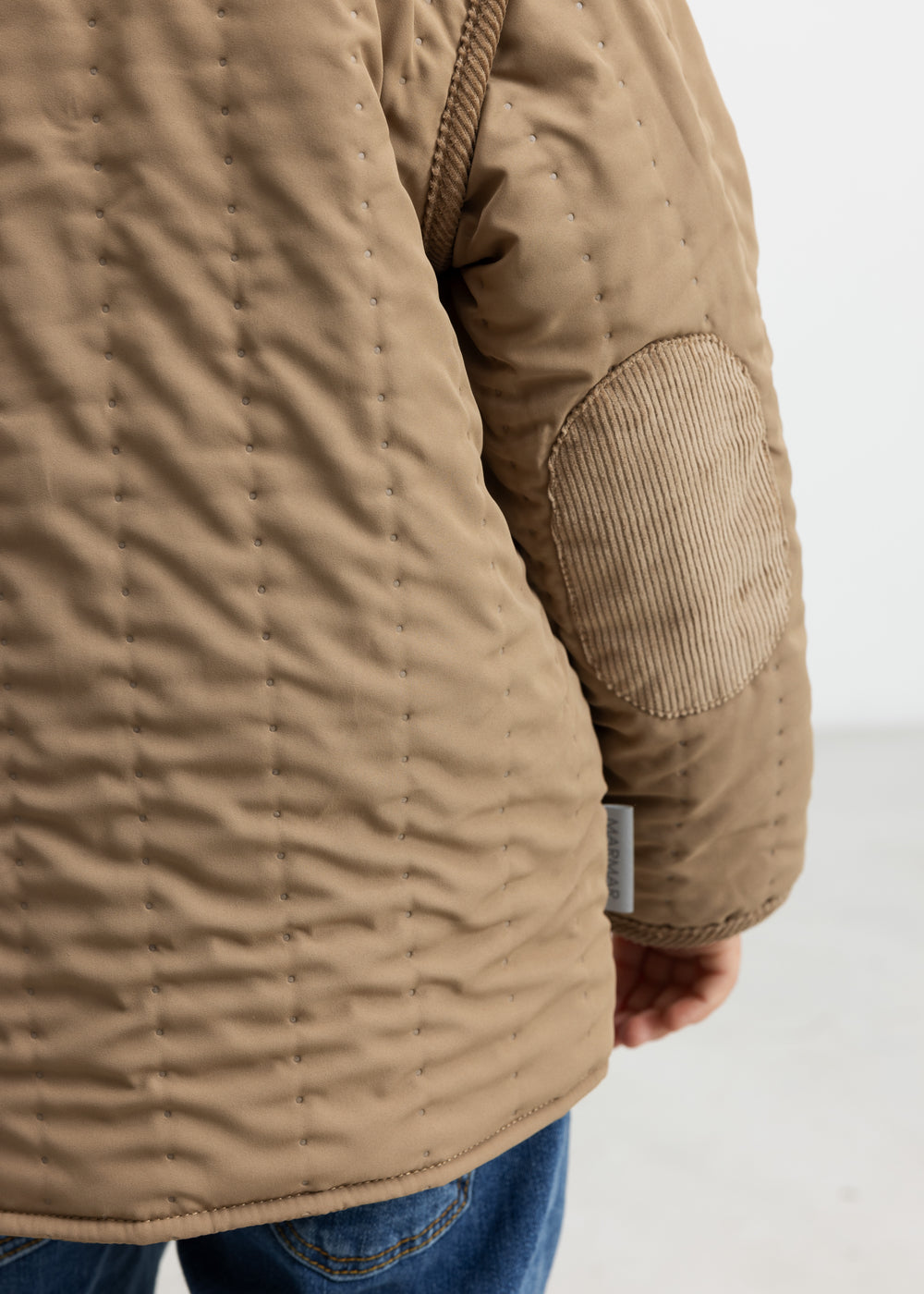 Nærbillede af lomme og quiltet struktur på brun termojakke