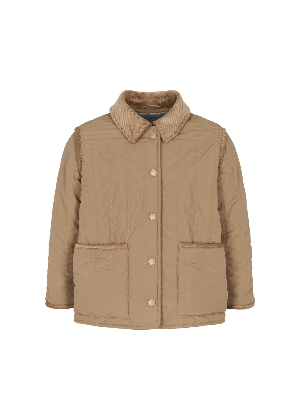 Termojakke til børn med god pasform. Jakken har en blød fløjlskrave som føles behageligt mod huden. Jakken lukkes med trykknapper foran, hvilket gør den nem at tage af og på. For ekstra funktionalitet har jakken to rummelige forlommer, dekoreret med fine kantdetaljer, som både giver et elegant udtryk og gør det praktisk at opbevare småting. Termojakken fungerer perfekt som lun og praktisk overgangstøj.