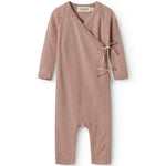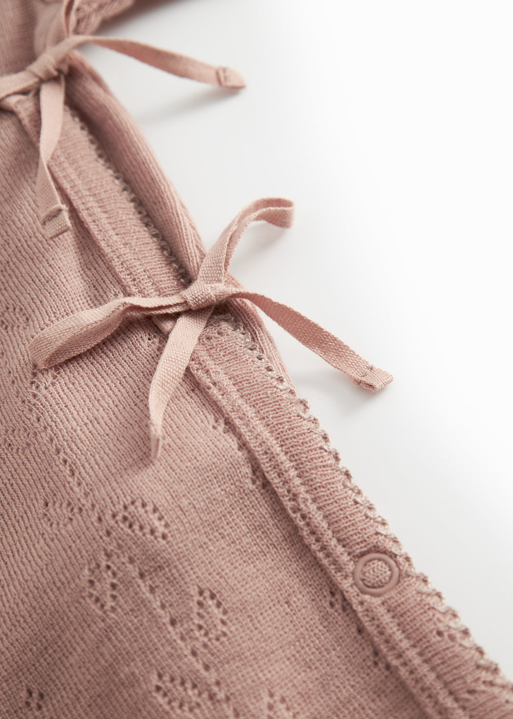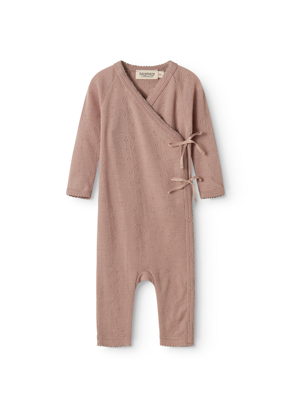 Baby heldragt i en meget blød uld kvalitet med et fint hul mønster. Heldragten har slå-om effekt med trykknapper og bindebånd.