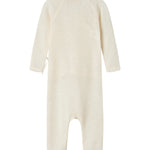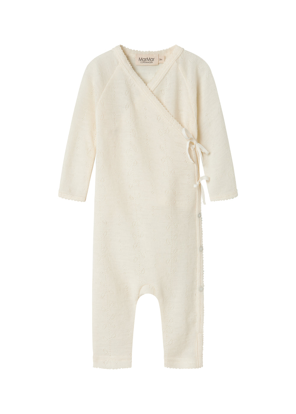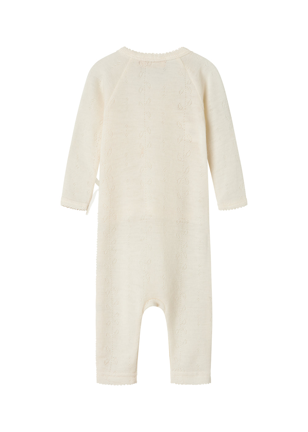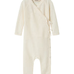Langærmet heldragt til nyfødte. Heldragten har slå-om-lukning. Lukkes med trykknapper og bindebånd