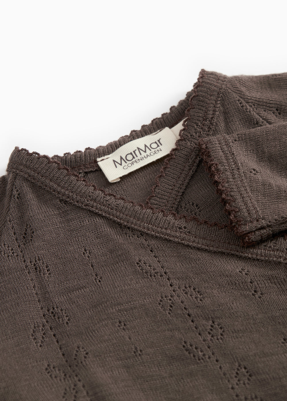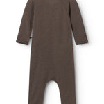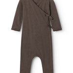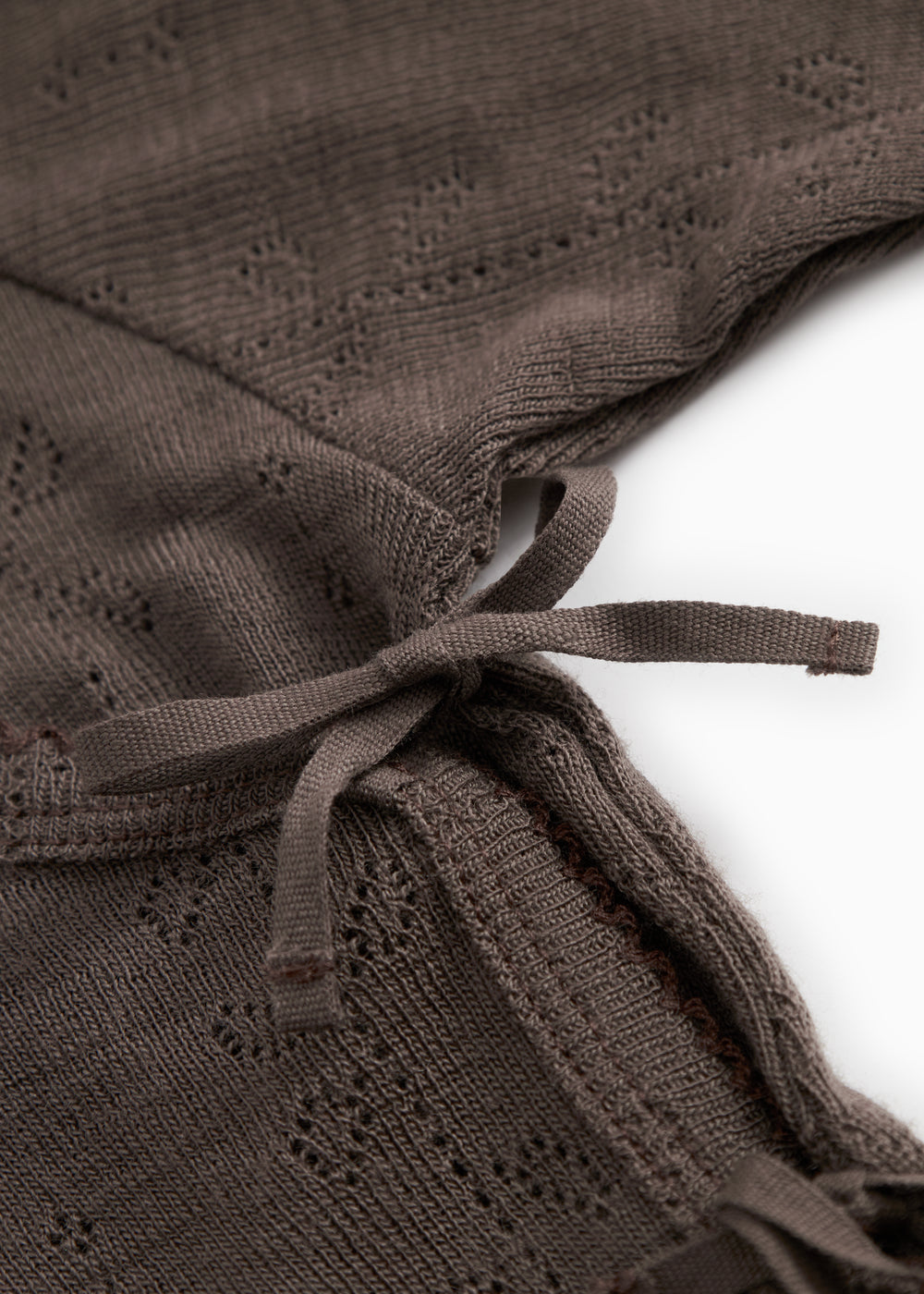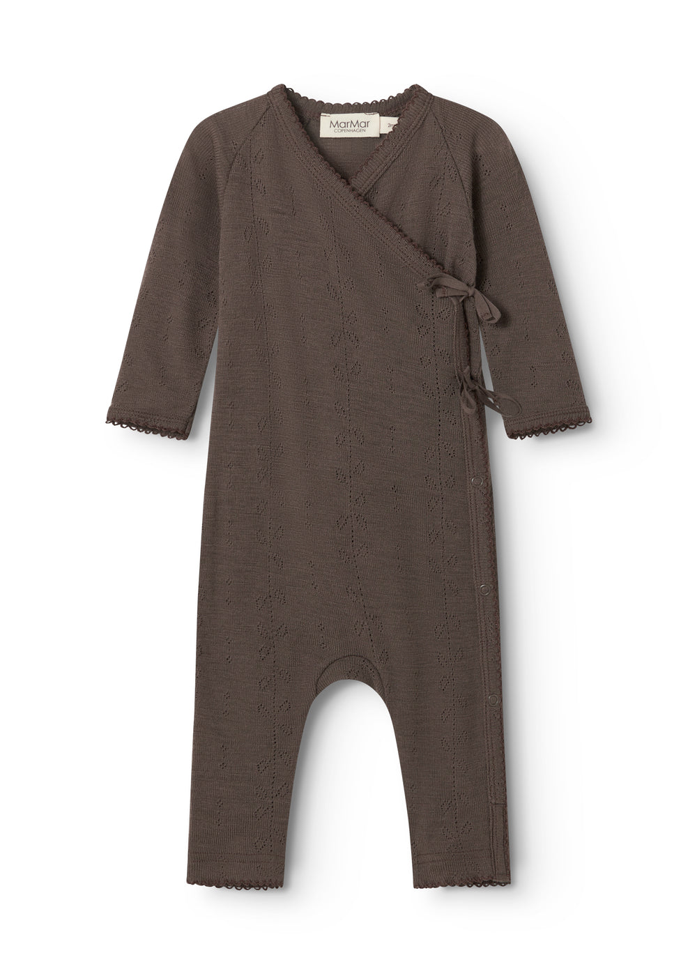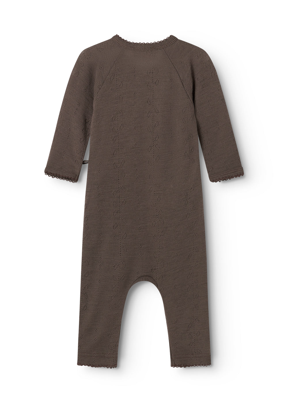 Baby heldragt i en meget blød uld kvalitet med et fint hul mønster. Heldragten har slå-om effekt med trykknapper og bindebånd.