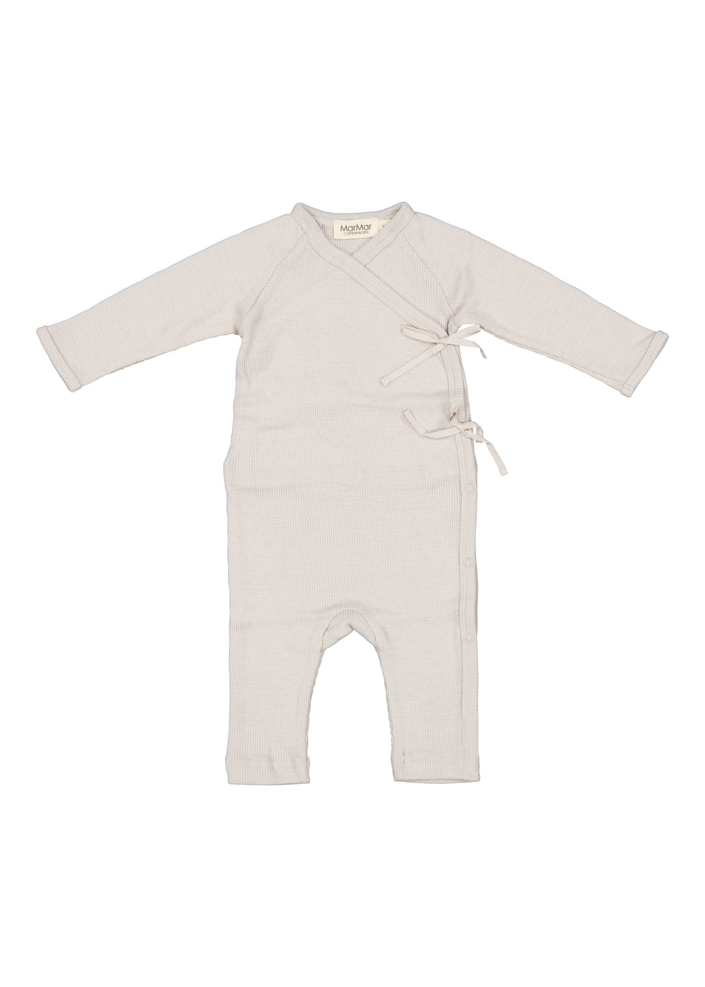 Langærmet heldragt til nyfødte. Heldragten har slå-om-lukning. Lukkes med trykknapper og bindebånd