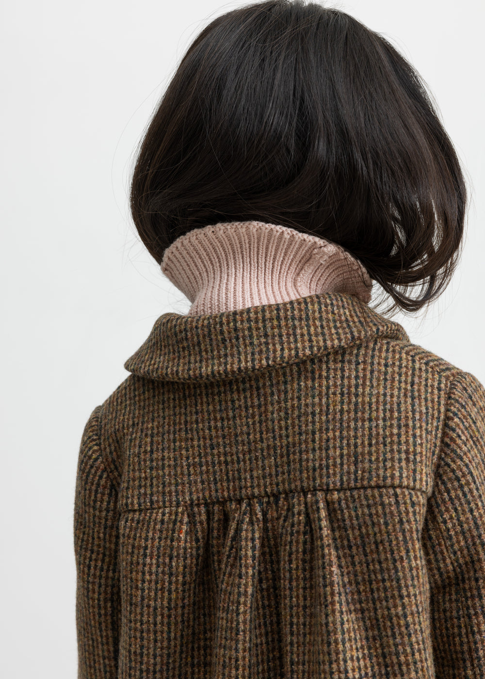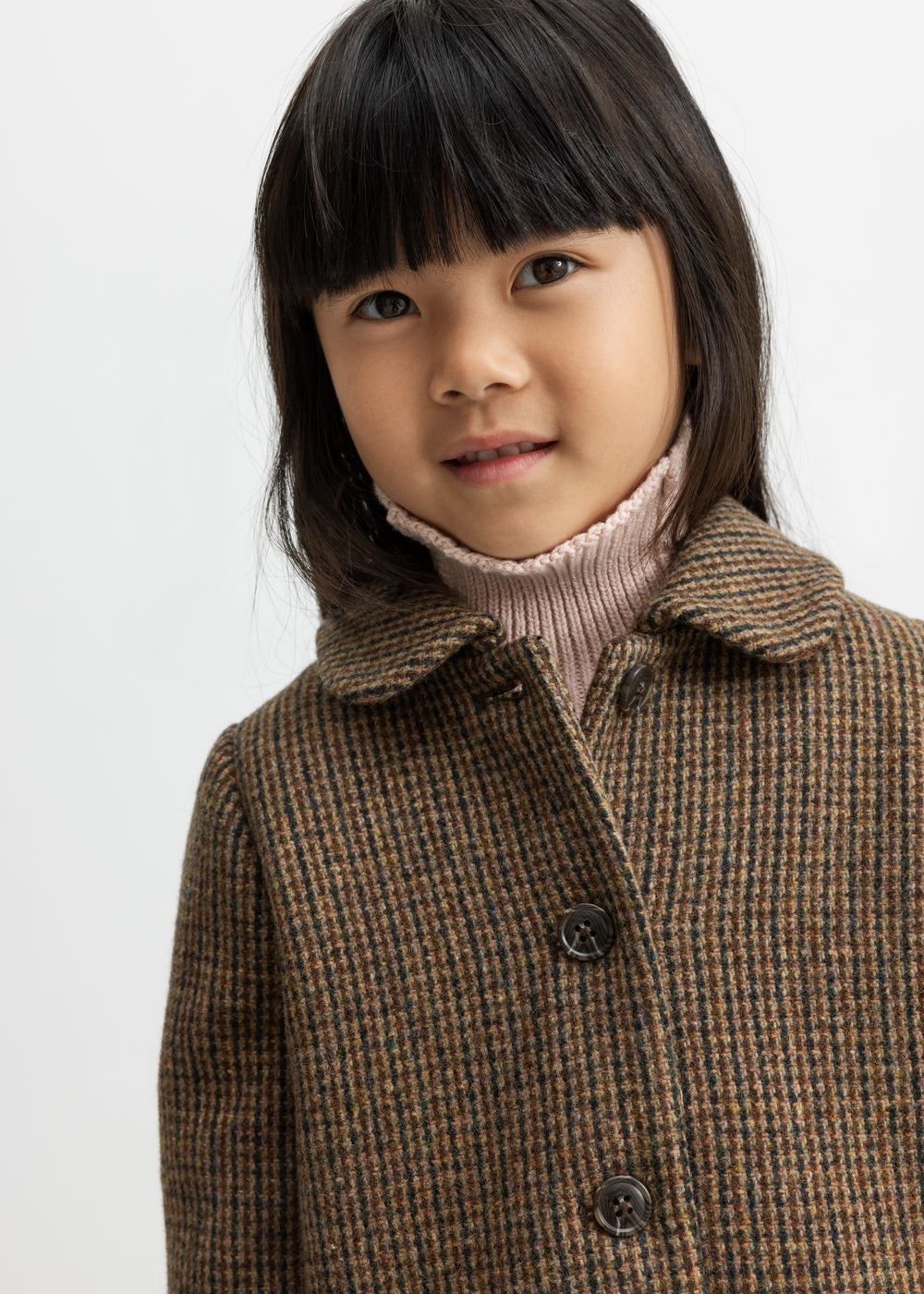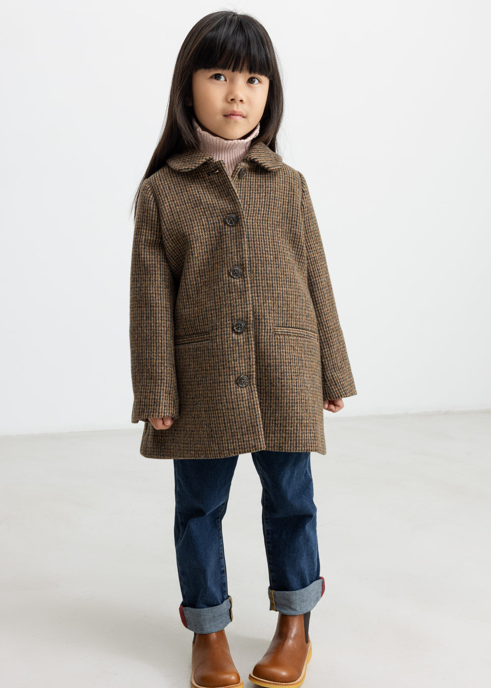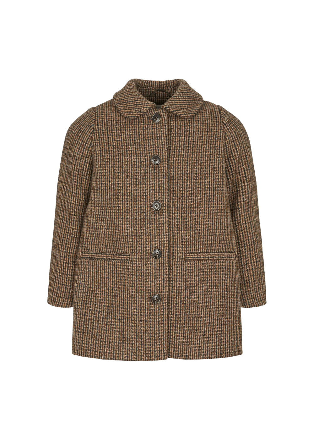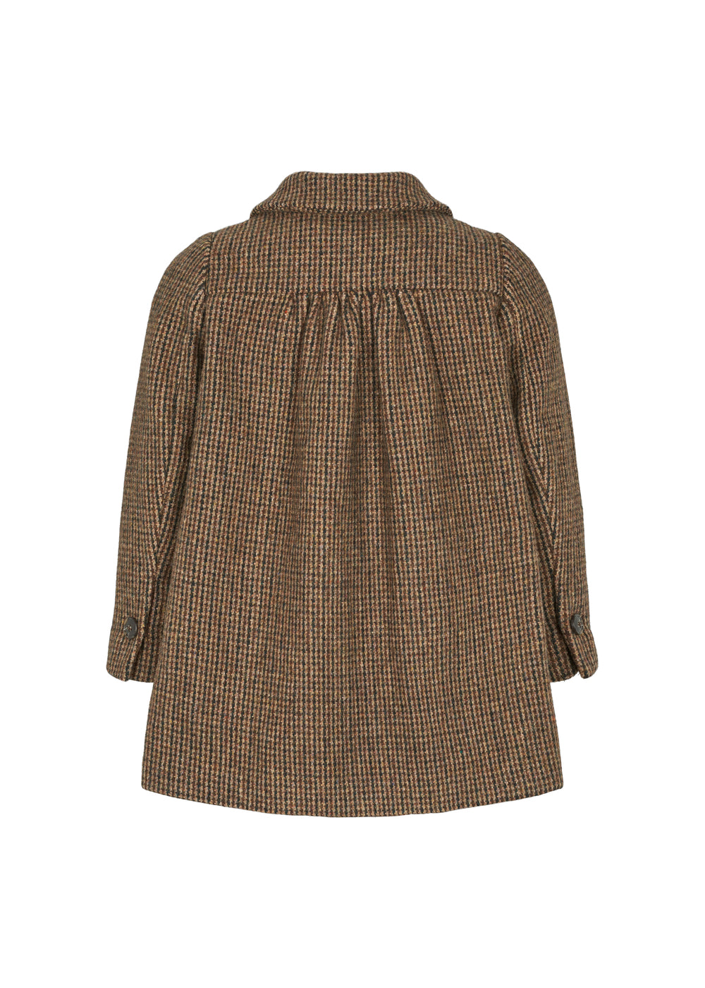Klassisk og tidsløs uldfrakke med lange ærmer - Perfekt til de køligere måneder. Frakken har et elegant ternet mønster med fine rynkedetaljer på ryggen for en flot pasform. Frakken har krave, knaplukning og to diskrete lommer foran (Obs. Lommerne er riet sammen og skal sprættes forsigtigt op). En stilfuld og funktionel frakke, der kombinere klassisk design med komfort og varme.