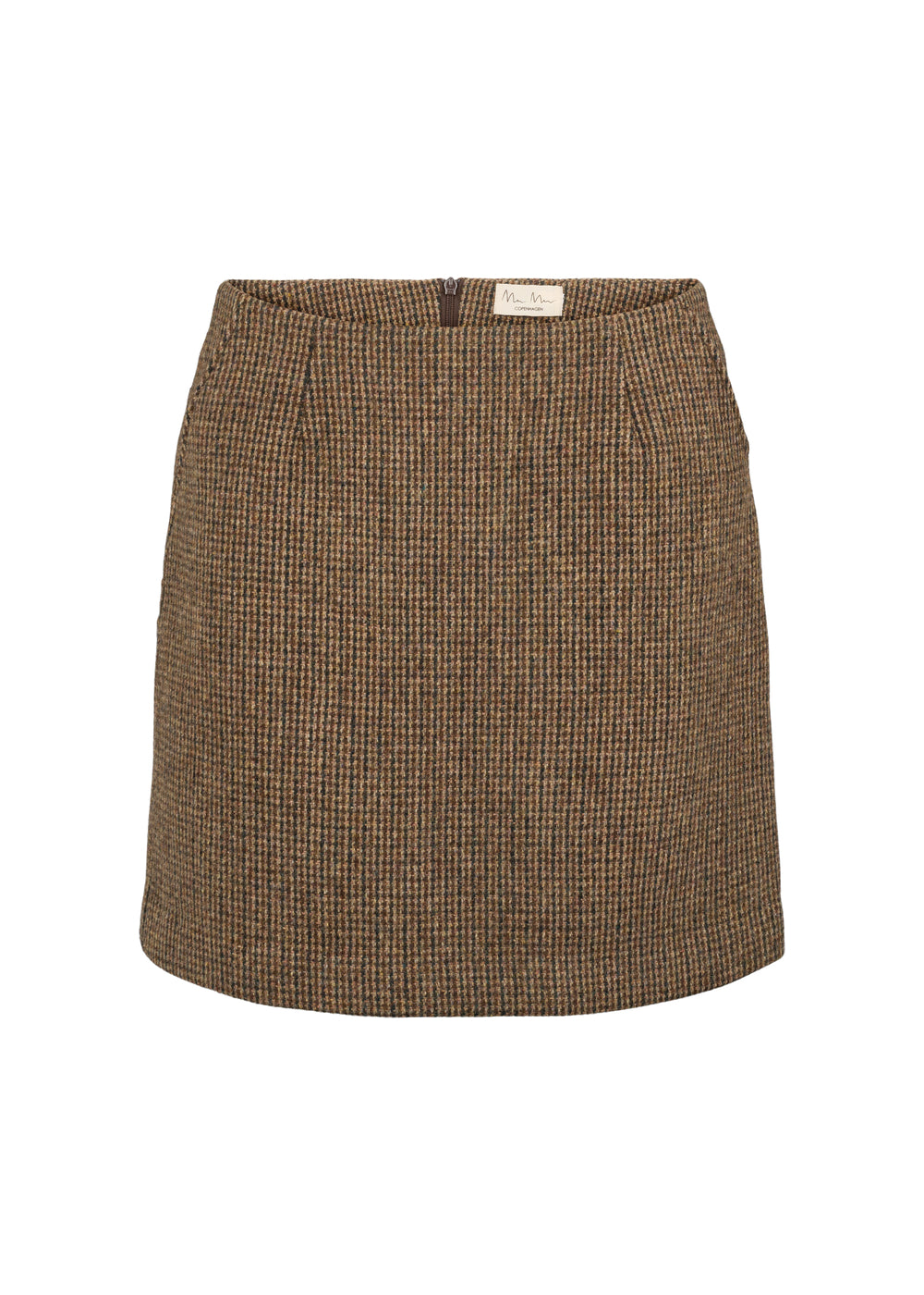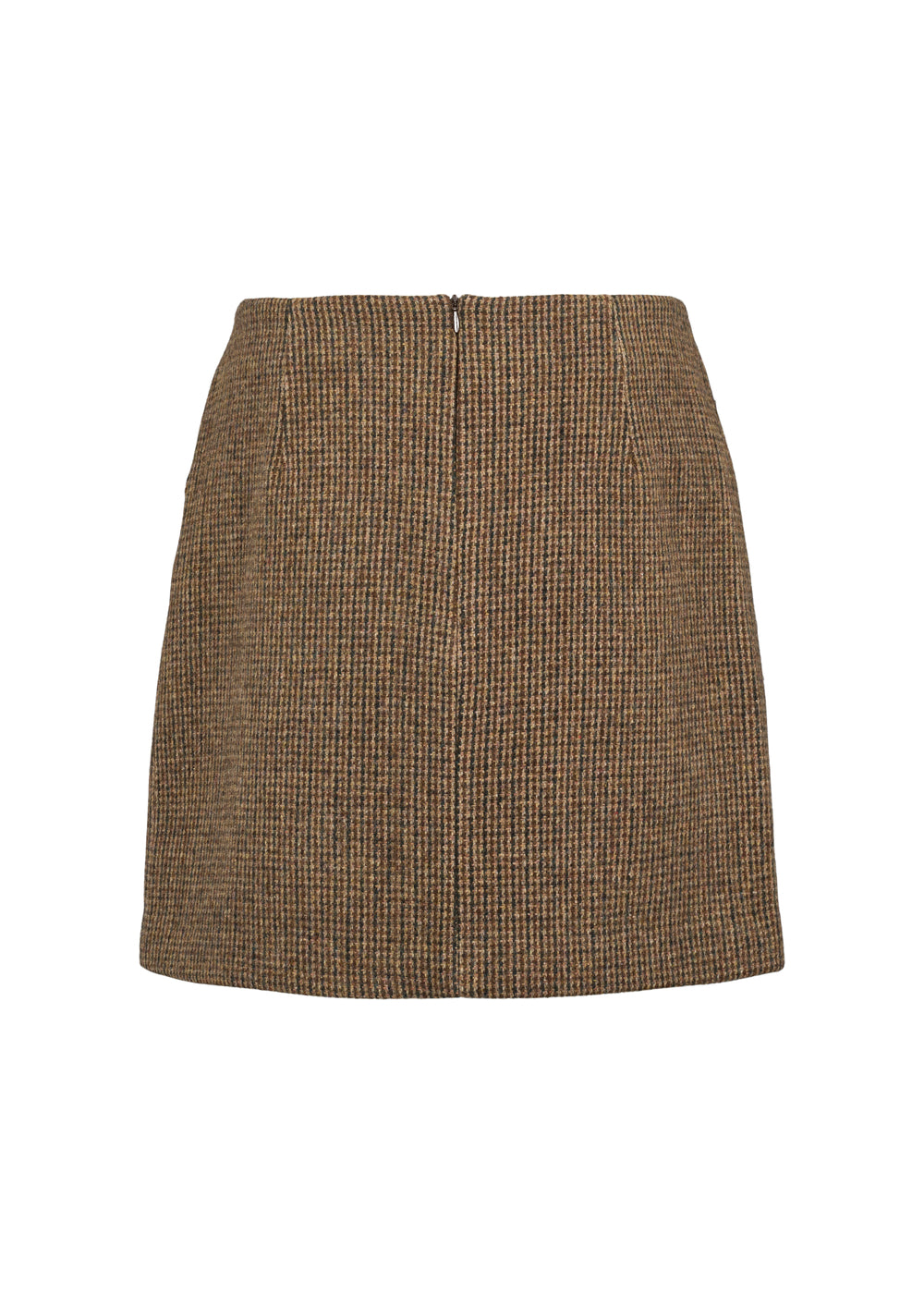 Klassisk a-formet uldnederdel til kvinder i et tidløst ternet mønster. Nederdelen har en skræddersyet pasform med en diskret lynlås bagpå. Stoffet har en struktureret, tweed-lignende overflade, som gør den perfekt til efterår og vinter. Nederdelen kan bruges til både hverdag og kontorbrug, især når den styles med strømpebukser og støvler.