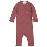 Langærmet heldragt med slå-om-lukning, dragten lukkes med trykknapper og bindebånd fra halsen og ned langs det ene ben