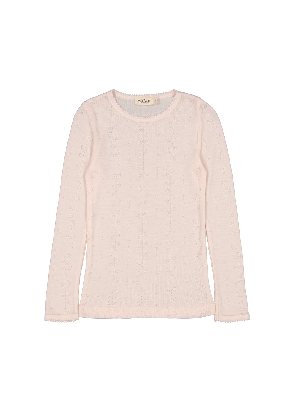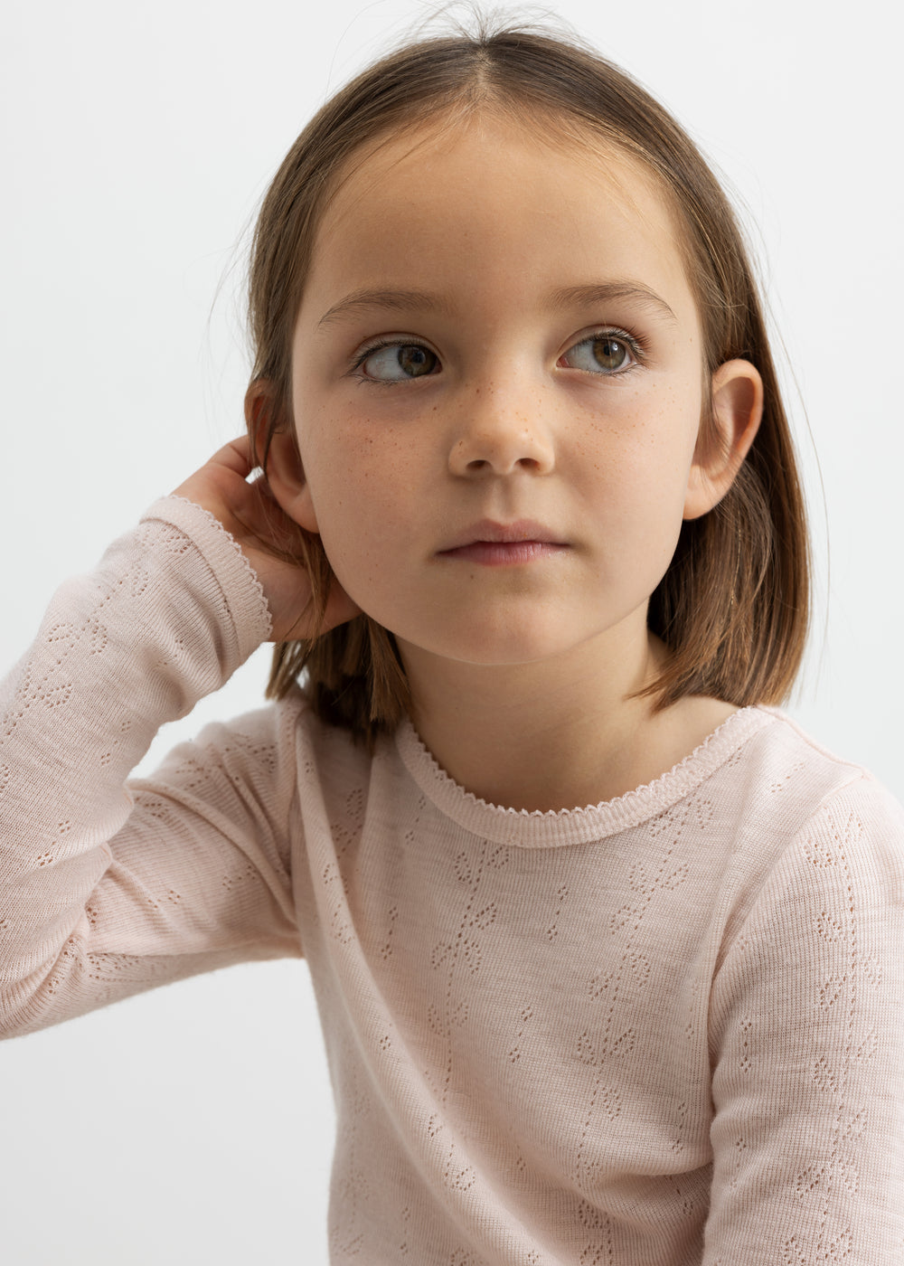 Enkel langærmet t-shirt i 100% merino uld. T-shirten har fine pointelle detaljer og picot kanter.