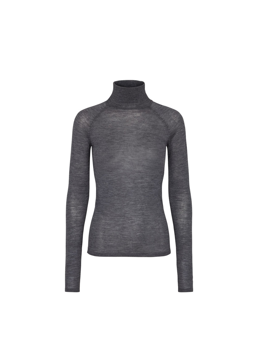Glatstrikket bluse med rullekrave, lange ærmer og et tæt fit. Blød og varm lavet i 100% merino uld.