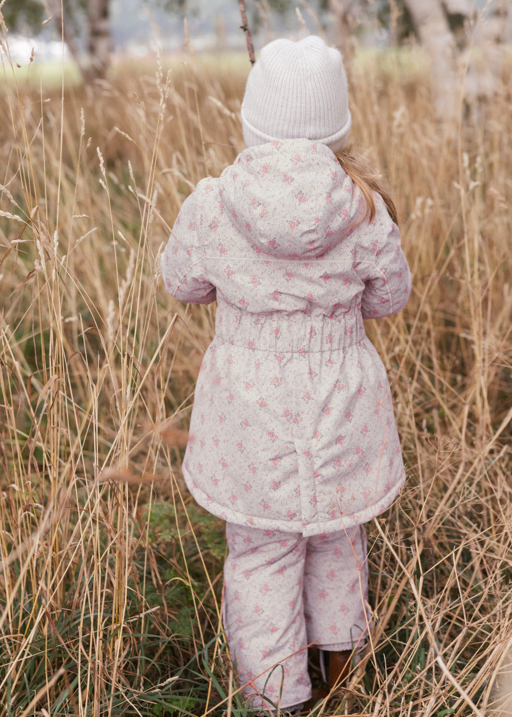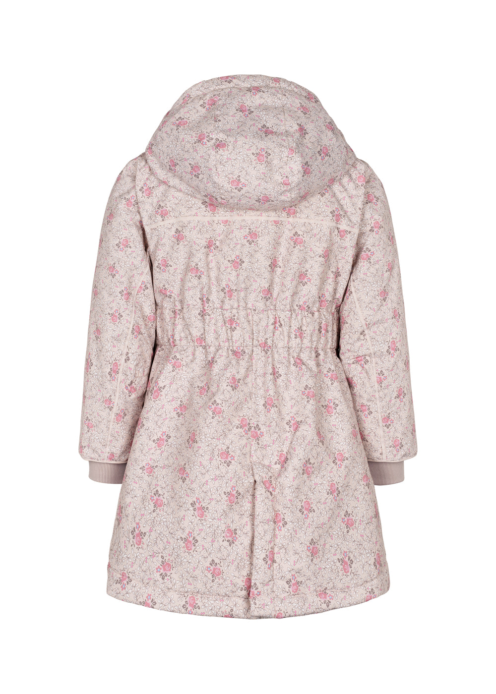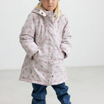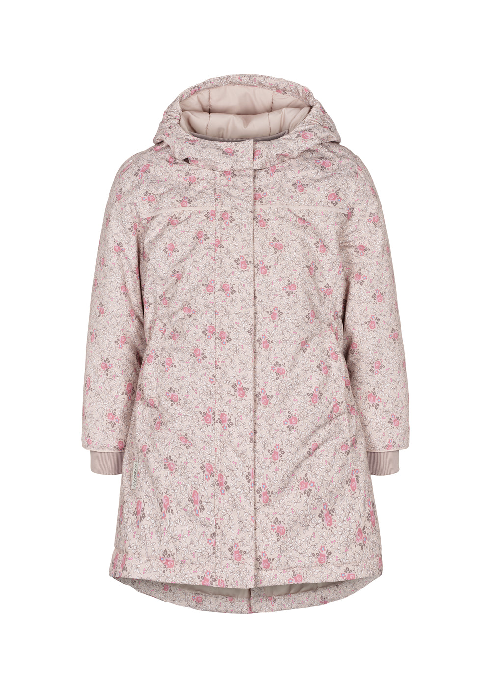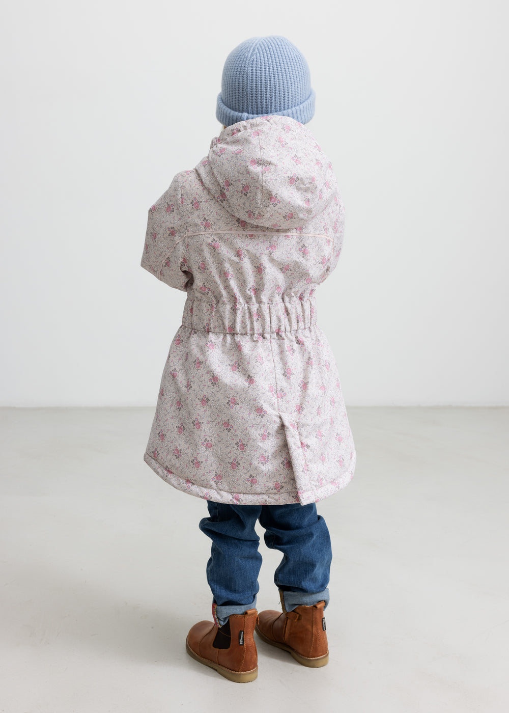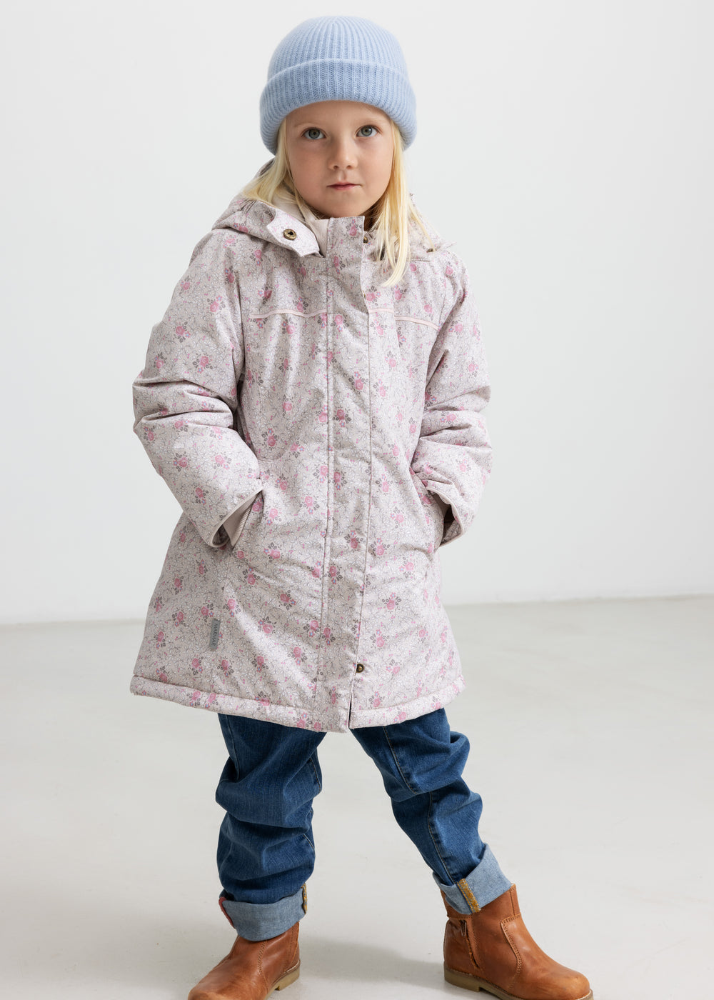 Vinterjakke til børn som er lang, praktisk og feminin med elastik i taljen. Vinterjakken har to lommer i siden og har aftagelig hætte. Jakken er perfekt vinterovertøj i slidstærkt materiale og med thermolite isolering der sikrer en varm og tempereret kropstemperatur.