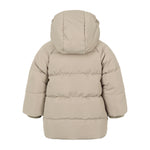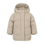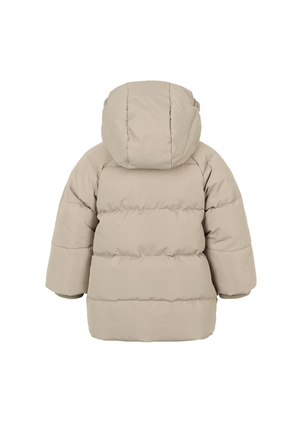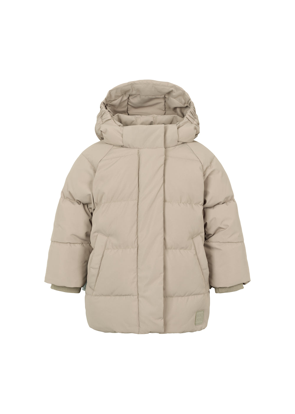 Dunjakke til de mindste, designet til at holde barnet varmt og komfortabelt i de kolde måneder. Jakken har aftagelig hætte, to funktionelle skrå sidelommer, hvor hænderne kan holdes varme eller småting kan opbevares. Dunjakken lukkes med skjult lynlåslukning foran med en bred stormflap, der lukkes med trykknapper, hvilket giver ekstra beskyttelse mod vind og kulde. Jakken sidder tæt omkring håndleddene, så ingen kulde trængere ind. Dunjakken er ideelt til både hverdagsbrug og udendørs aktiviteter, hvor barnet har brug for en varm, slidstærk og stilfuld jakke.