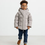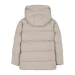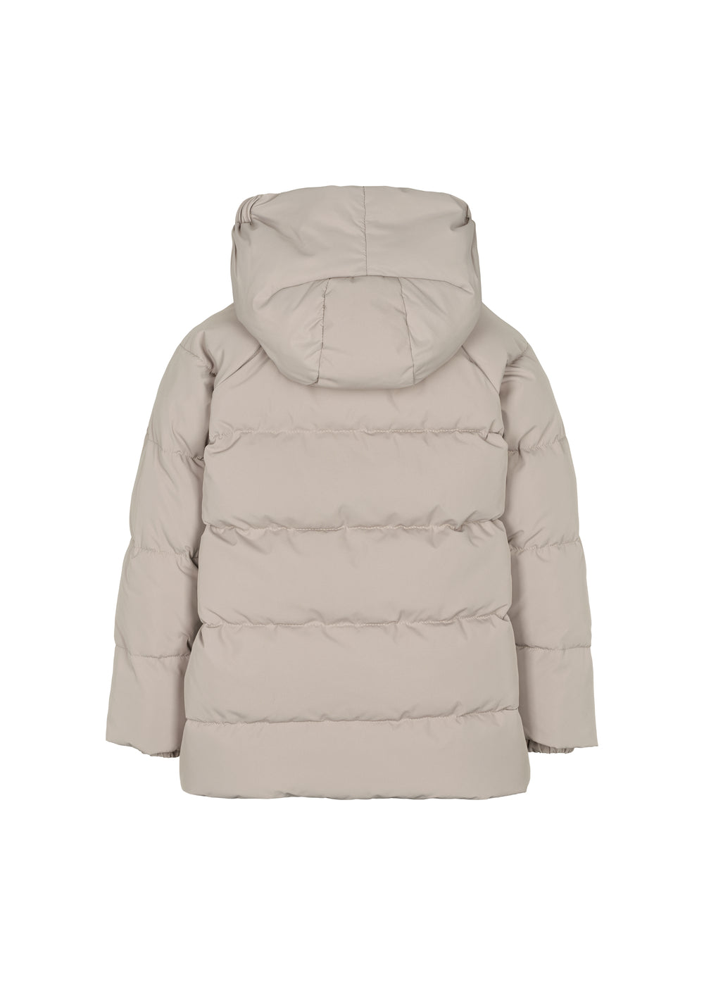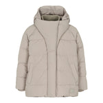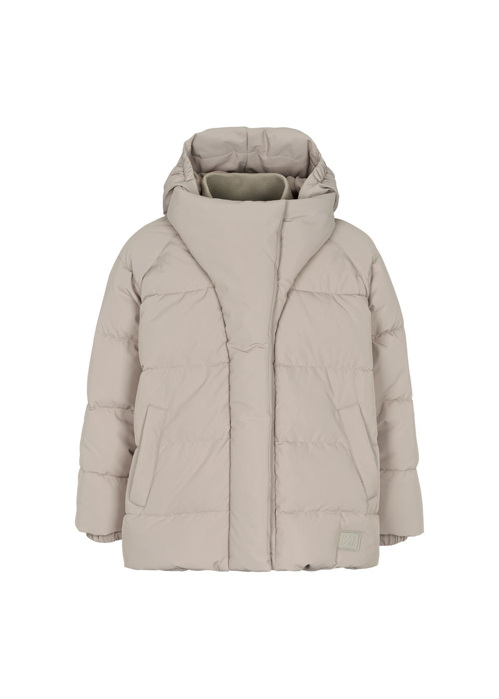 Dunjakke med høj krave og rummelig aftagelig hætte, som beskytter mod vind og kulde. Dunjakken har to skrå sidelommer, hvor hænderne kan holdes varme og småting kan opbevares. Dunjakken lukkes med lynlås skjult bag en bred stormflap med trykknapper. Jakken sidder tæt omkring håndleddene, så ingen kulde trænger ind. Dunjakken kombinerer funktionalitet og stil, hvilket gør den perfekt til både hverdagsbrug og udendørs eventyr i vinterhalvåret.