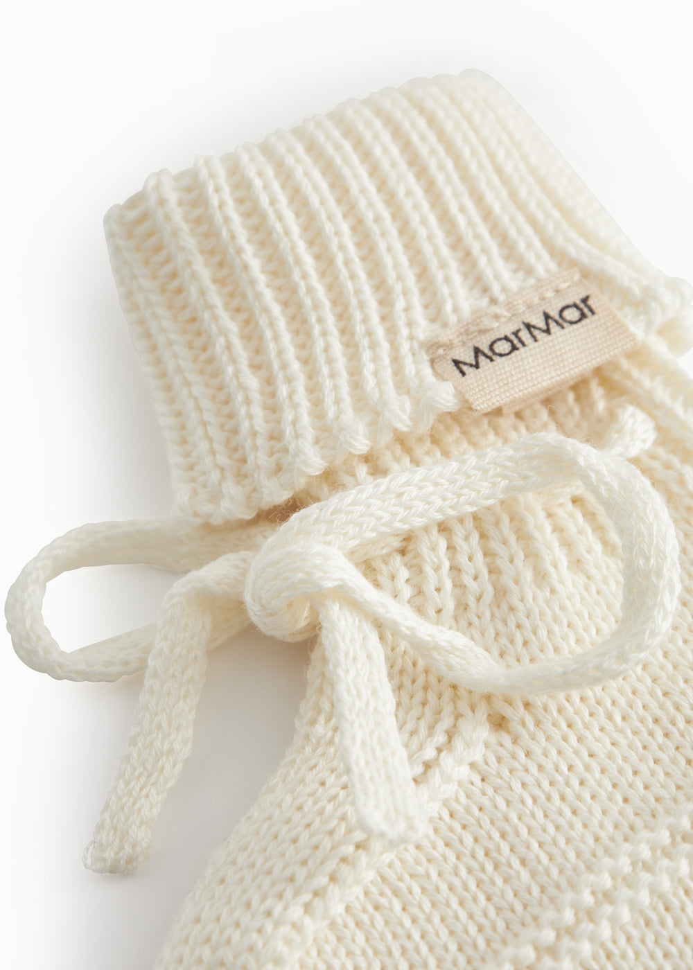 Strikkede babyfutter i råhvid med ribkant og bindebånd