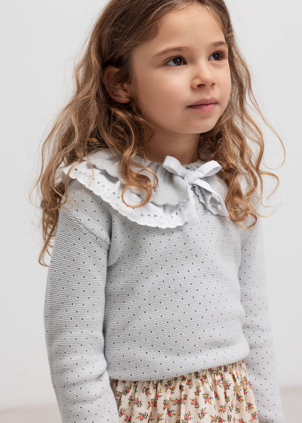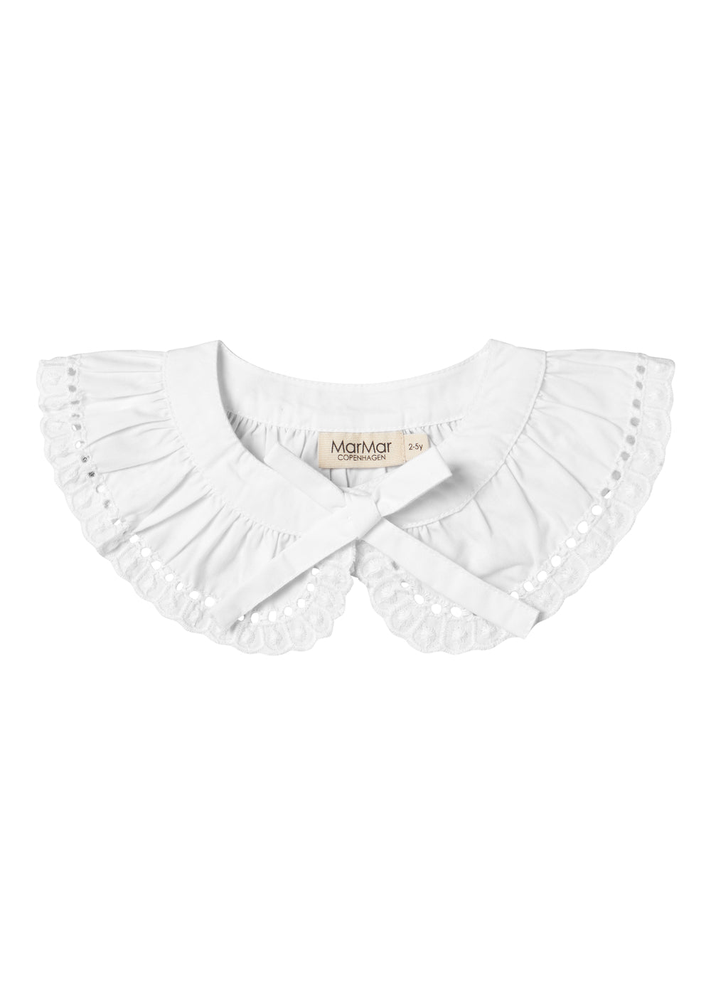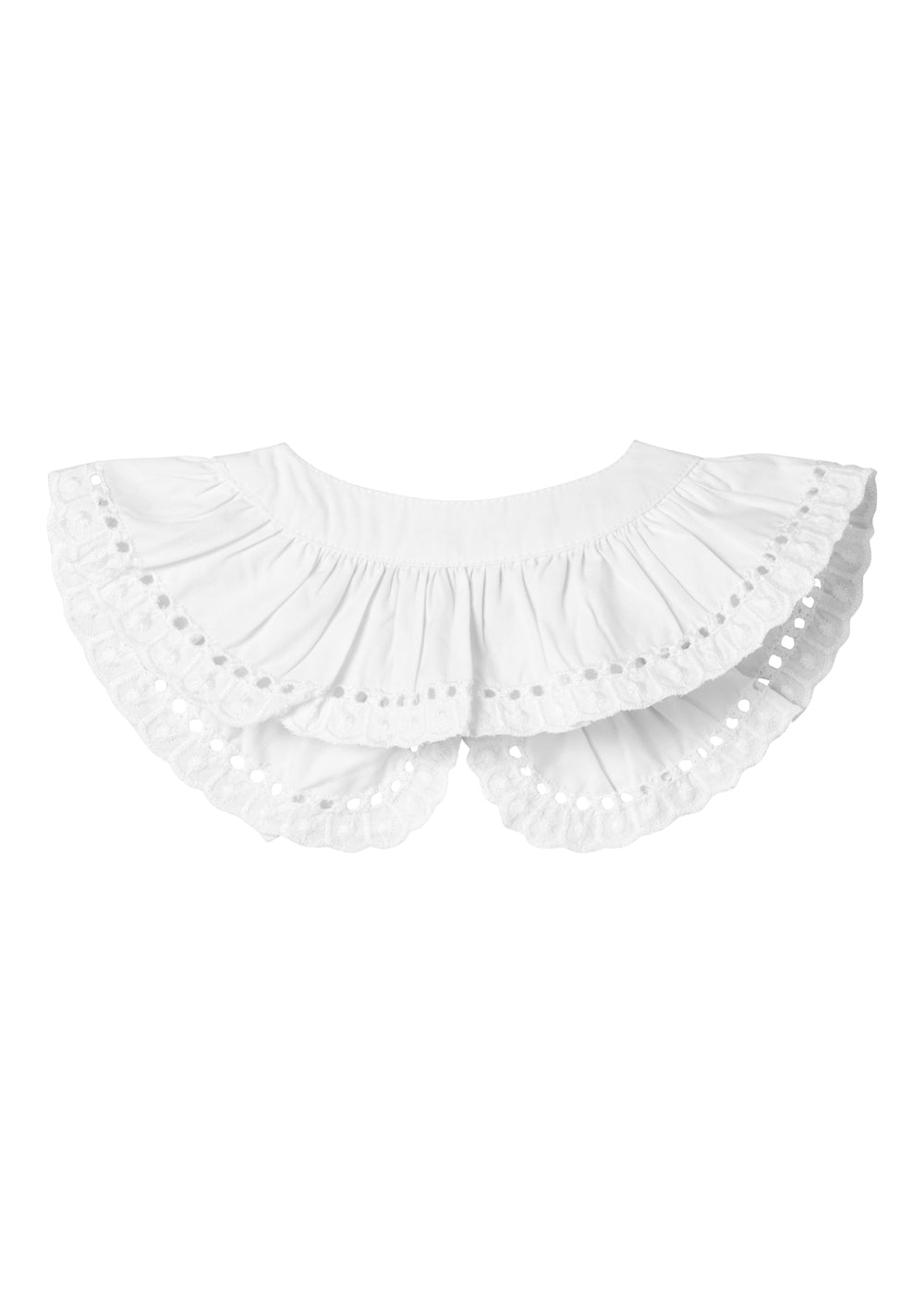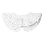 Smuk pyntekrave med broderet hulmønster. Kraven lukkes foran ved at binde en sløjfe.