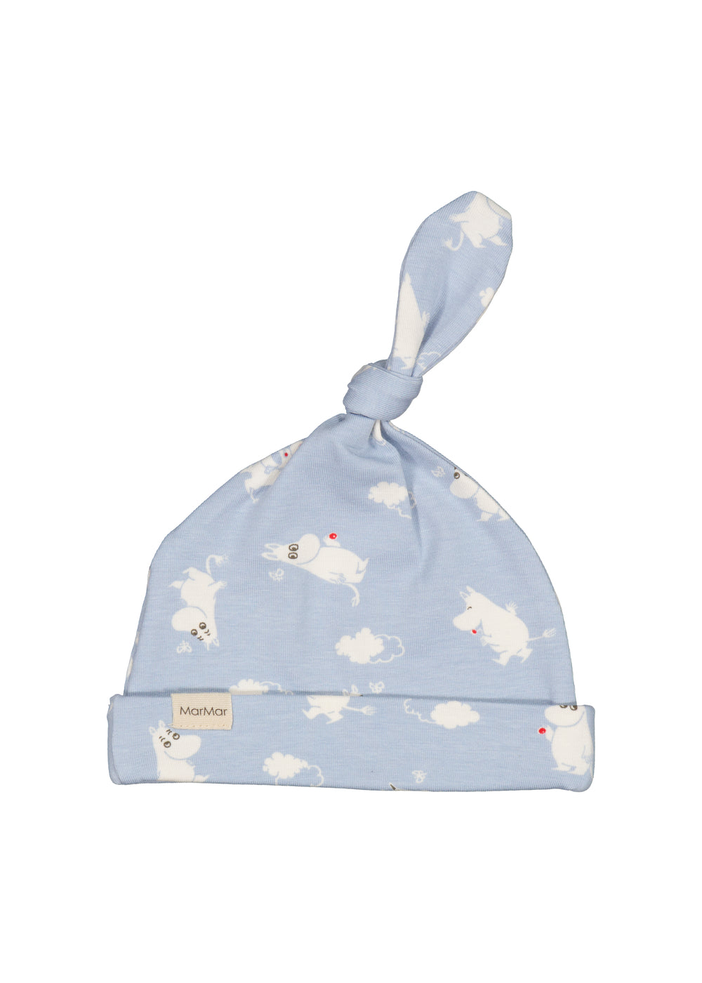 Lille hue med Moomin print til nyfødt med kant der kan foldes ned og med en sød knude på toppen. Huen er både blød, strækbar og behagelig at have på