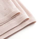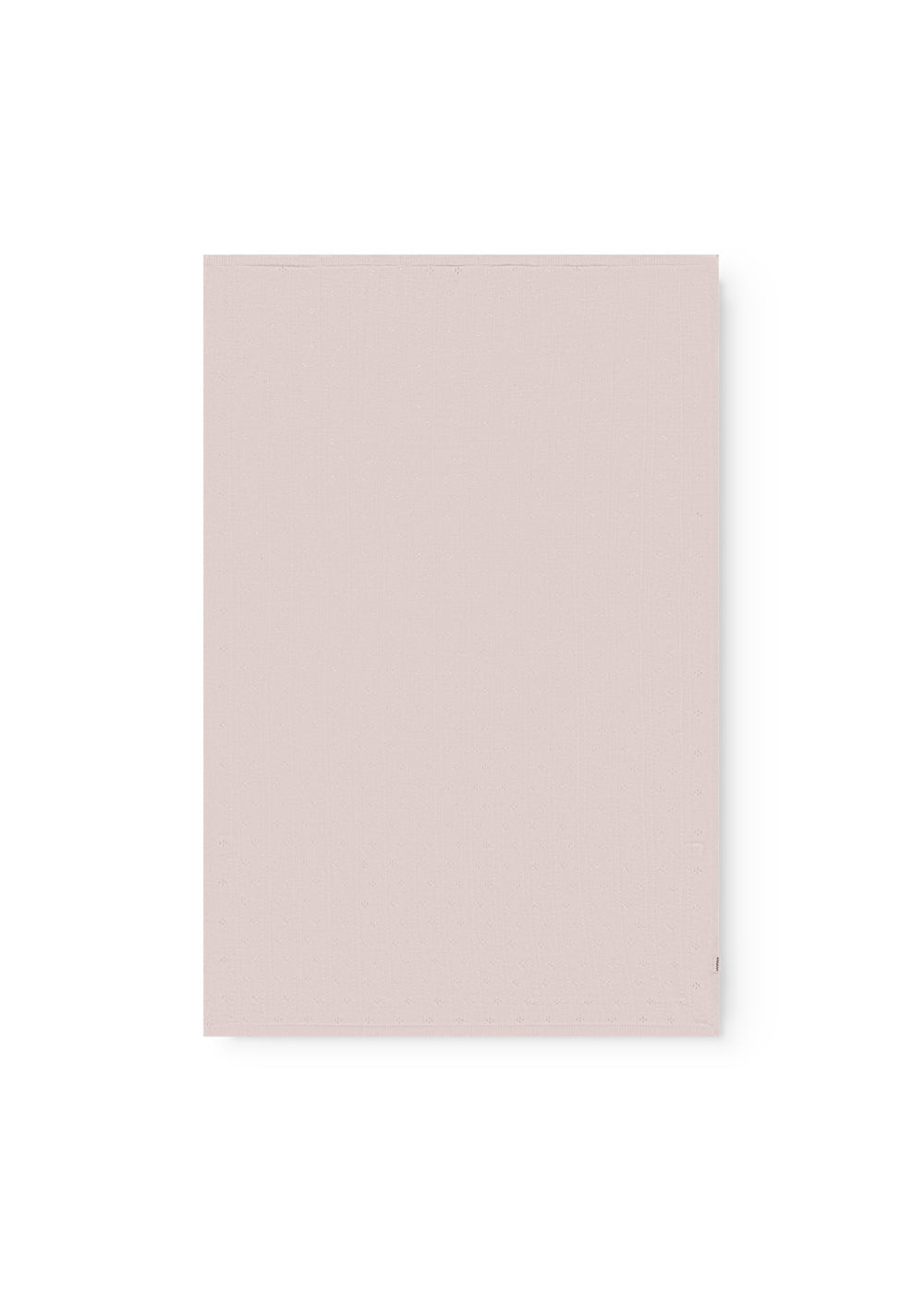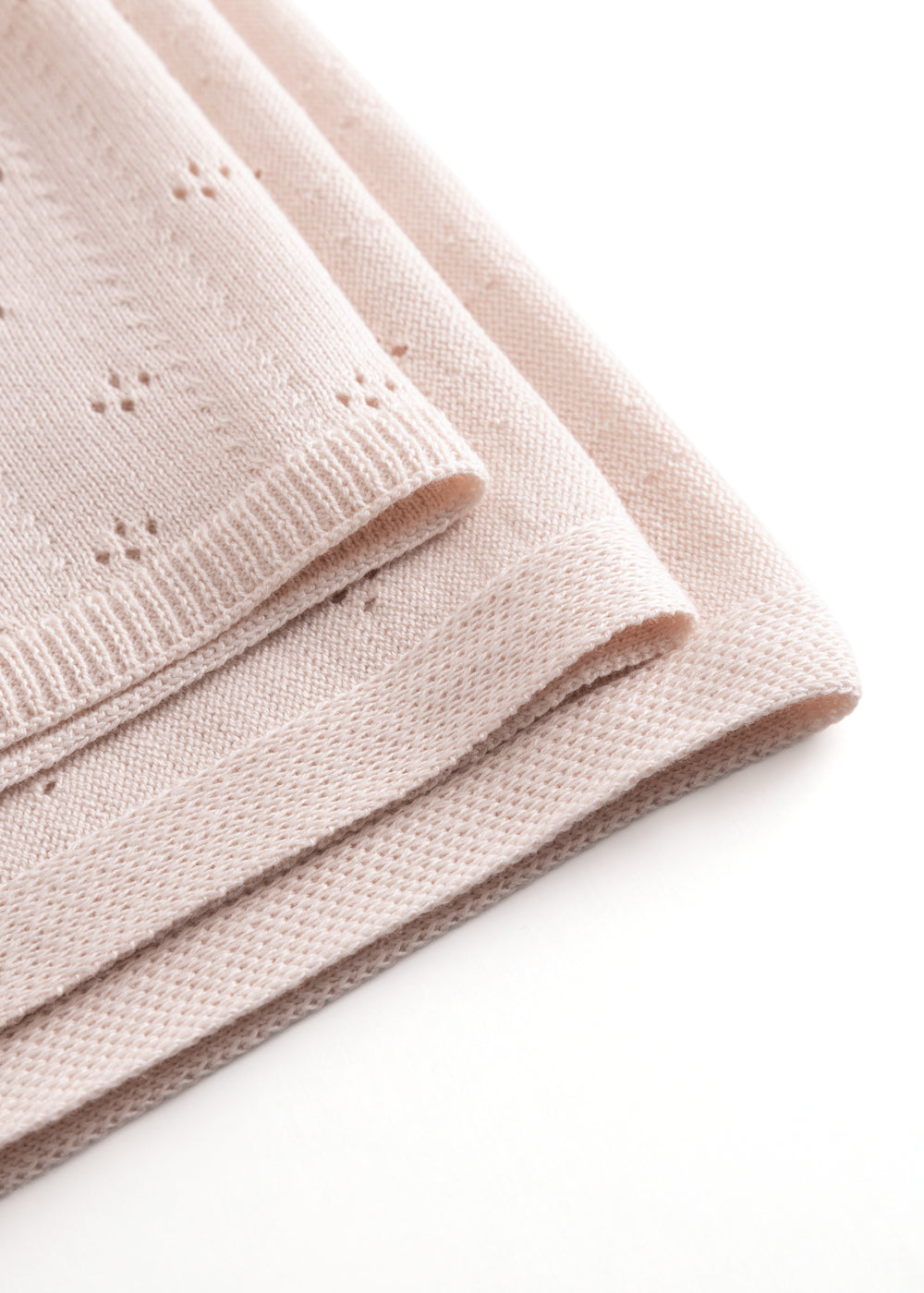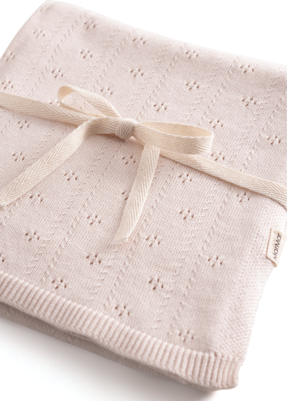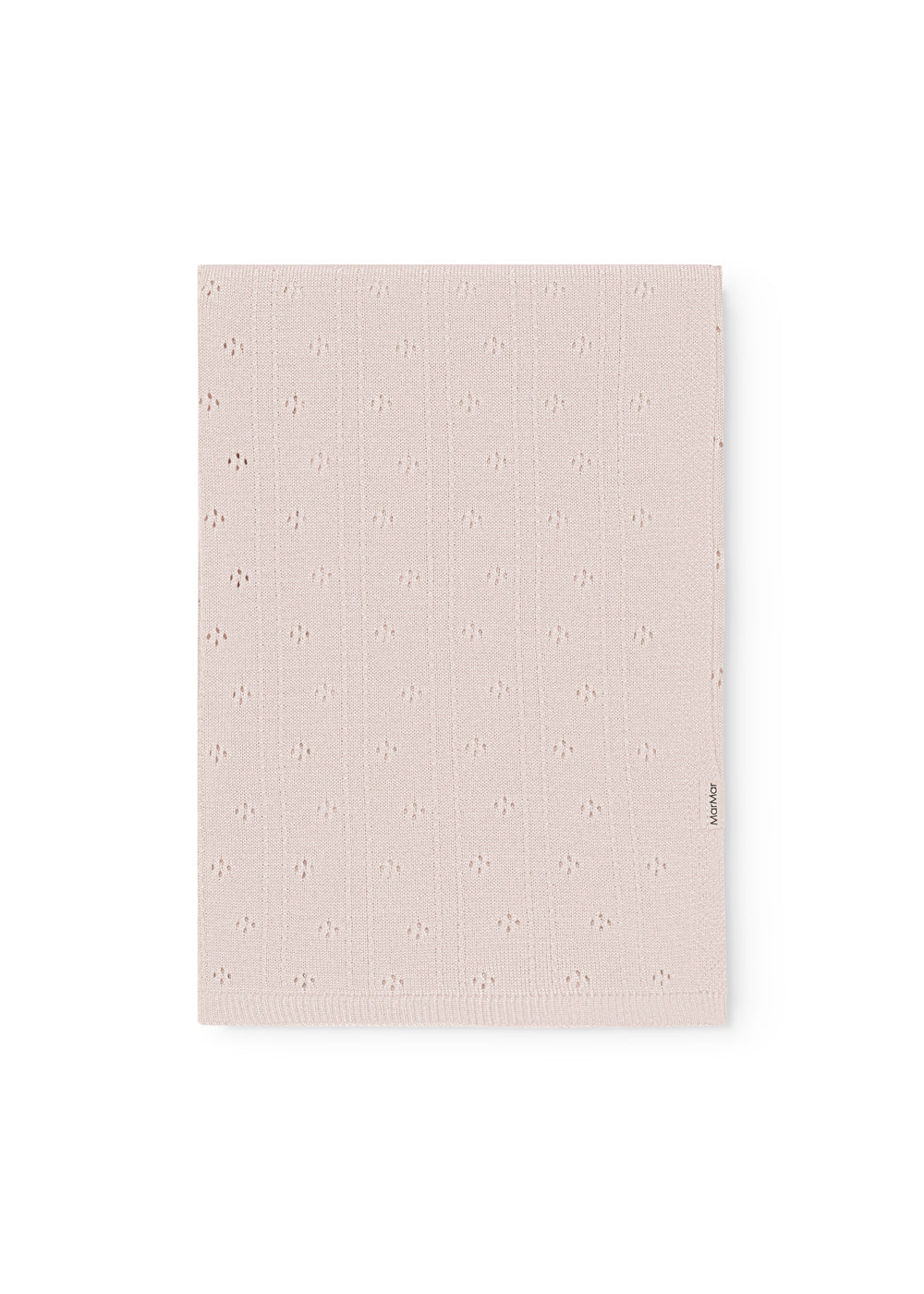 Strik tæppe med fint hulmønster, måler 70cm x 100cm.