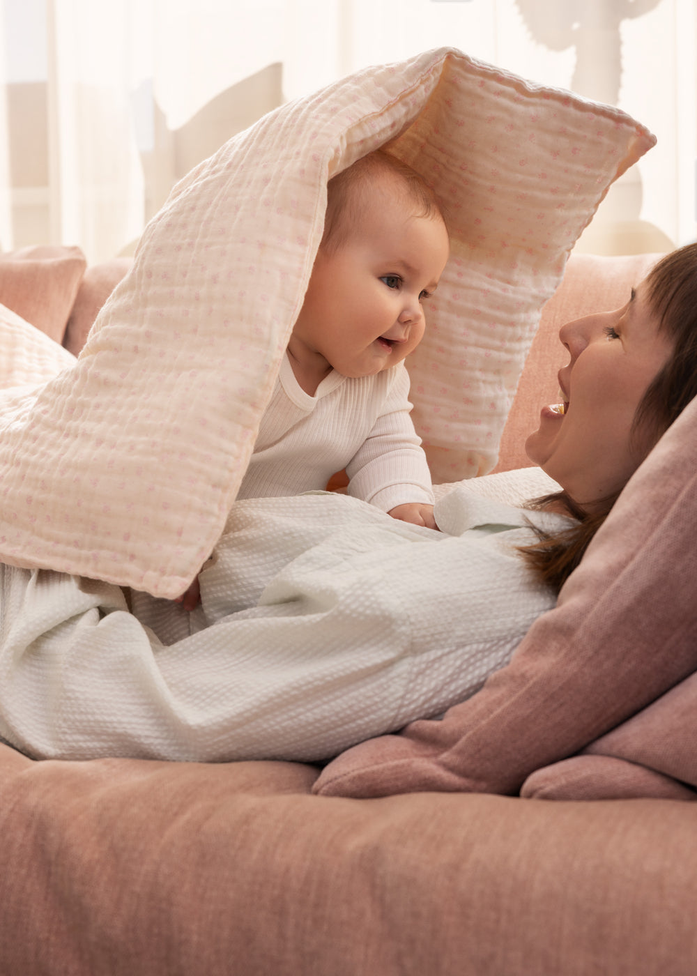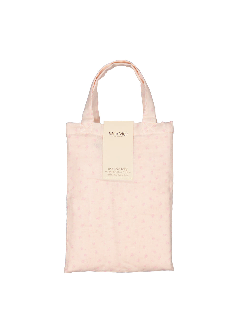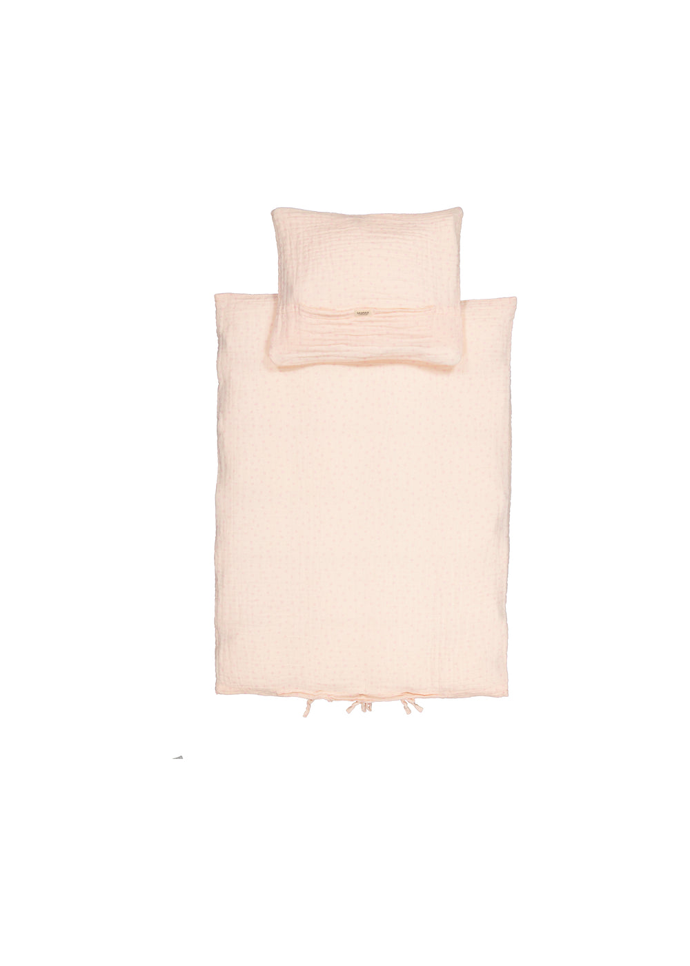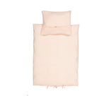 Baby sengetøj i muslin med betræk til dyne og hovedpude. Dynebetrækket lukkes med bindebånd i fodenden