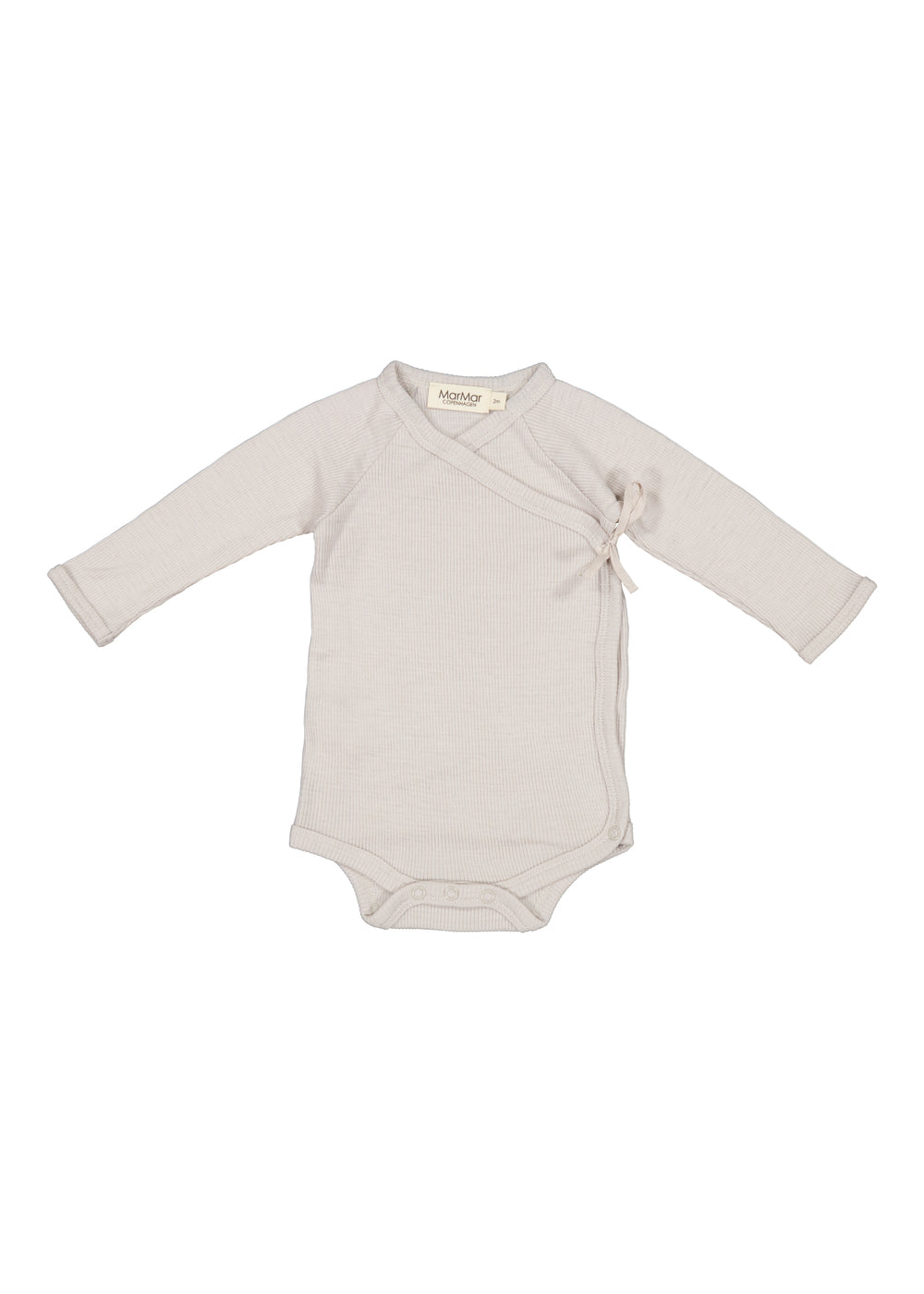 Langærmet bodystocking til nyfødte med slå-om-lukning. Lukkes med trykknapper og bindebånd.