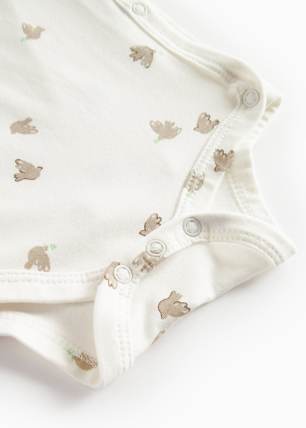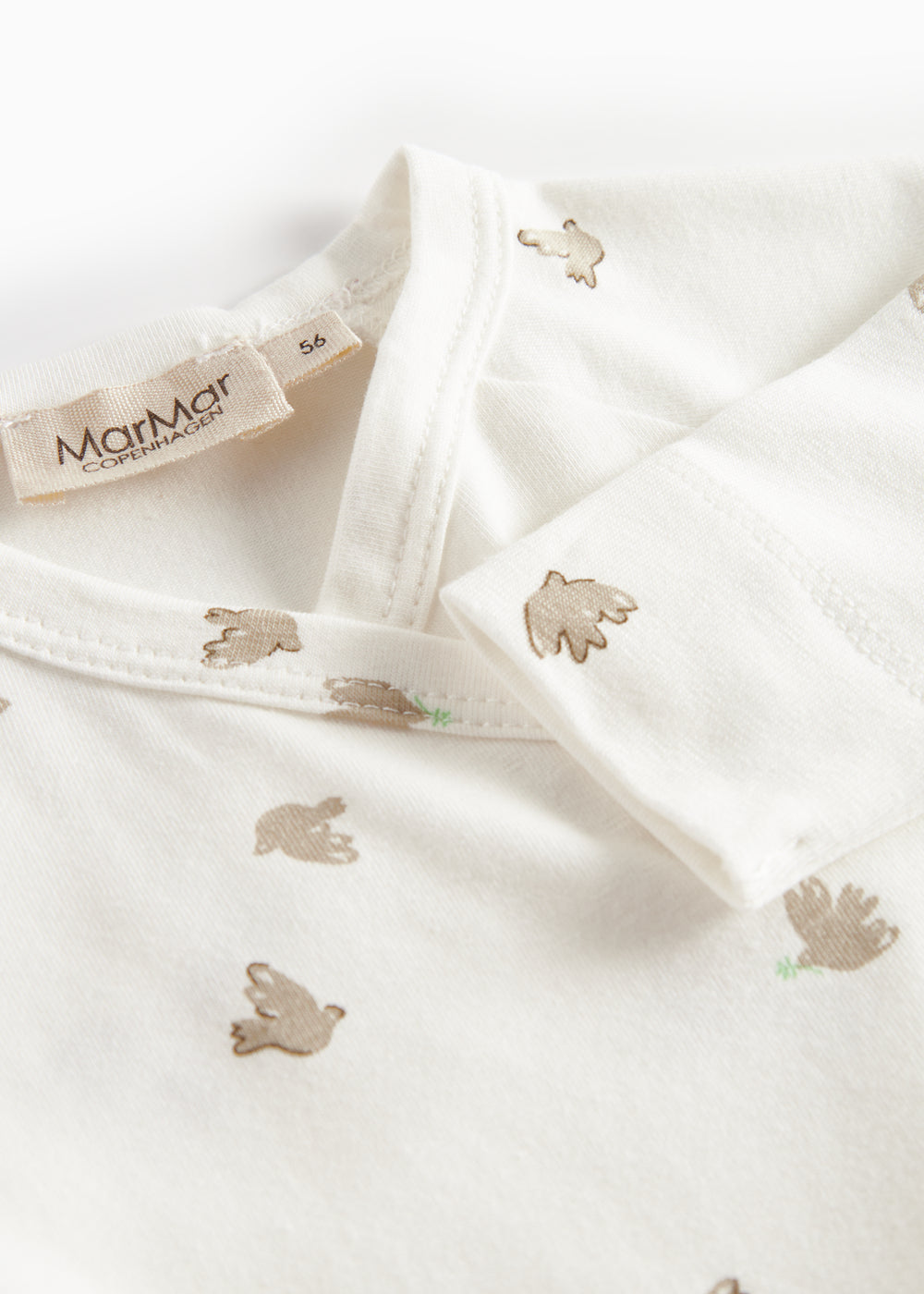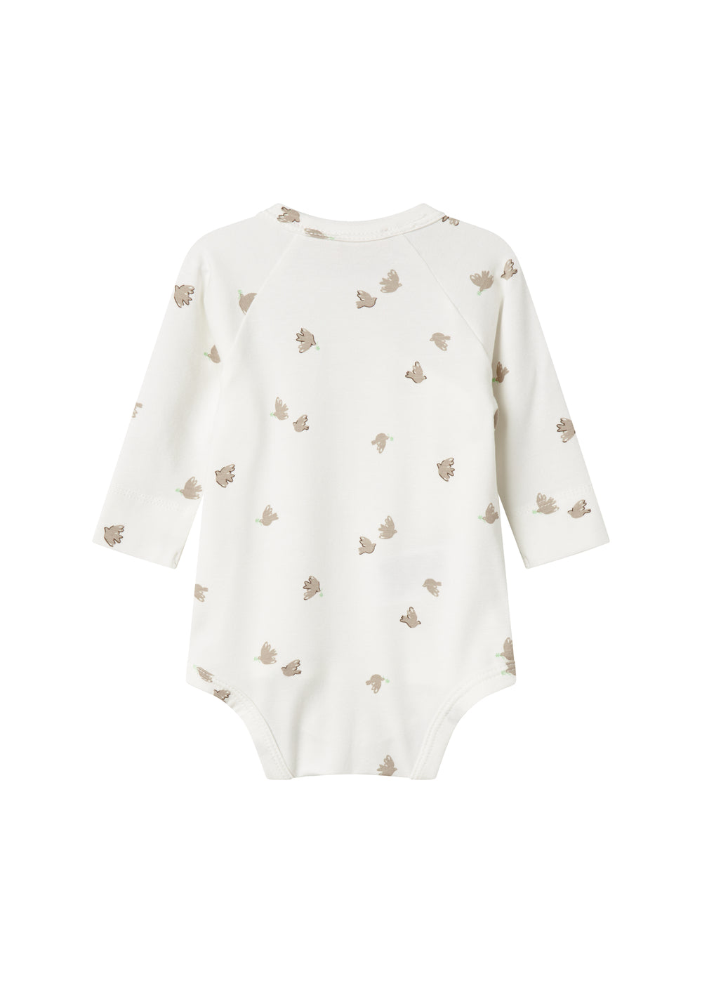 Langærmet bodystocking til nyfødte med slå-om-lukning. Bodystockingen lukkes med trykknapper, har et fint print og er både blødt, strækbart og behageligt at have på.