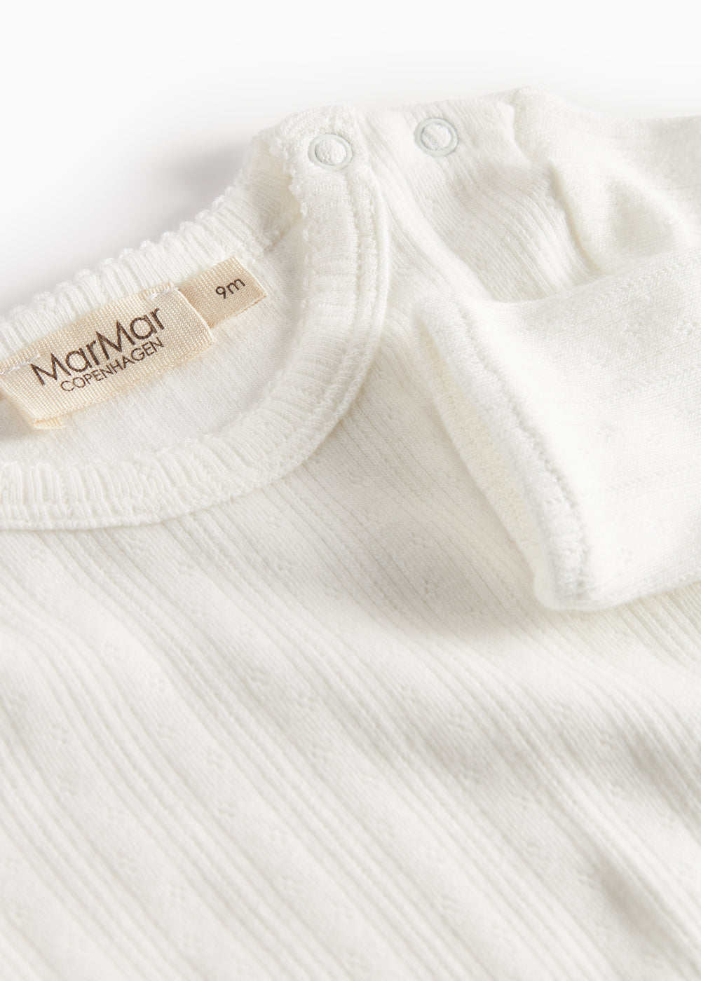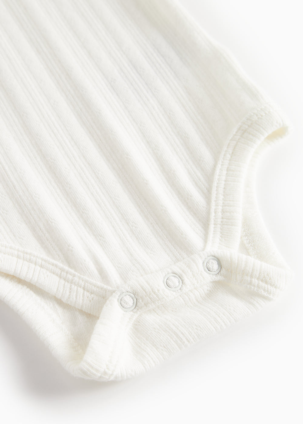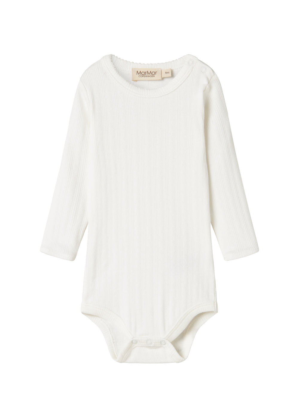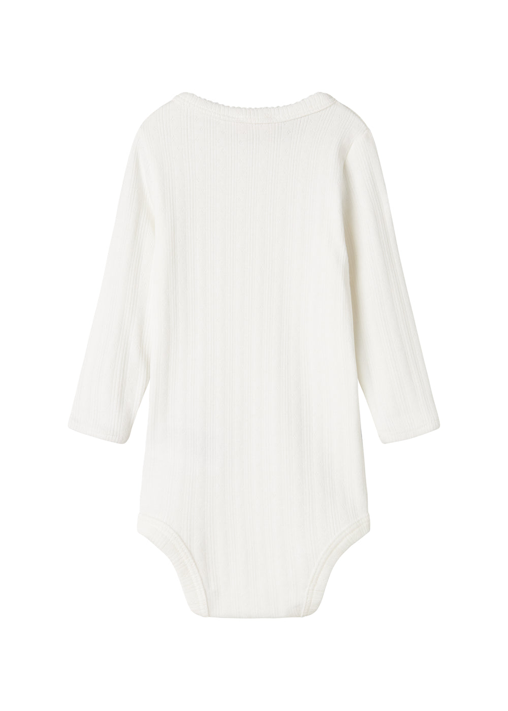 Enkel langærmet pointelle baby bodystocking, der bliver lukket med trykknapper på venstre skulder samt mellem benene for nem bleskiftning. Bodystockingen har picotkanter og er blød, strækbar og behagelig at have på.