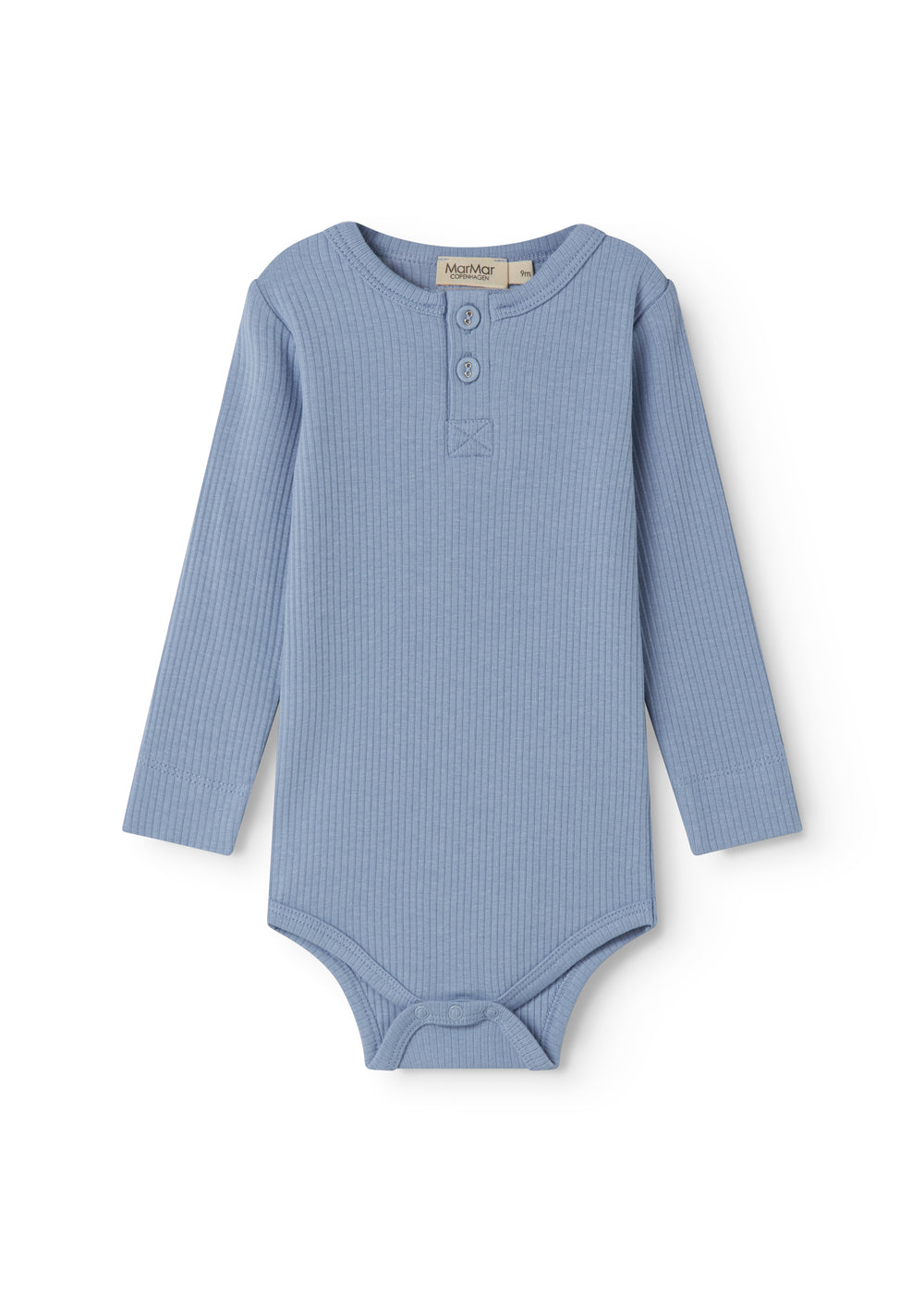 Langærmet baby modal bodystocking med stolpe knaplukning, der bliver lukket med trykknapper mellem benene for nem bleskiftning. Bodystockingen er både ribstrikket, blød, holder form og farve og har elastan i sig som gør den strækbar og behagelig at have på.