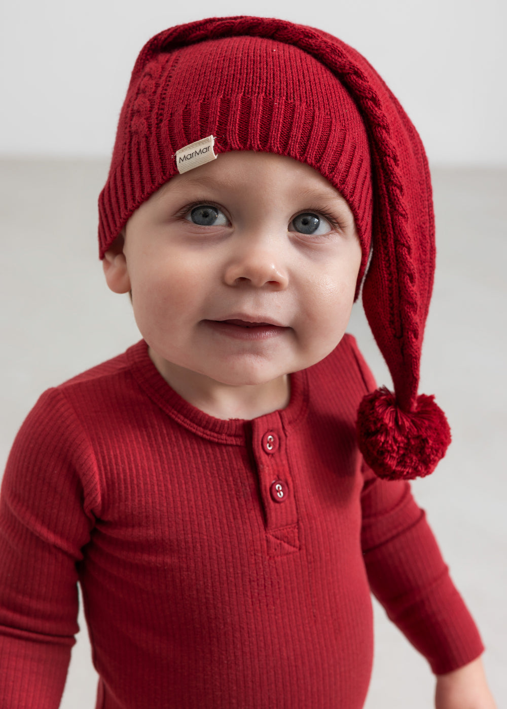 Baby iført rød ribbet body med stolpeknapper og nissehue