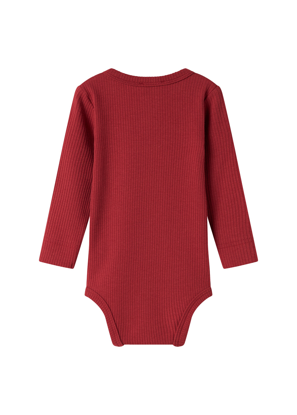Langærmet baby modal bodystocking med stolpe knaplukning, der bliver lukket med trykknapper mellem benene for nem bleskiftning. Bodystockingen er både ribstrikket, blød, holder form og farve og har elastan i sig som gør den strækbar og behagelig at have på.