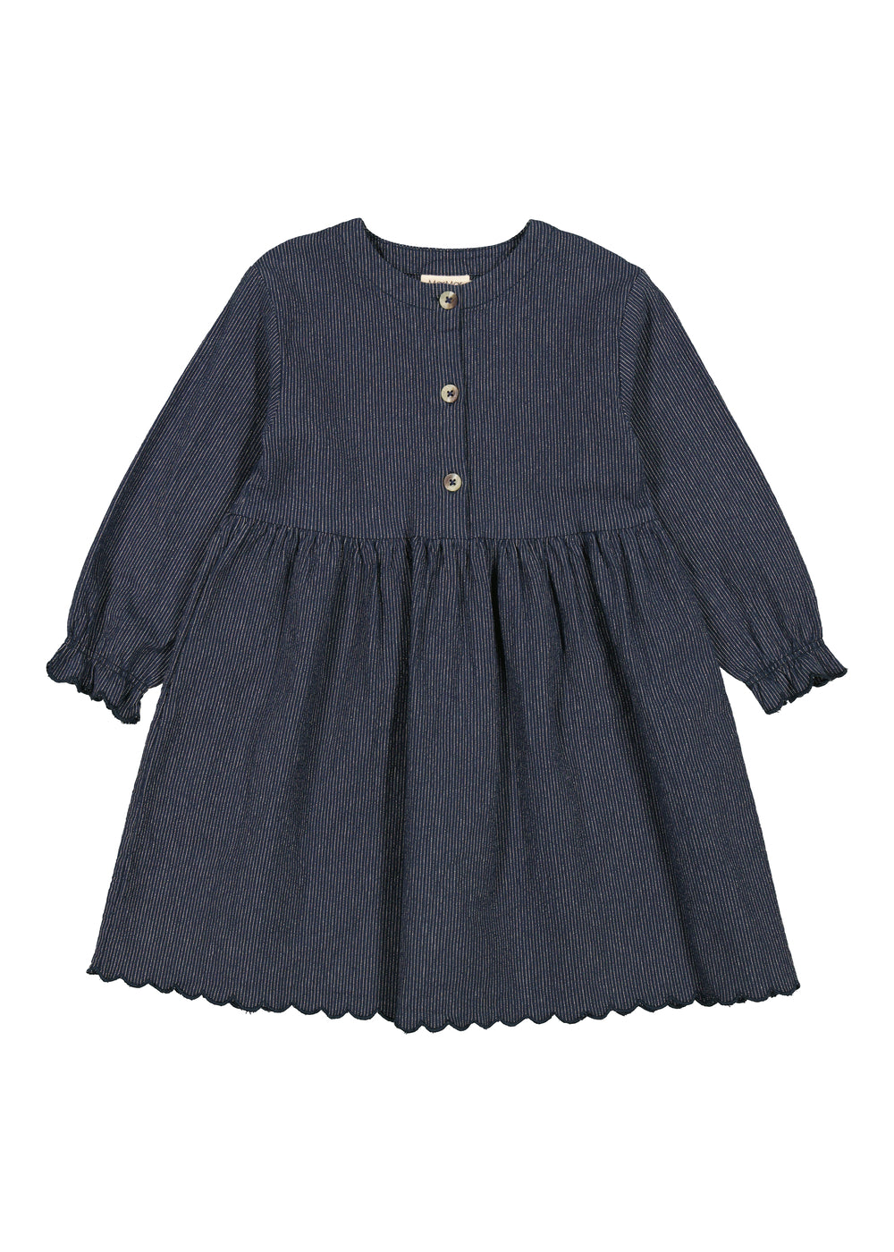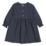 Langærmet stribet chambray denim kjole med knaplukning foran og fint snit. Kjolen har et sødt bølge broderi forneden samt på ærmerne. Kjolens længde går til over knæet