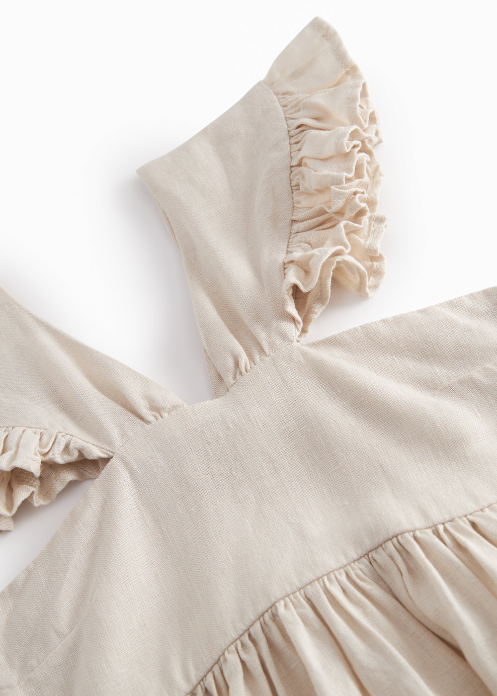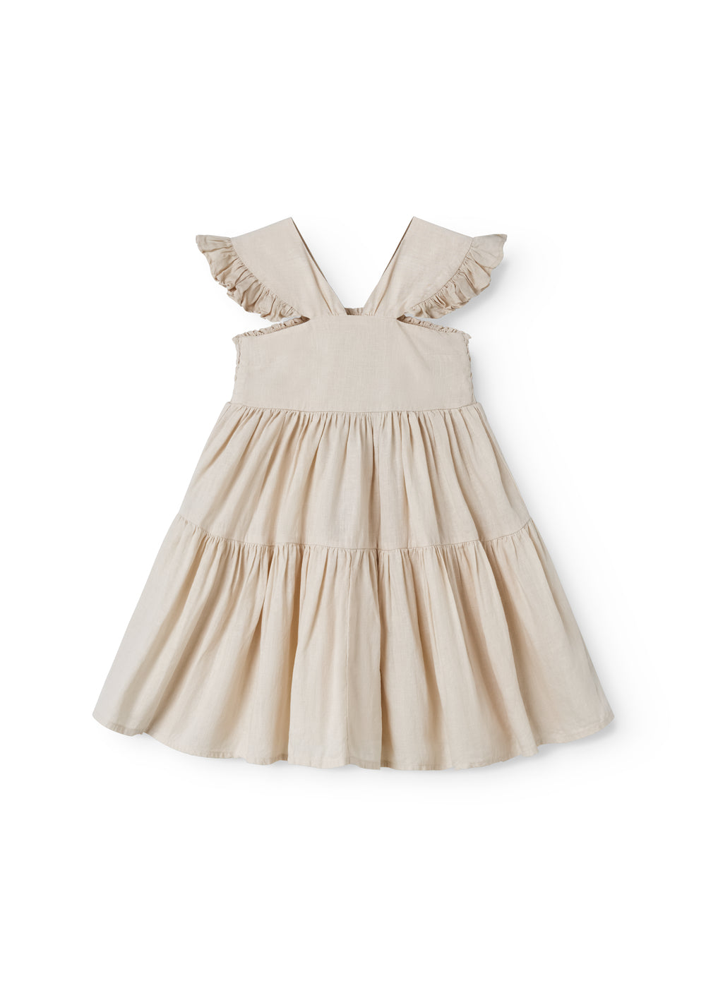 Ærmeløs kjole til børn i en luftig og behagelig hør kvalitet, med brede stropper og flæser på skulderen. Kjolen har elastik smock-detalje bagpå for god pasform. Kjolens længde går til over knæet.