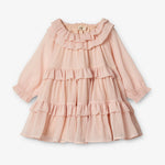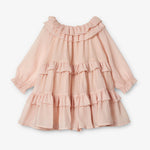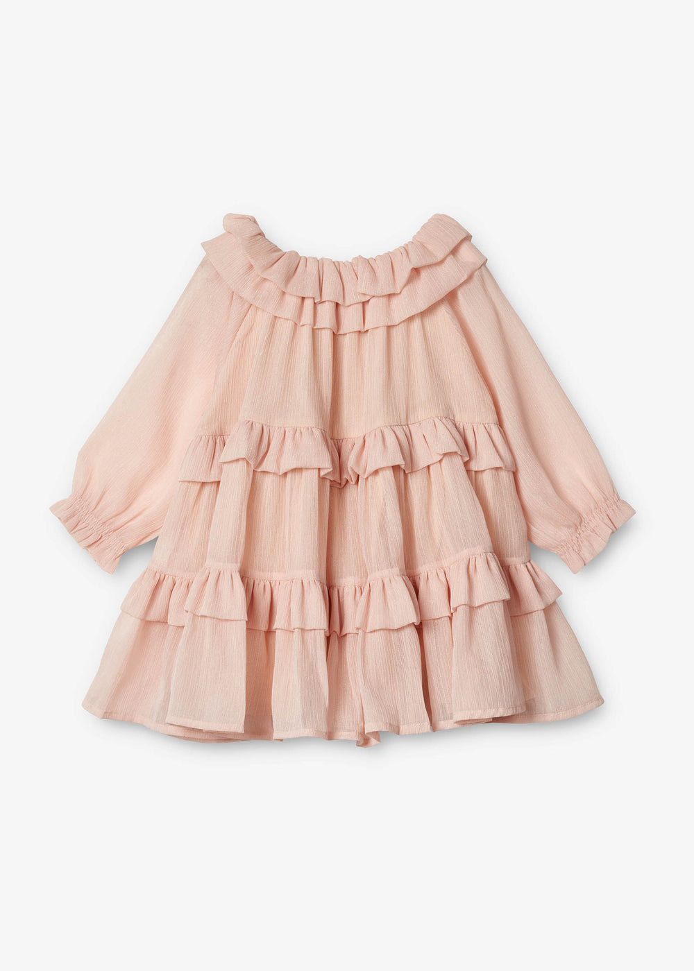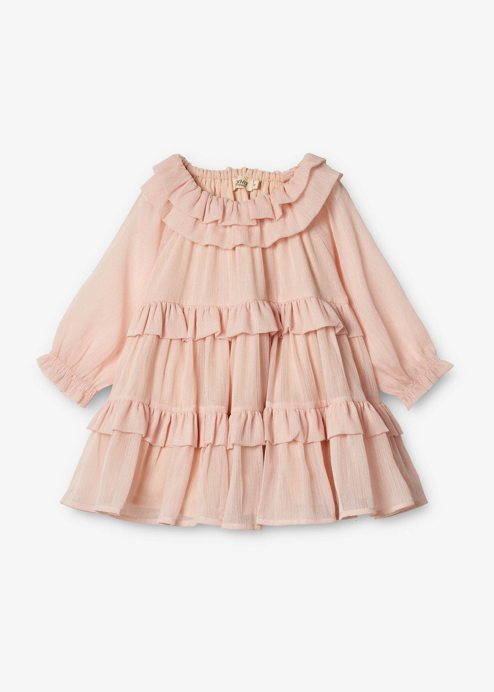 Kjole med masser af volumen, crepet chiffon og glitter striber. Kjolen har inderfoer, elastikkrave samt elastik ved ærmer der gør den behagelig at have på. Kjolens længde går til lige under knæet