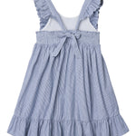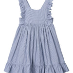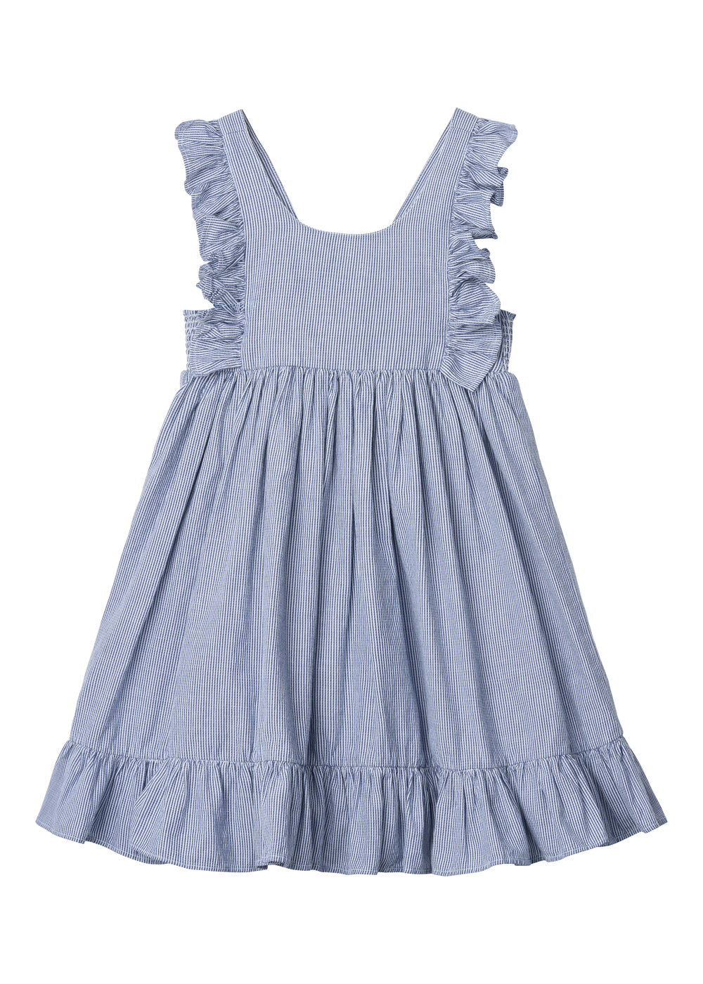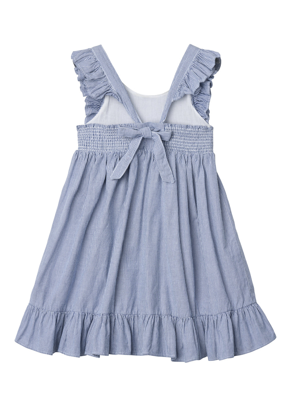 Stropkjole med vævede striber, en løs pasform og søde flæser på skuldrestropperne og i bunden af skørtet. Kjolens længde går til over knæet. Kjolen er i en blød og let bomulds kvalitet
