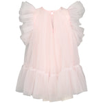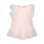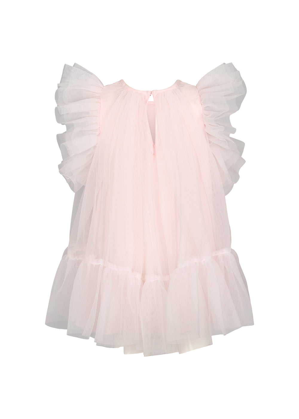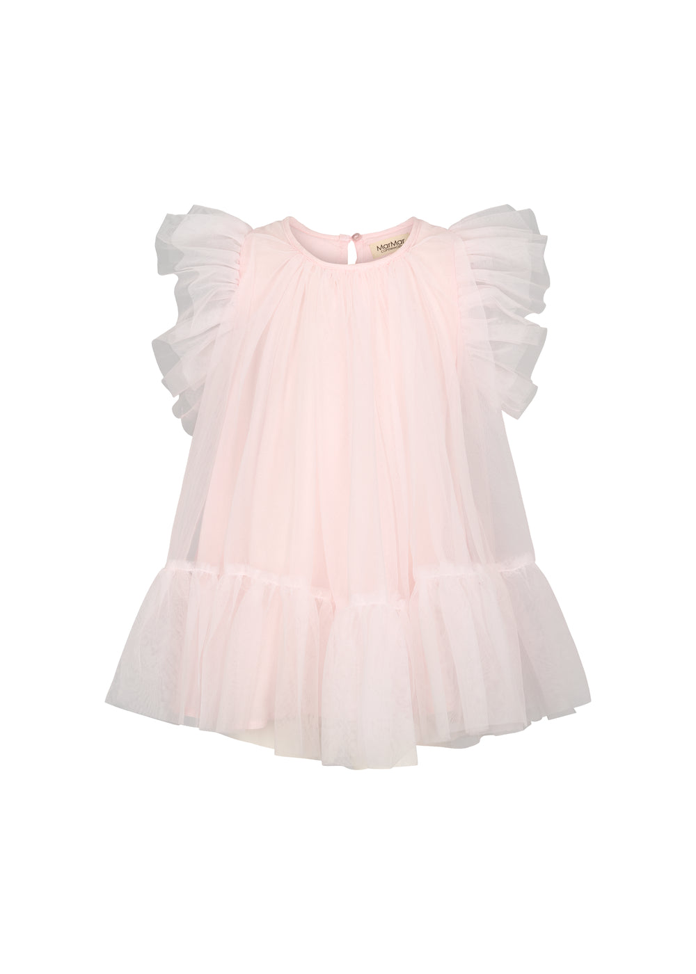 Fin og festlig kortærmet kjole til de mindste med mange lag tyl for volumen. Kjolen har flotte tylflæser på ærmerne og lukkes med knaplukning bagpå. Kjolen længde går til over knæene
