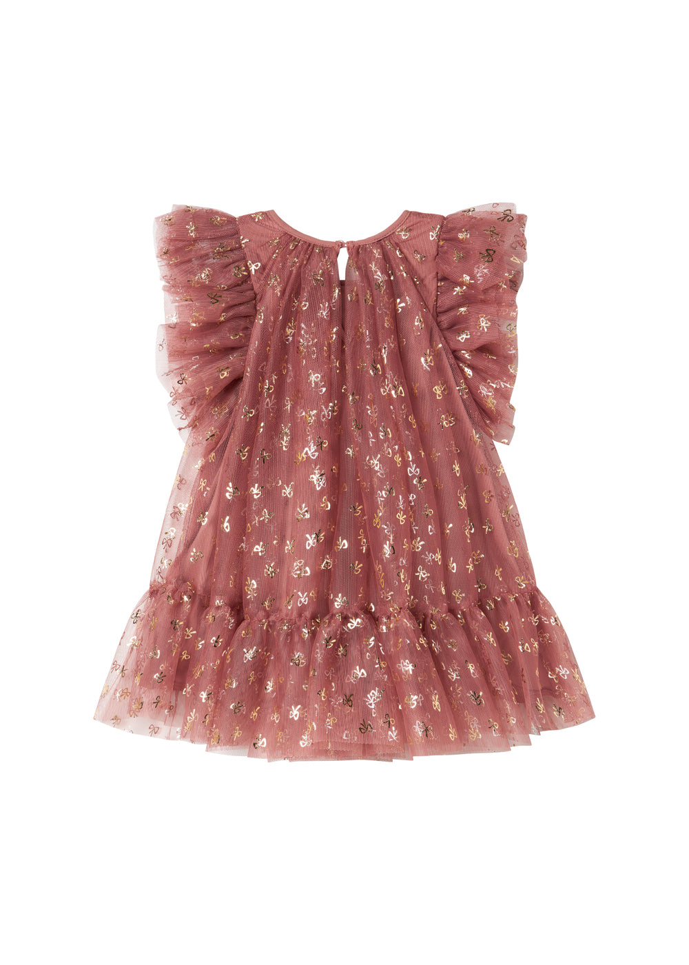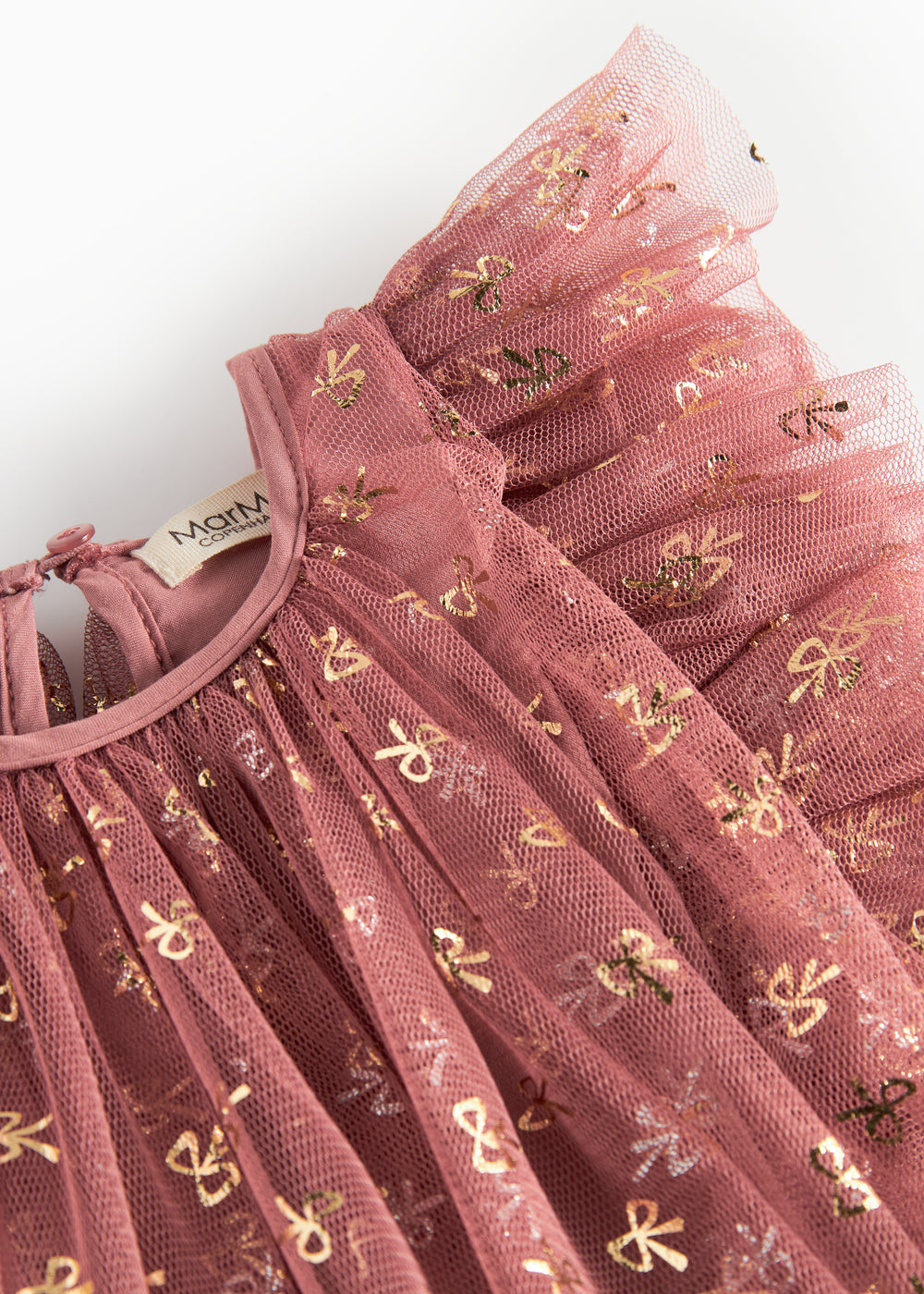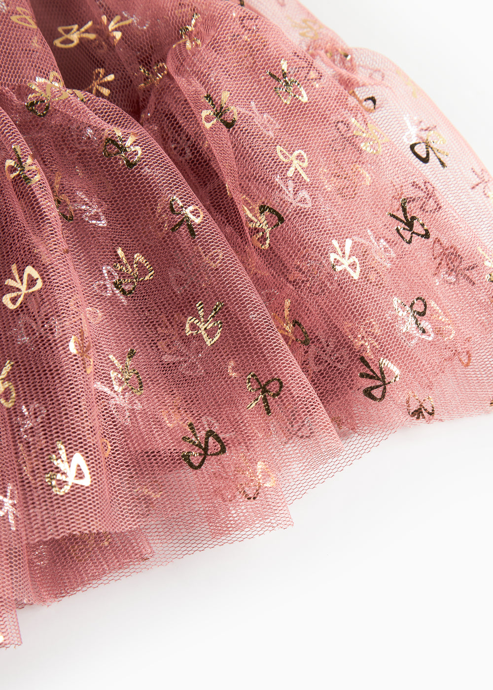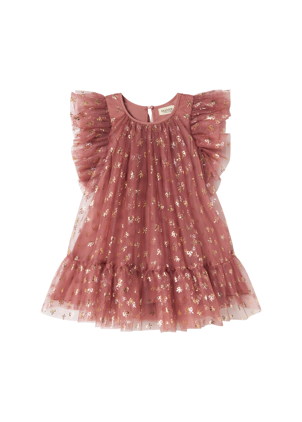 Rosa festlig babykjole i tyl med flæser og guldprint