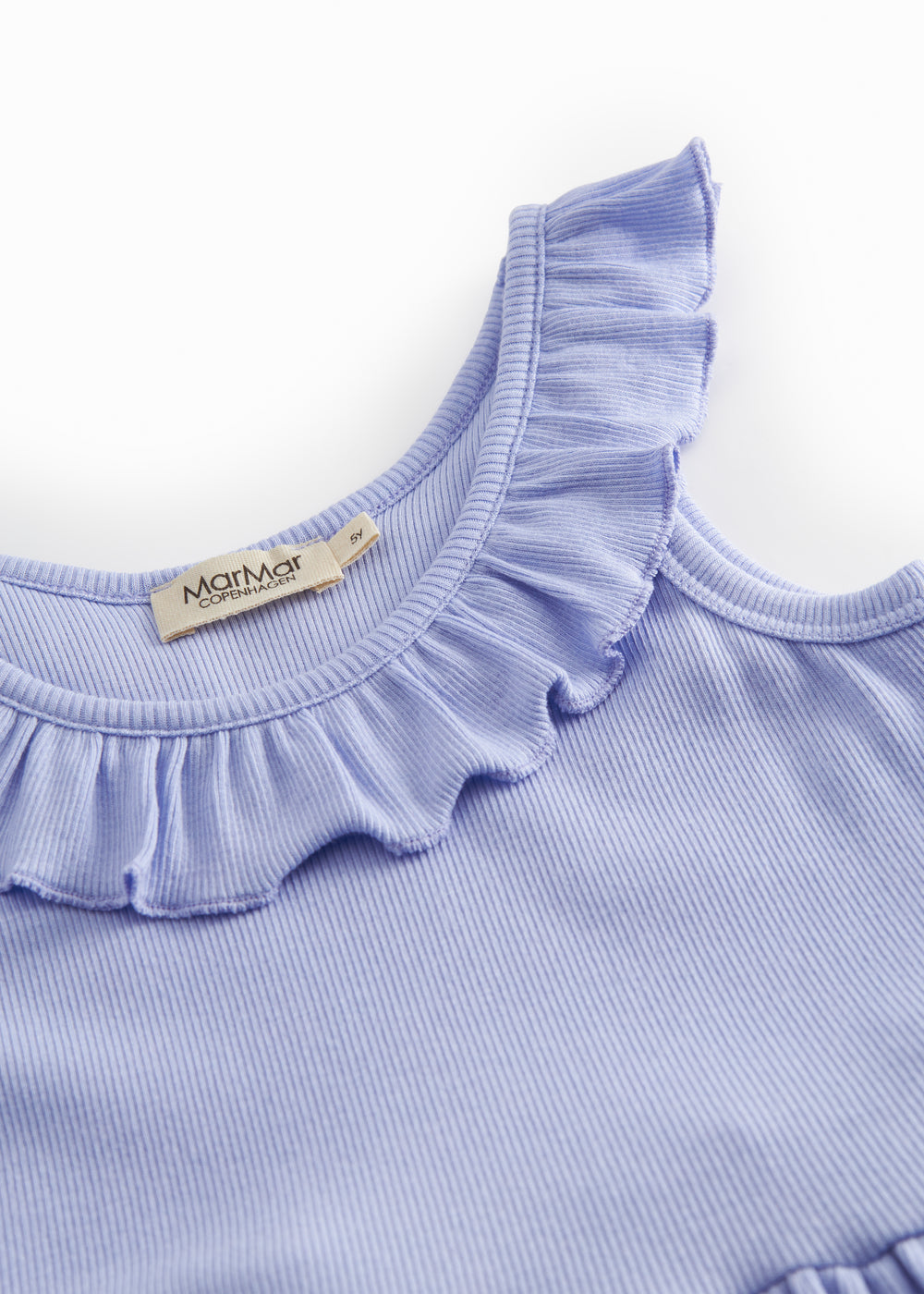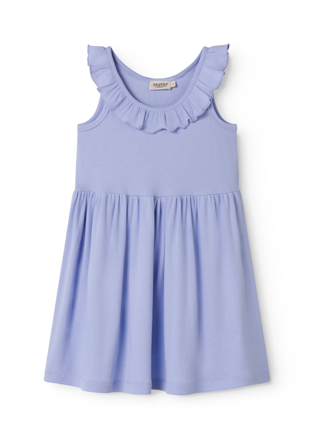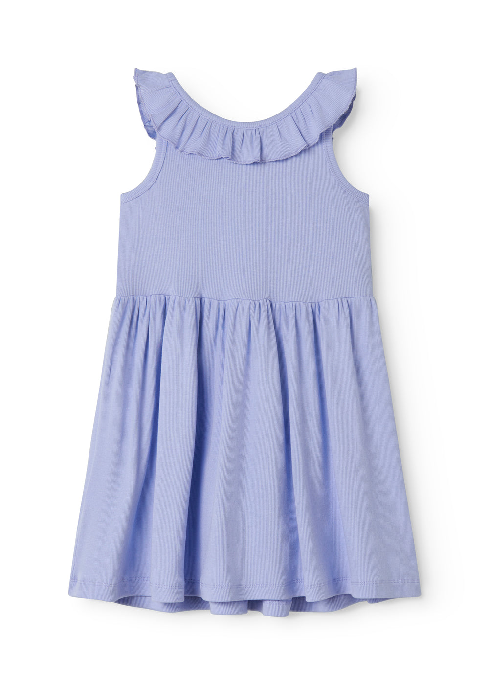 Kortærmet stropkjole til børn med flæsekrave. Kjolens længde går til over knæet. Kjolen er både blød, holder form og farve og har elastan i sig som gør den strækbar og behagelig at have på.