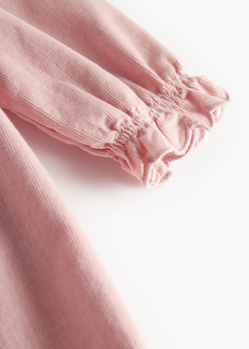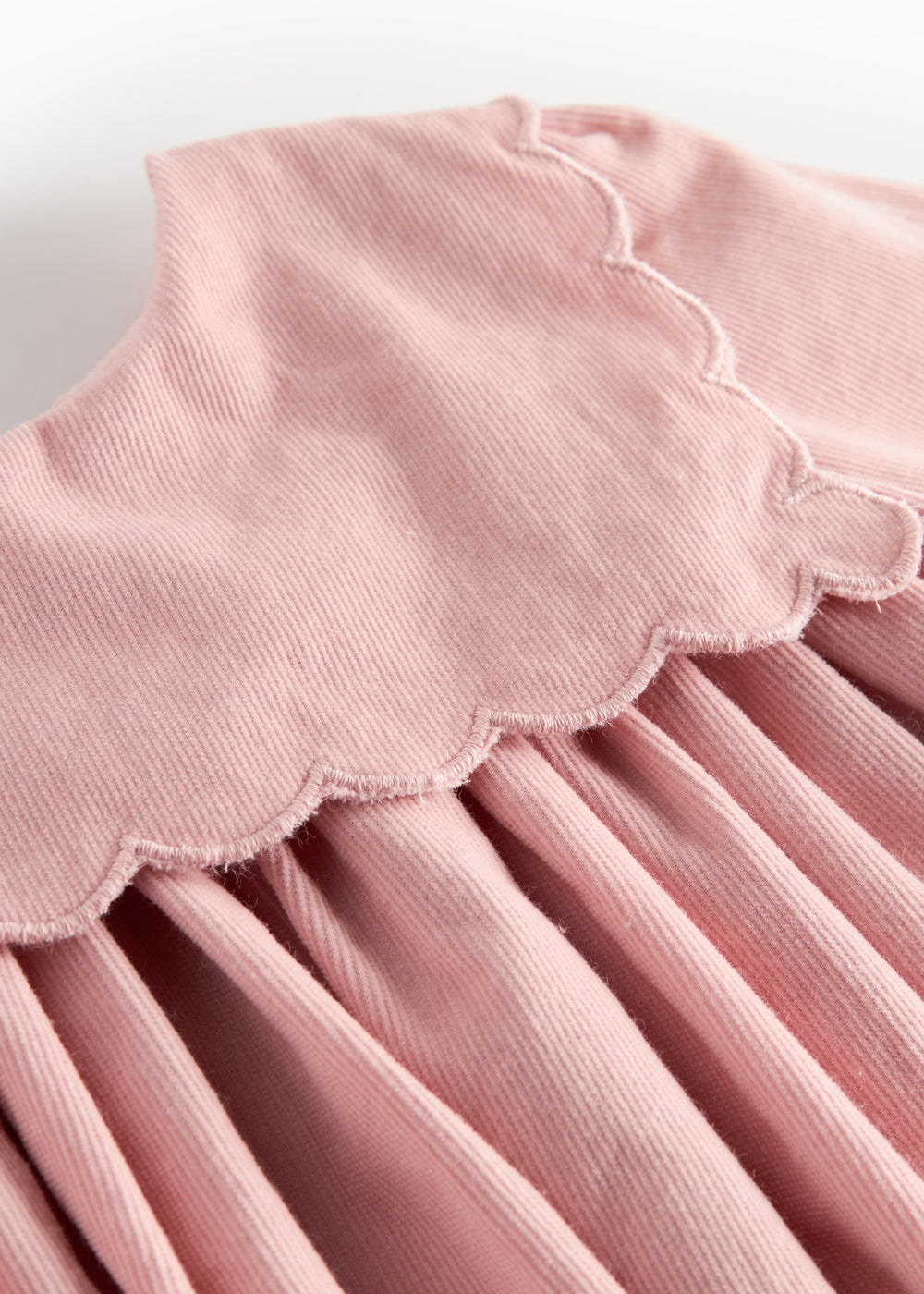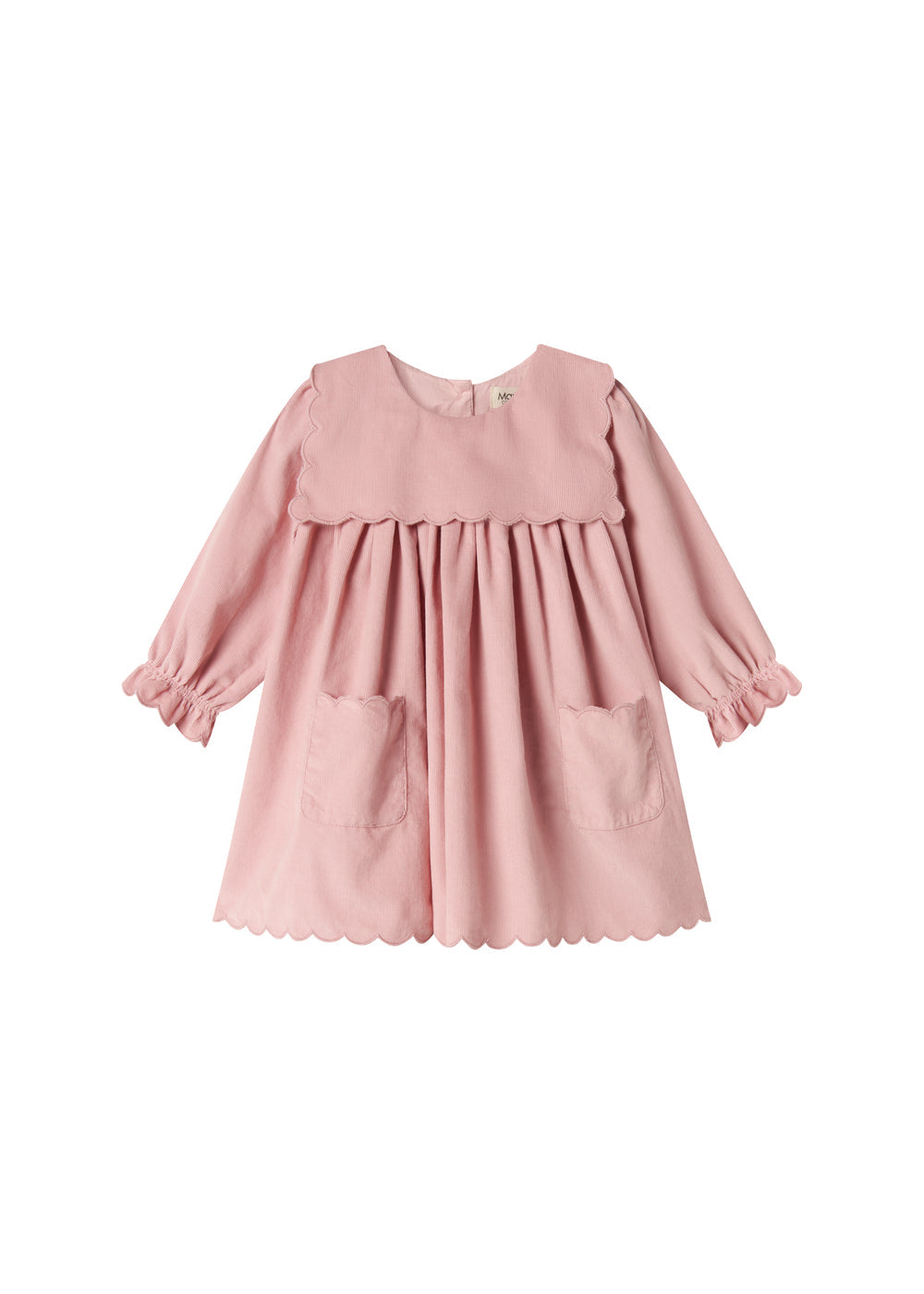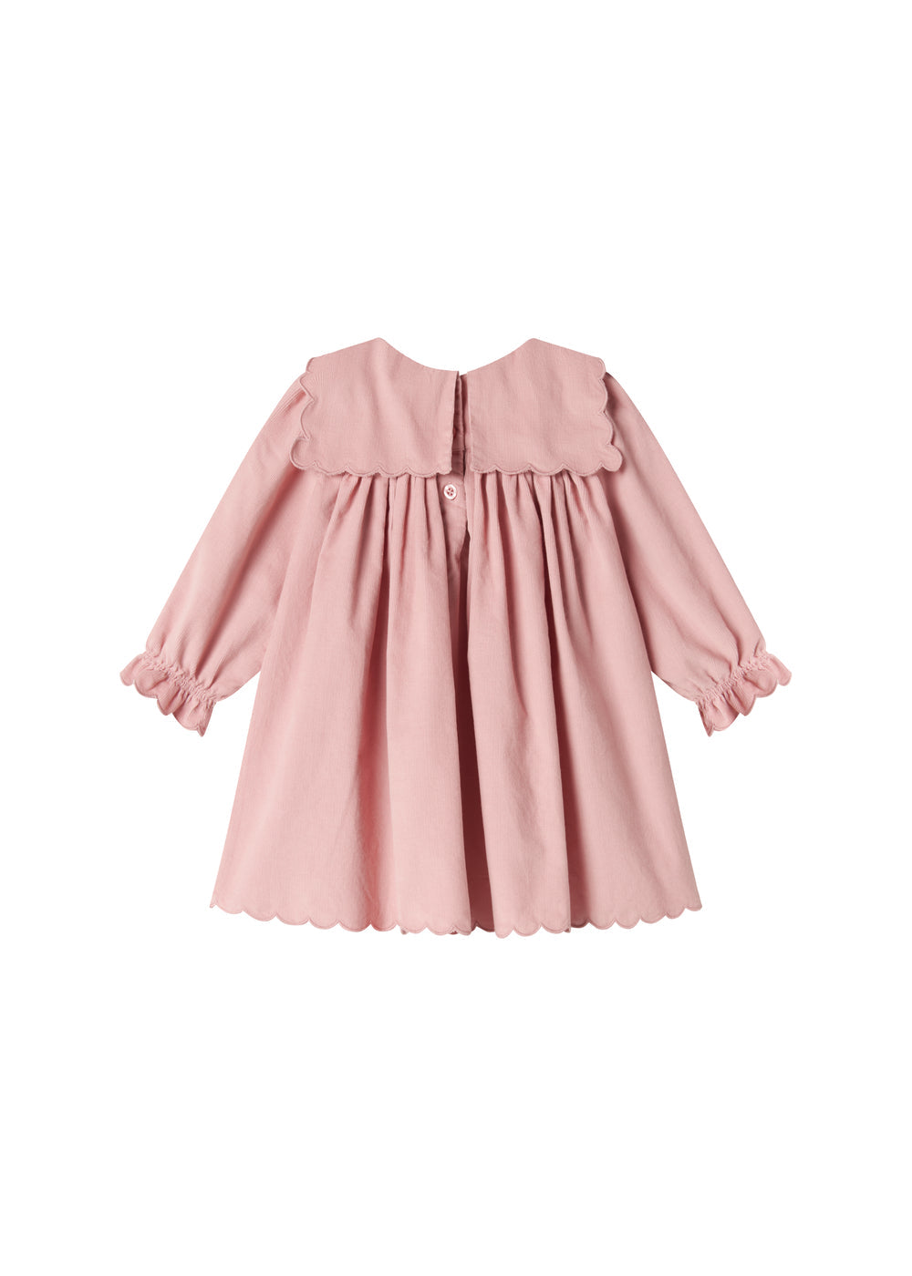 Langærmet kjole til de mindste i babyfløjl med løs pasform og fin stor dekorativ krave med bølgede detaljer. Kjolen har to lommer foran og knaplukning bagpå. Kjolens længde går til over knæet.