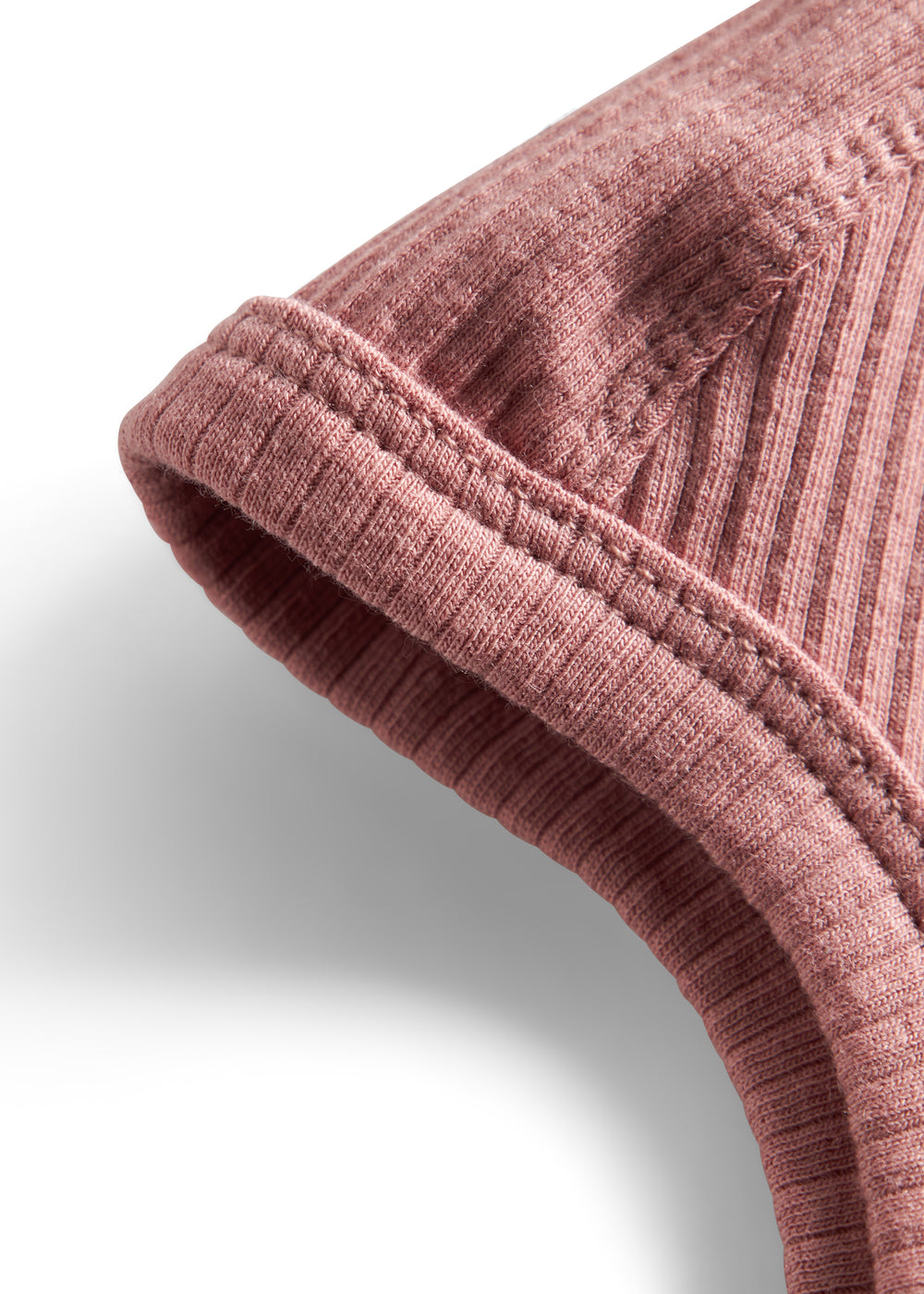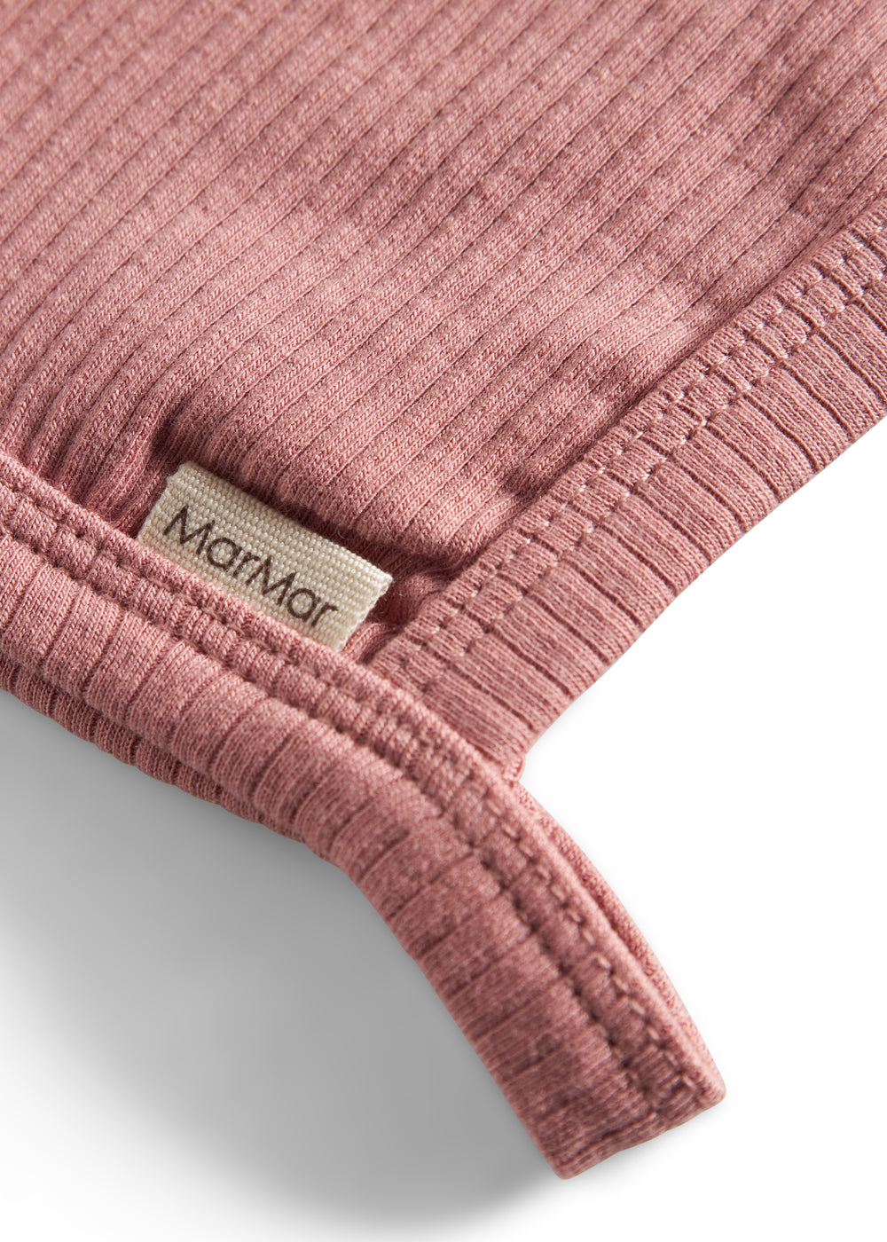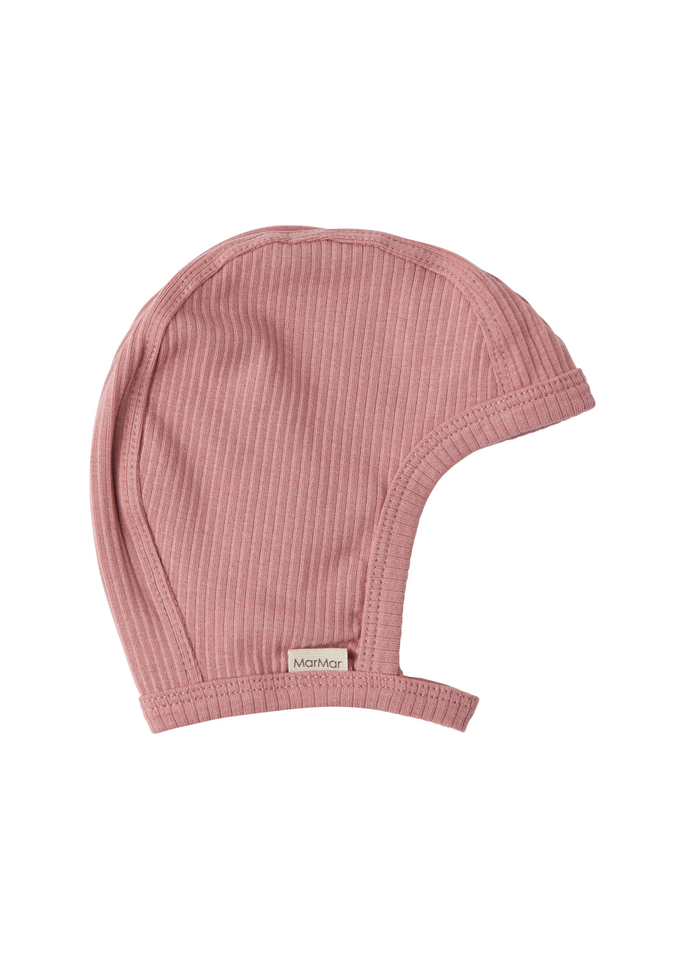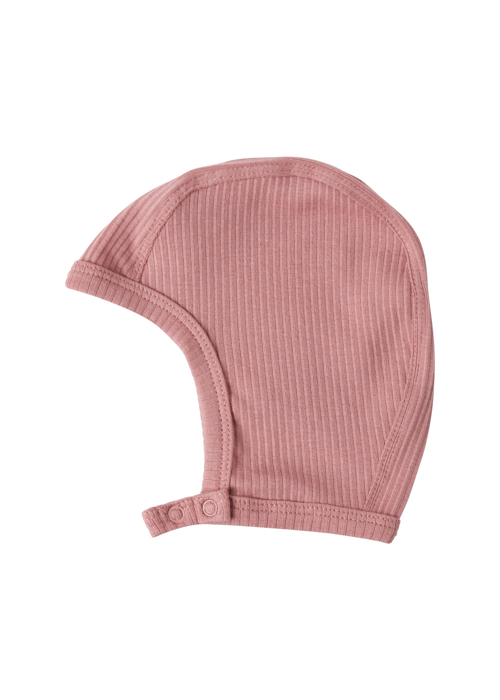 Fin lille baby hjelm som lukkes med trykknap i to længder. Huen er ribstrikket, blød, strækbar og behagelig at have på.