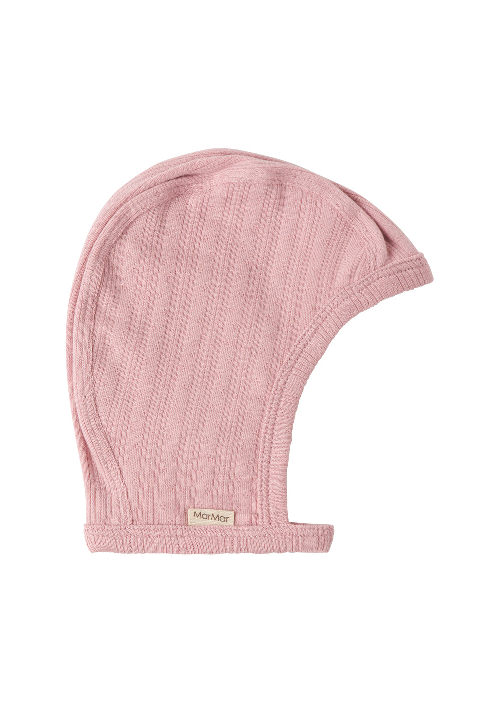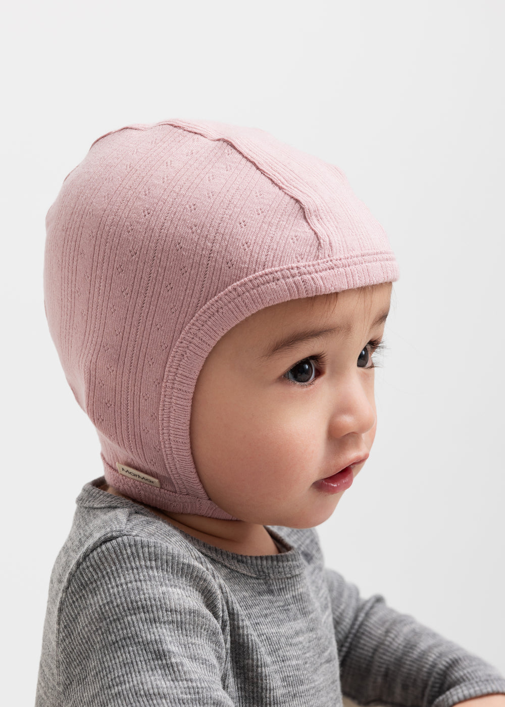 Fin lille pointelle baby hjelm som lukkes med trykknap i to længder. Hjelmen er blød, strækbar og behagelig at have på.