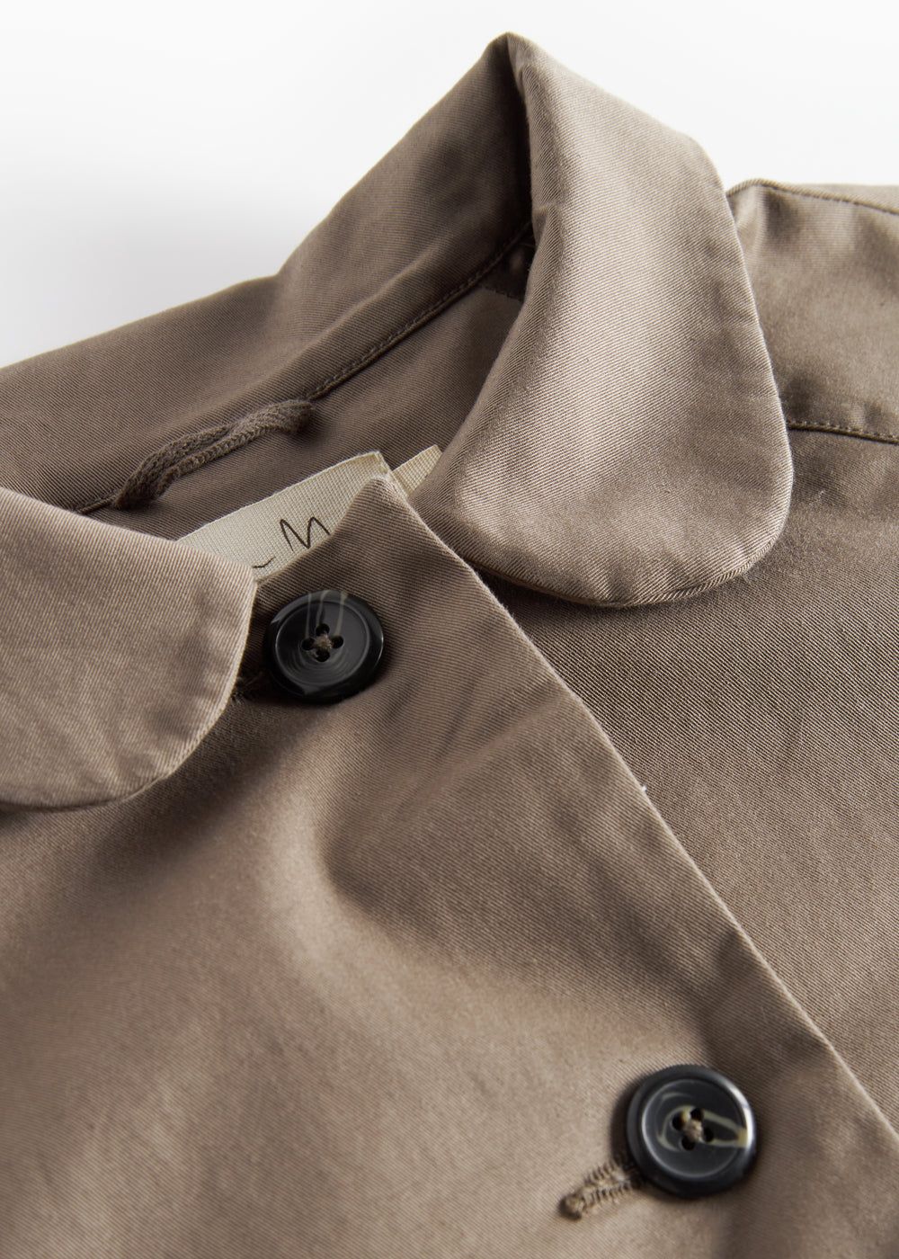 Detaljebillede af krave på kaki chino frakke