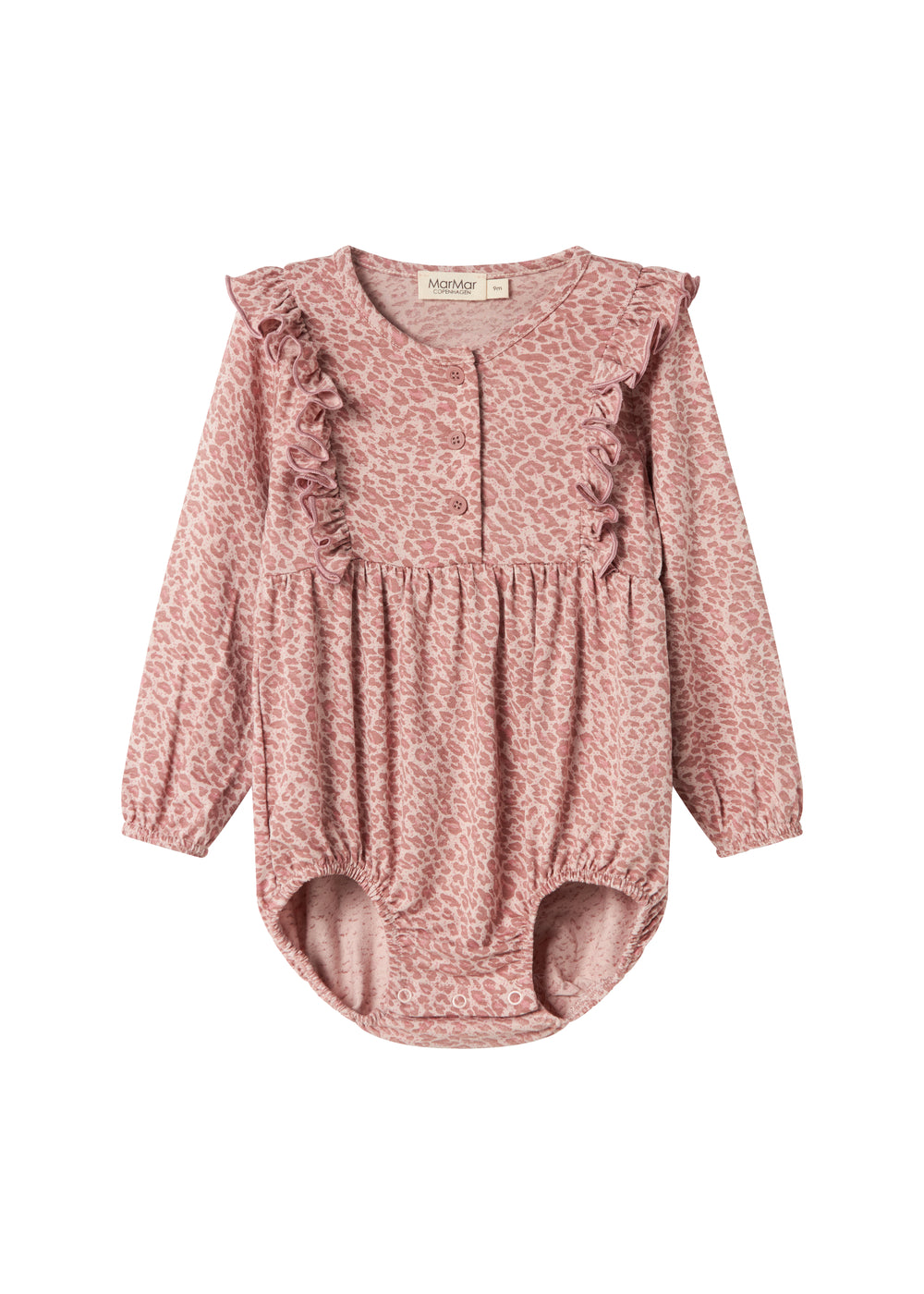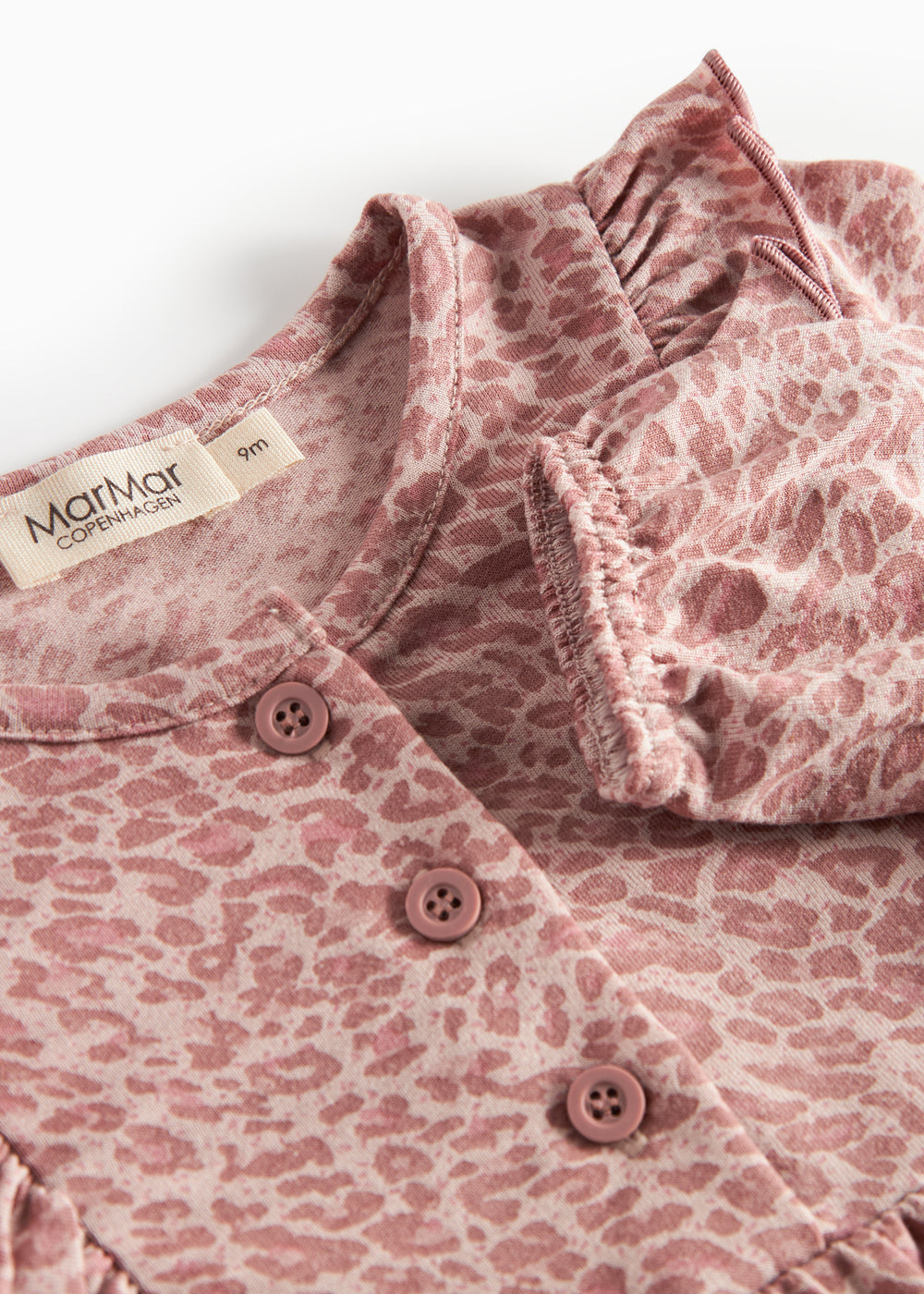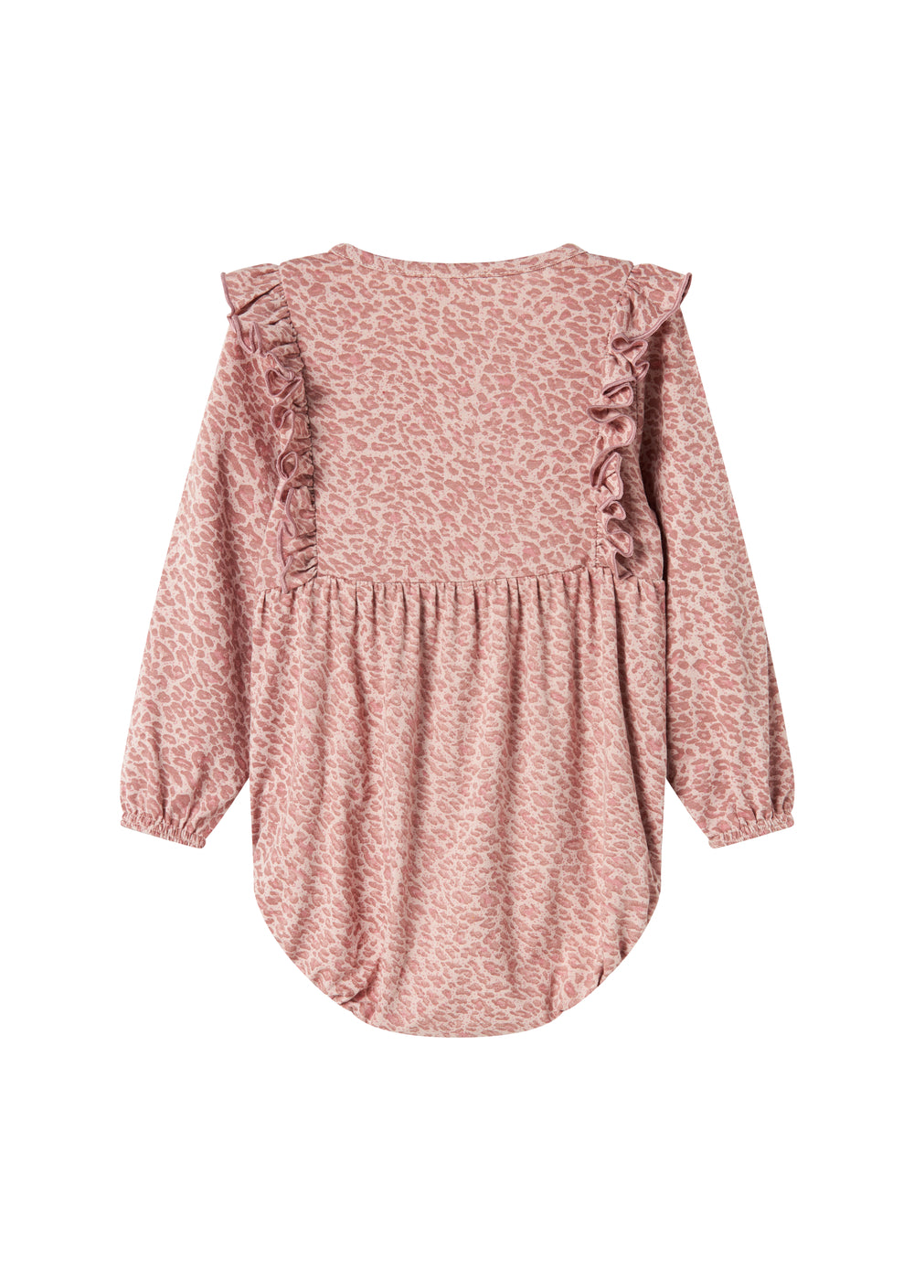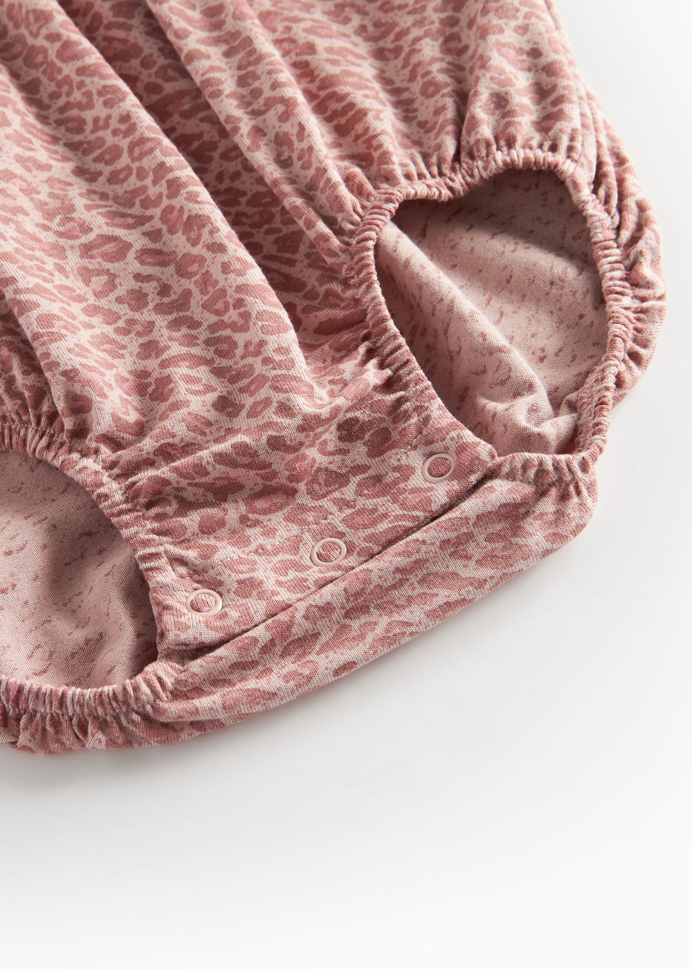 Langærmet leopard romper med knapper og flæsedetaljer foran. Romperen bliver lukket med trykknapper mellem benene for nem bleskiftning.