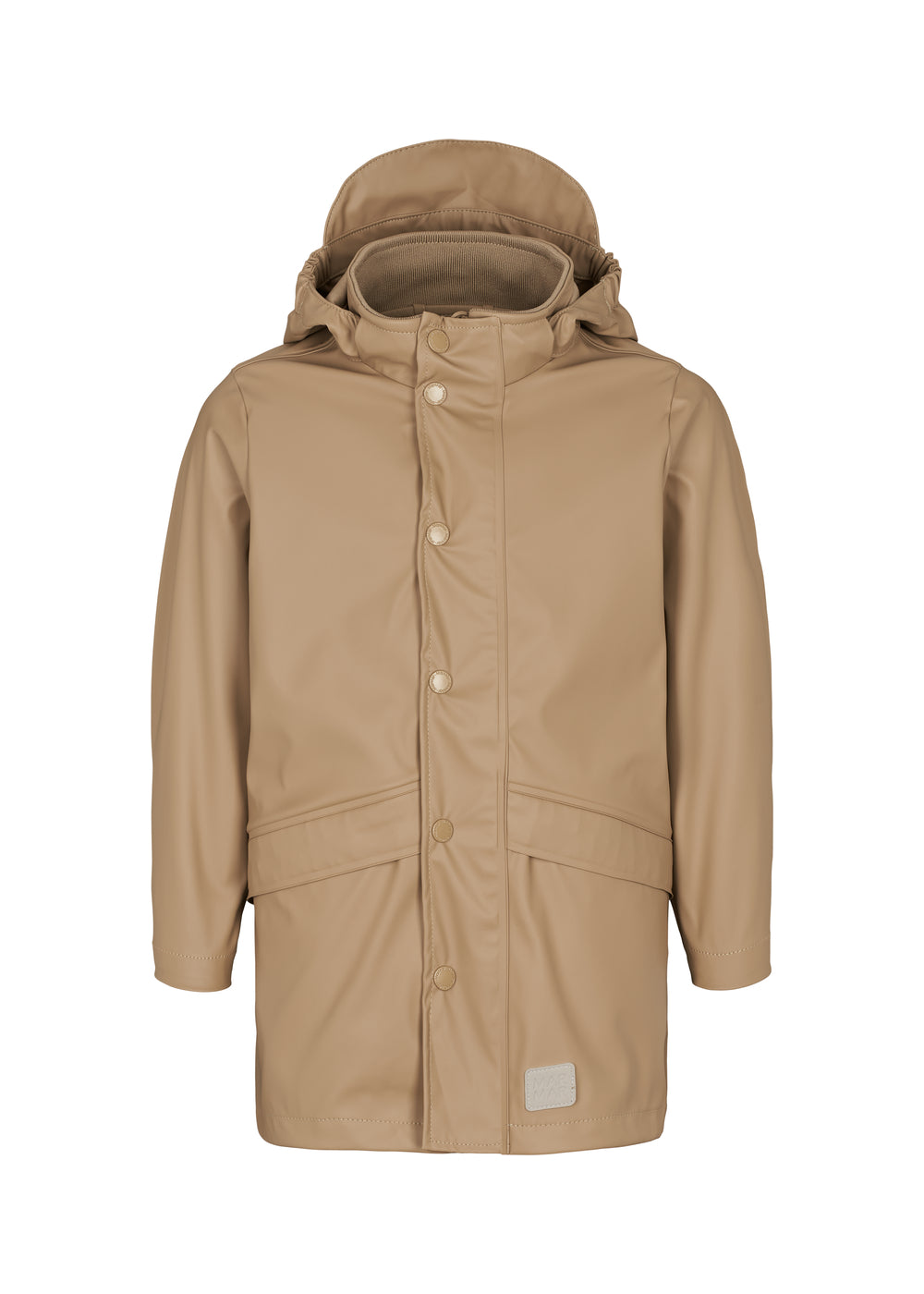beige regnjakke til børn med knaplukning og aftagelig hætte