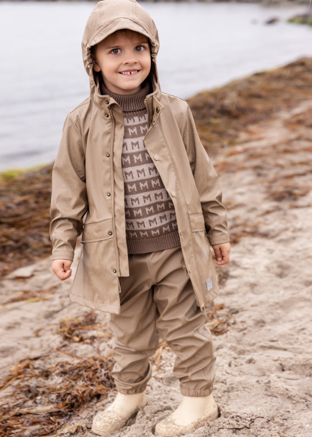 To børn iført regntøj på stranden, det ene barn i beige regnjakke og bukser