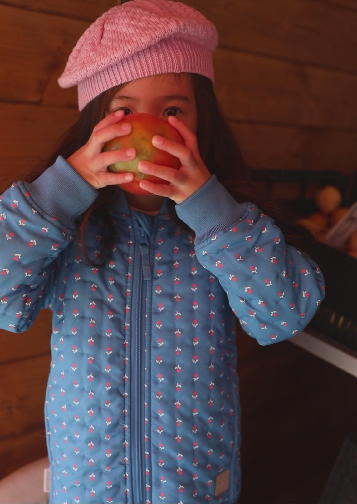 Termojakke til børn med smal pasform og med lommer i siden. Termojakken har et fint blomster print og kan ved hjælp af små velcro detaljer bukkes op bagpå, hvis man ikke ønsker at den er længere her. Termojakken lukkes med lynlås foran og fungerer perfekt som lun og praktisk overgangstøj.