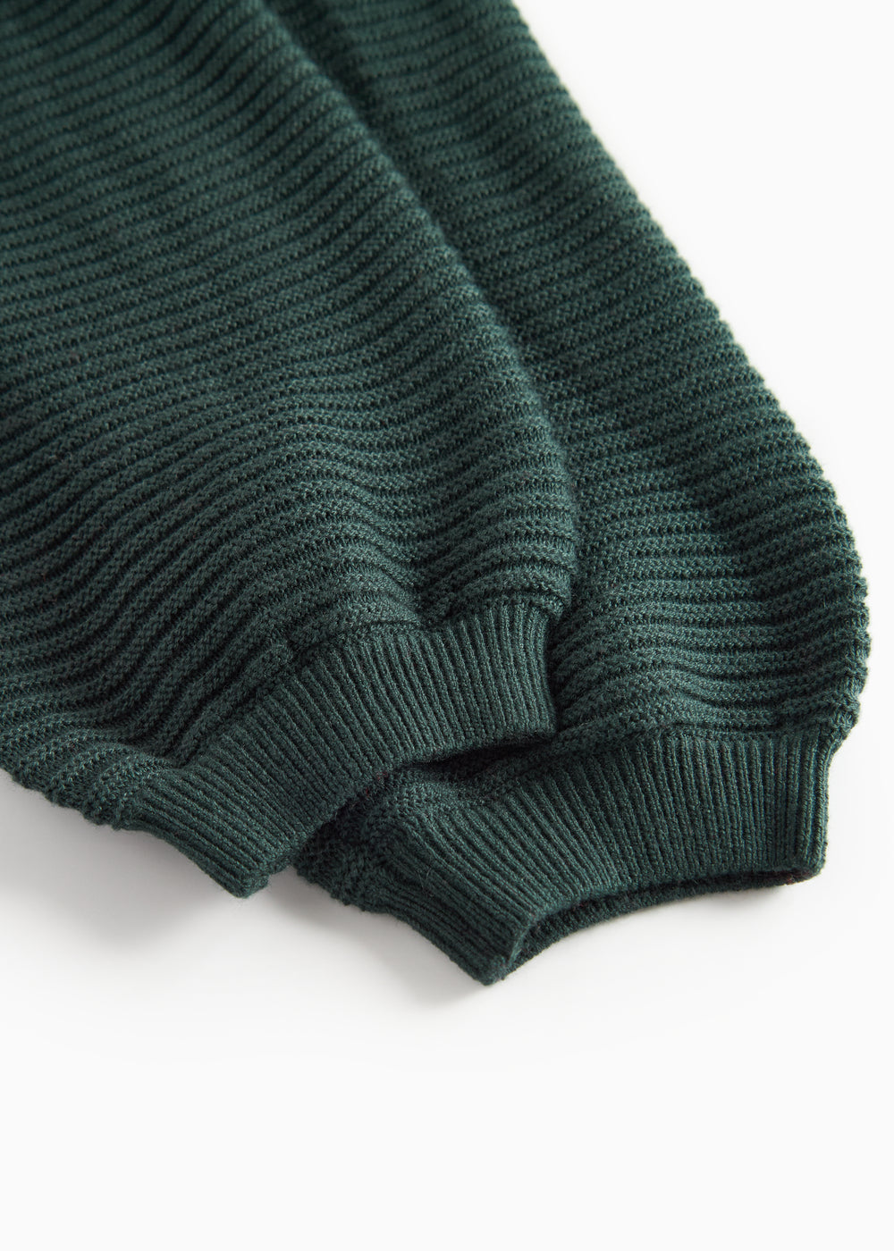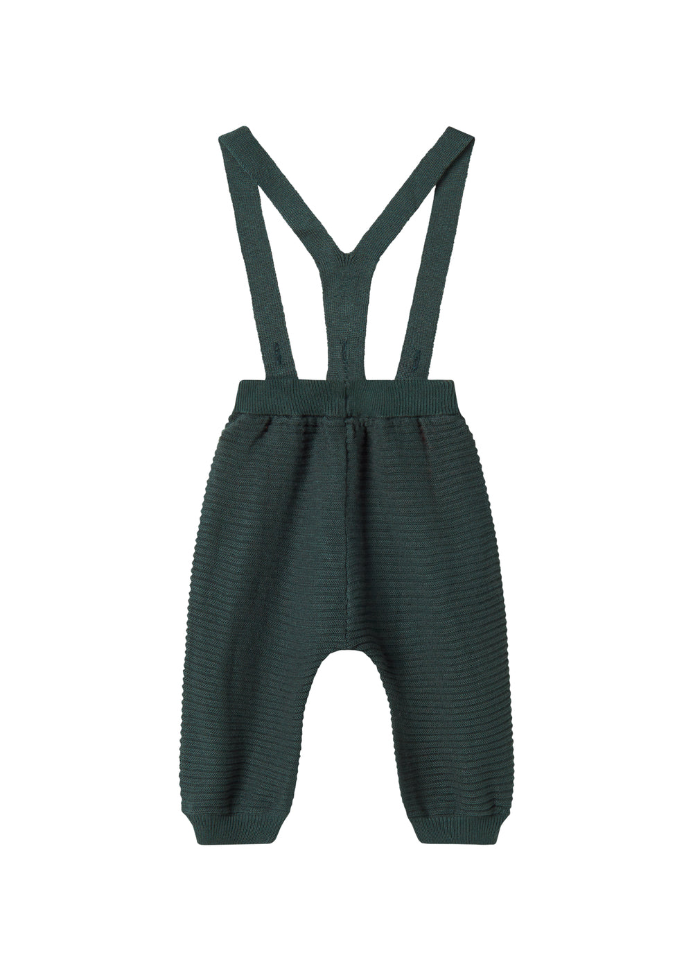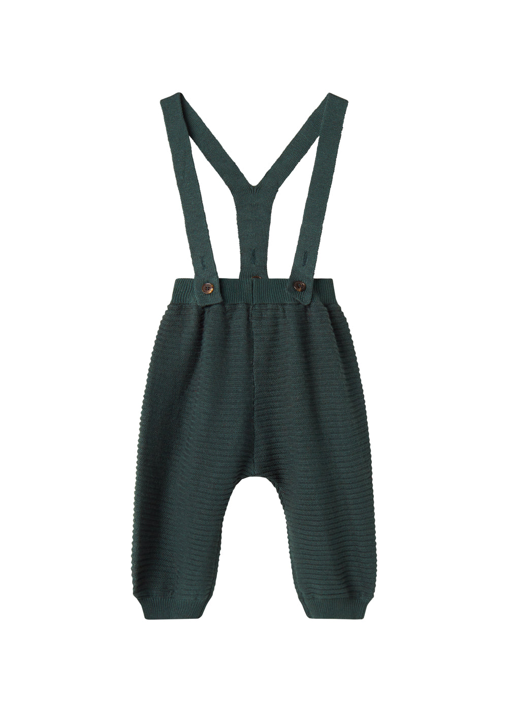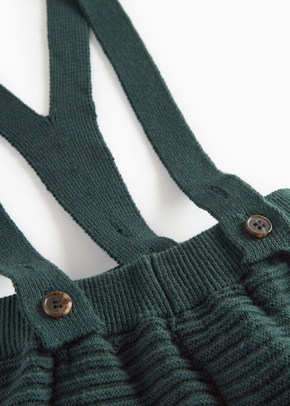 Løstsiddende strik bukser til baby med seler der har to knapluknings muligheder. Bukserne er bløde og behagelige at have på.