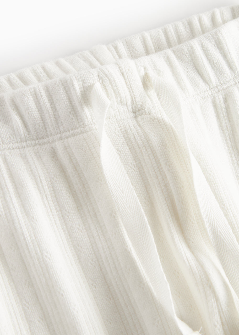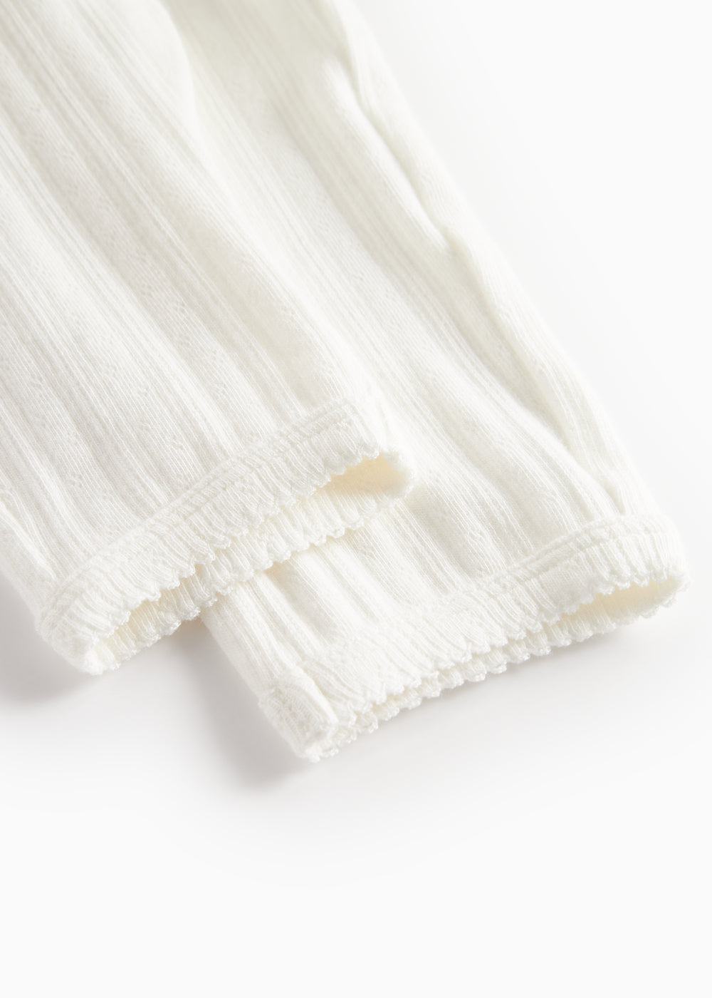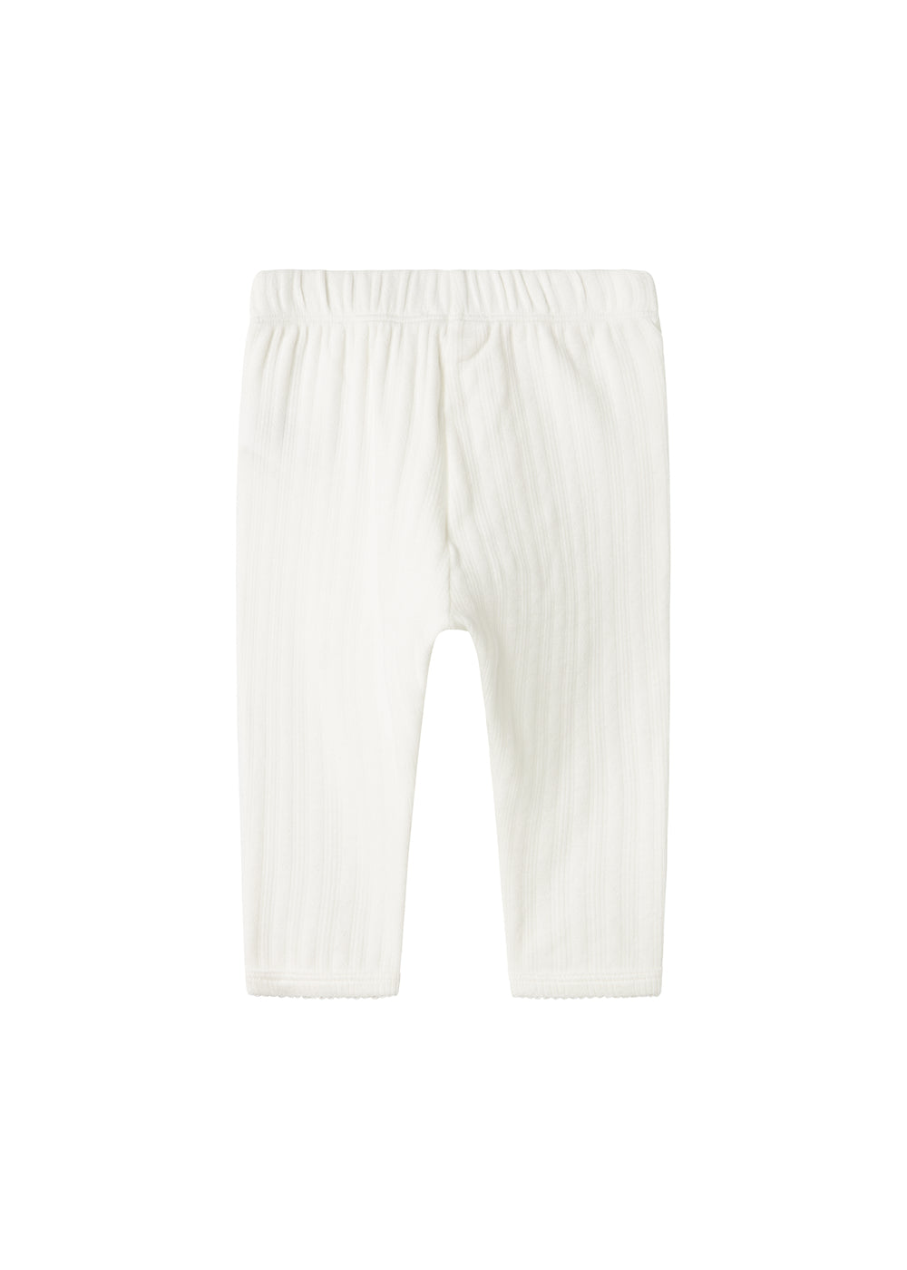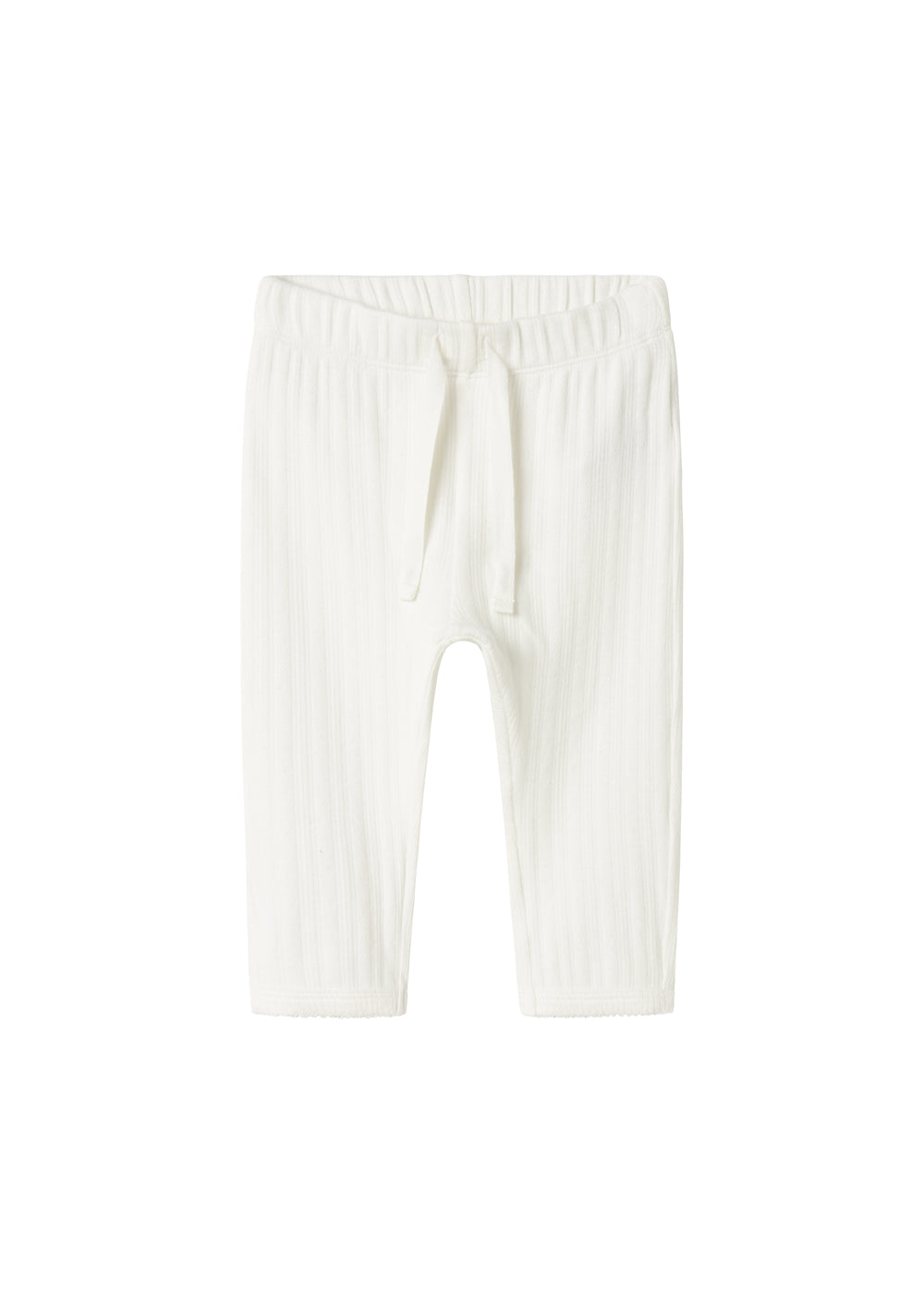 Behagelige pointelle baby bukser med elastik og et pyntebånd i livet. Bukserne er bløde, strækbare og behagelige at have på.