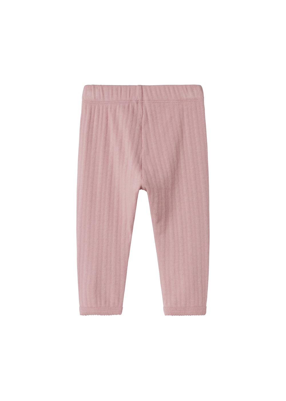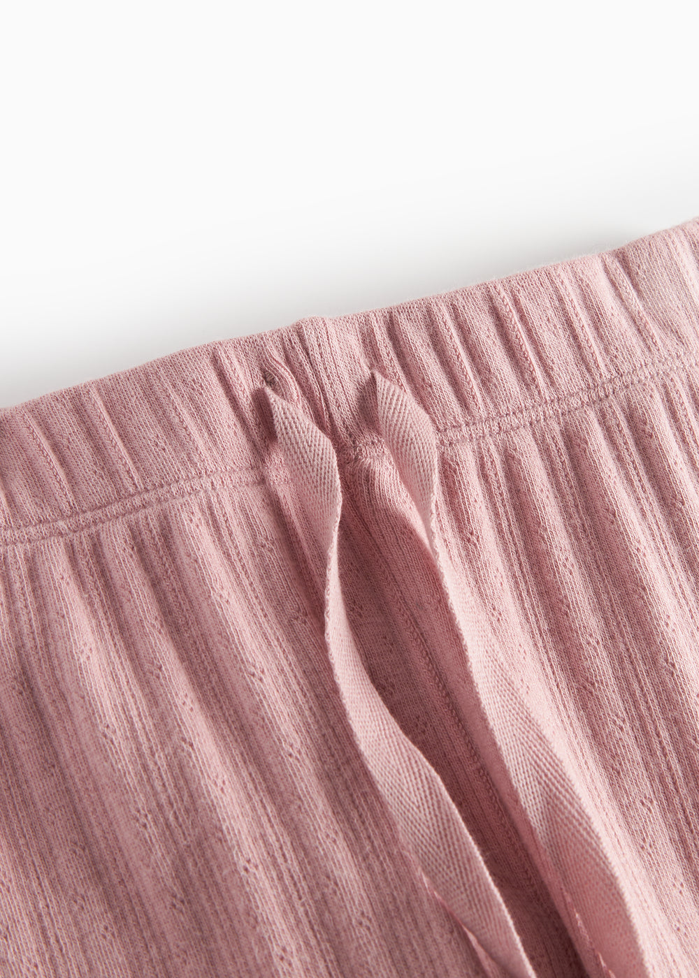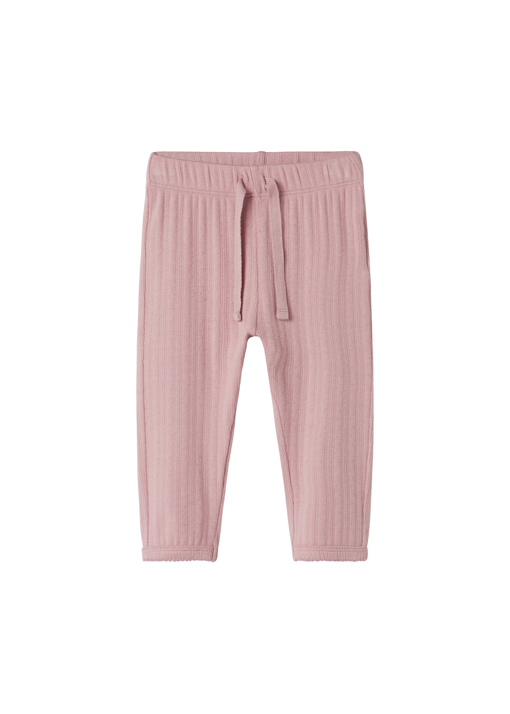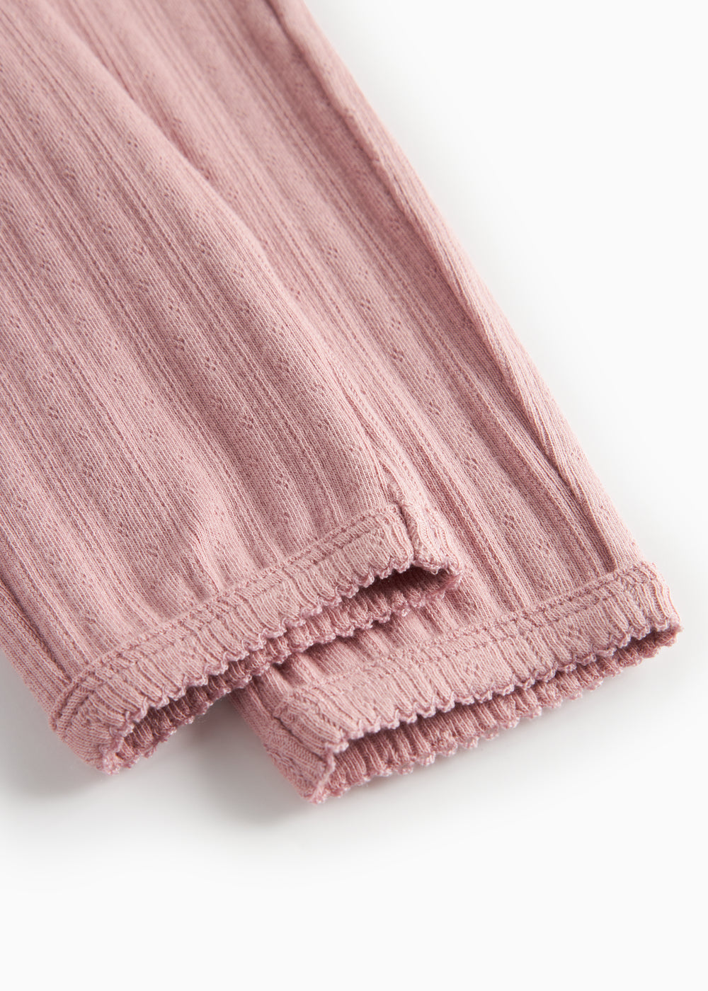 Behagelige pointelle baby bukser med elastik og et pyntebånd i livet. Bukserne er bløde, strækbare og behagelige at have på.