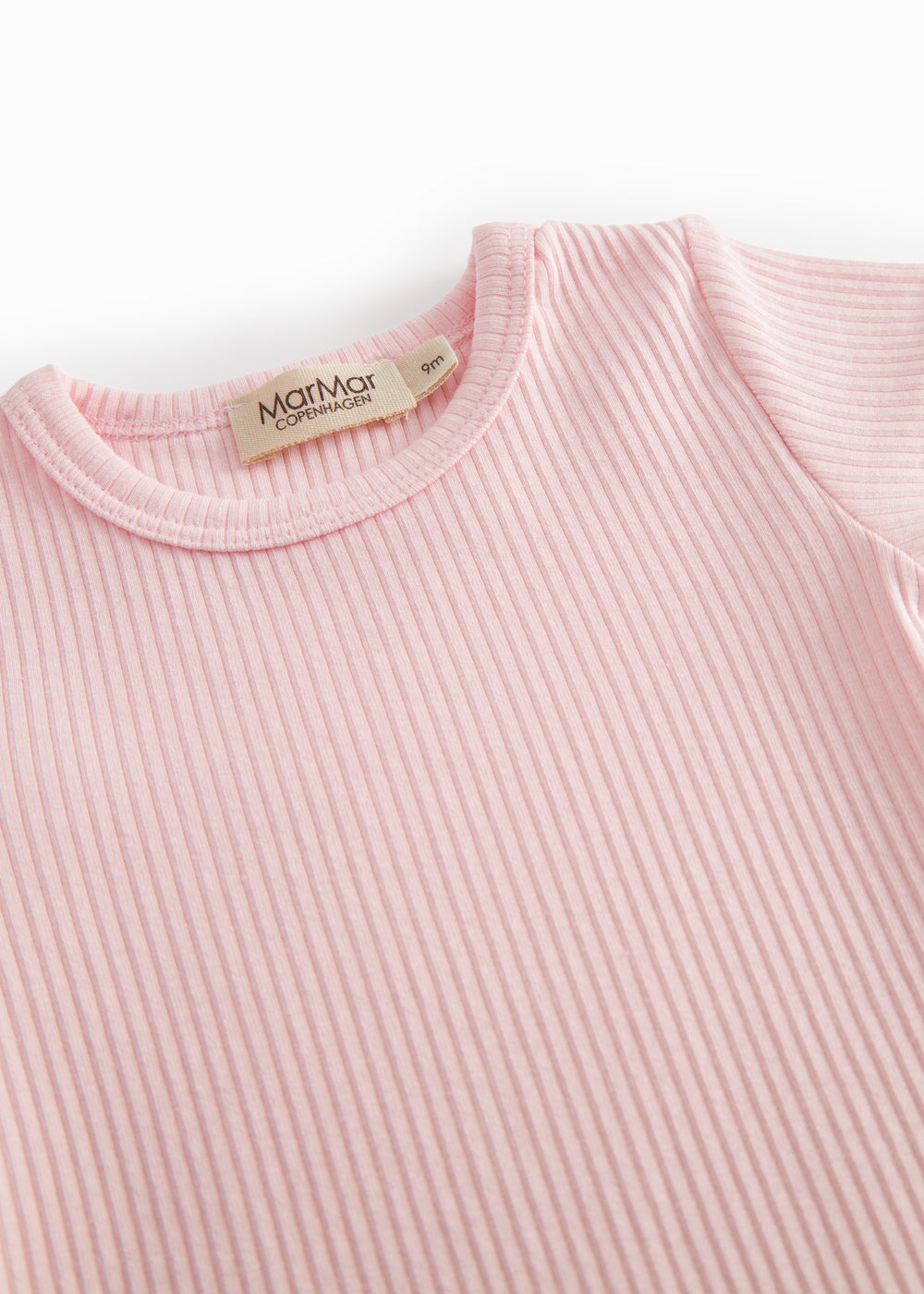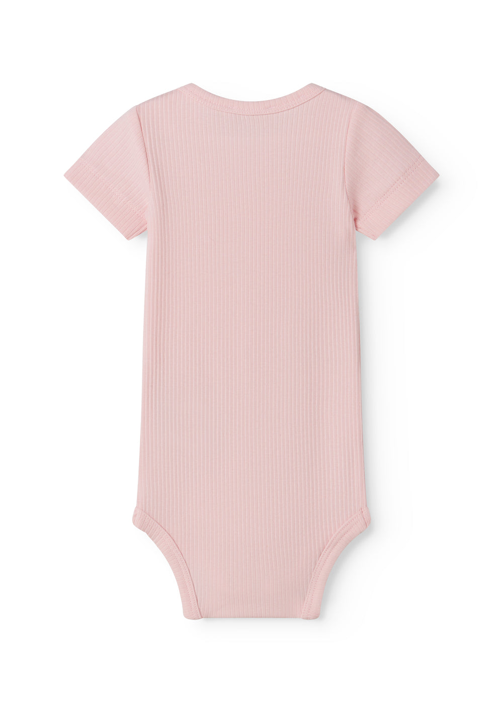 Enkel kortærmet modal bodystocking, der bliver lukket med trykknapper mellem benene for nem bleskiftning. Bodystockingen er ribstrikket, blød, holder form og farve og har elastan i sig som gør den strækbar og behagelig at have på.